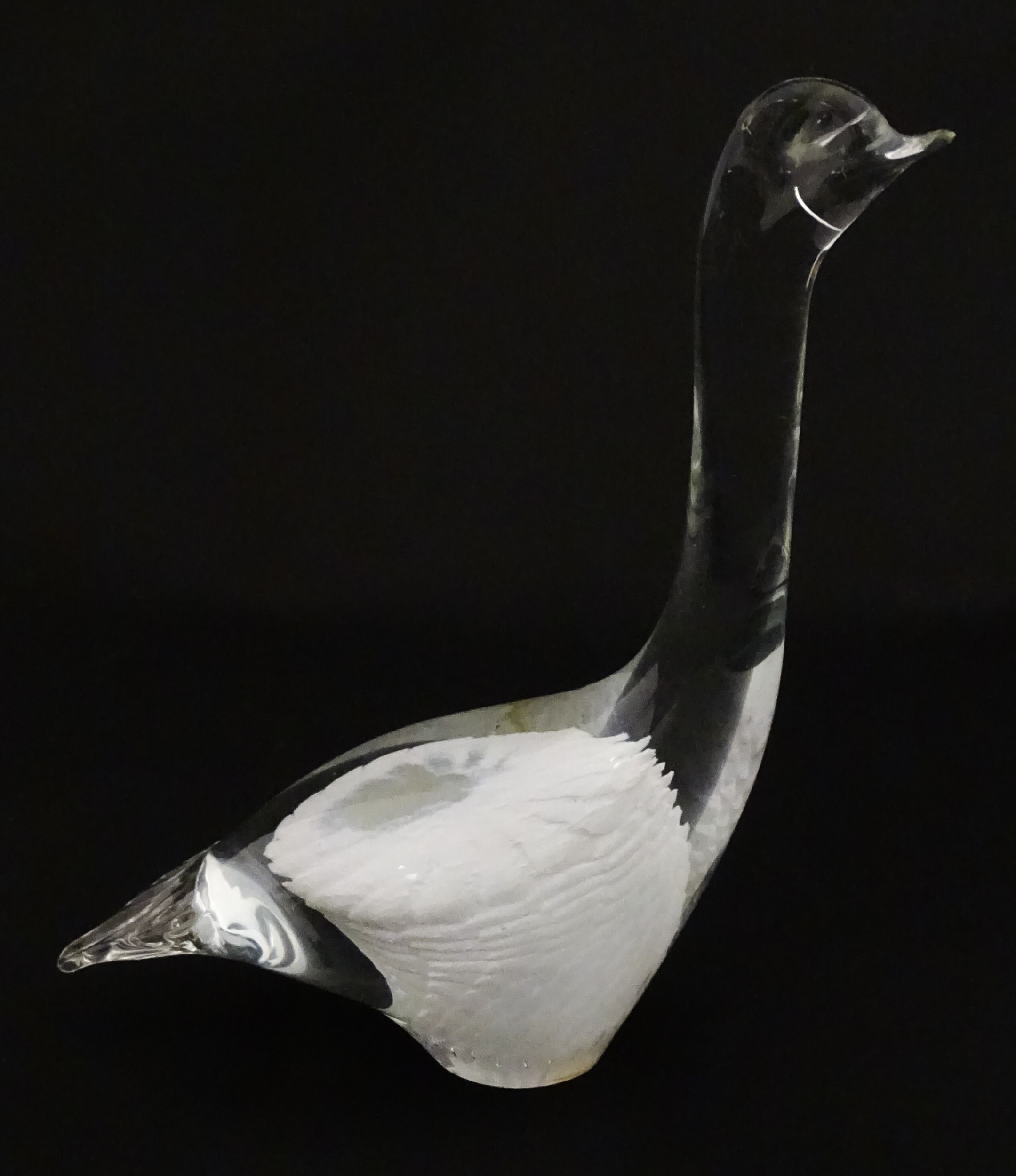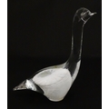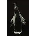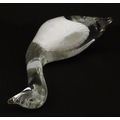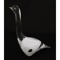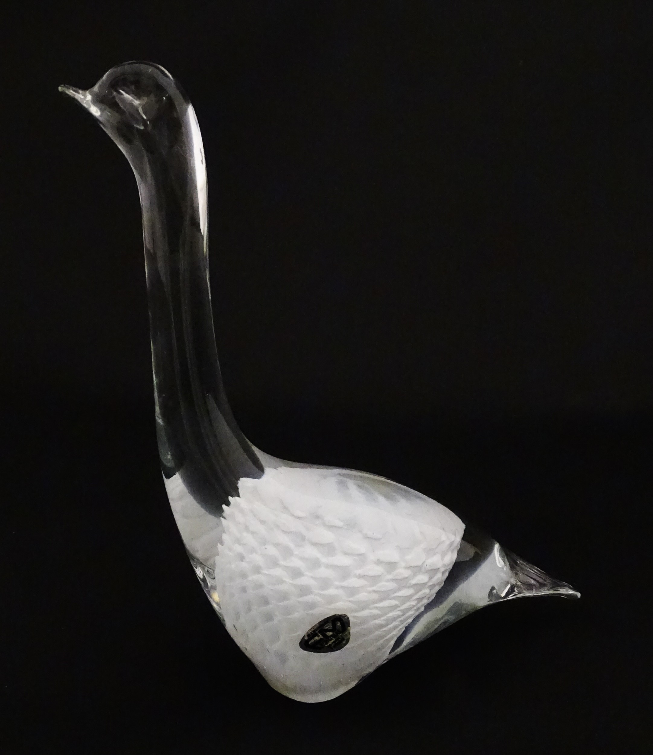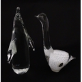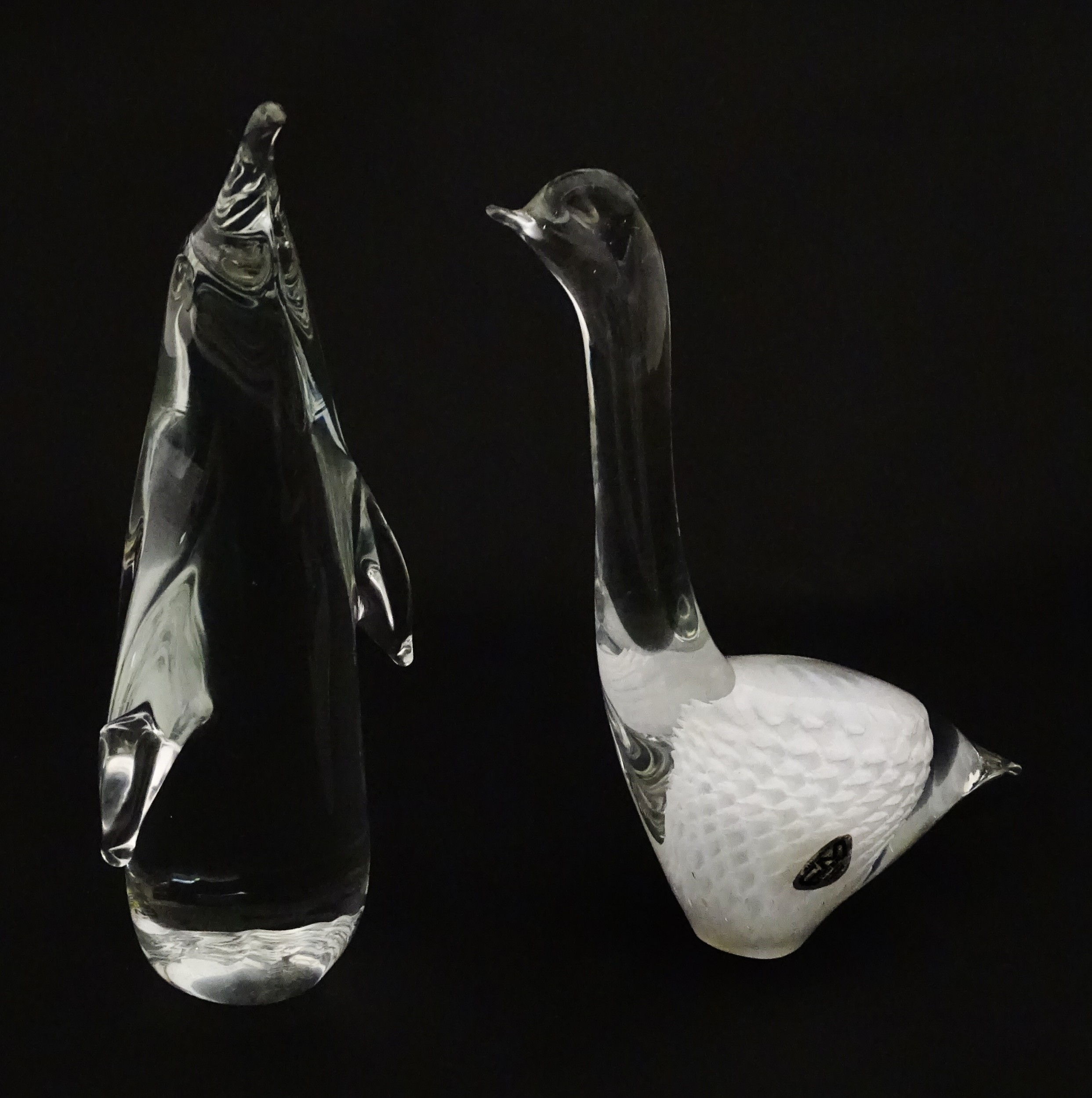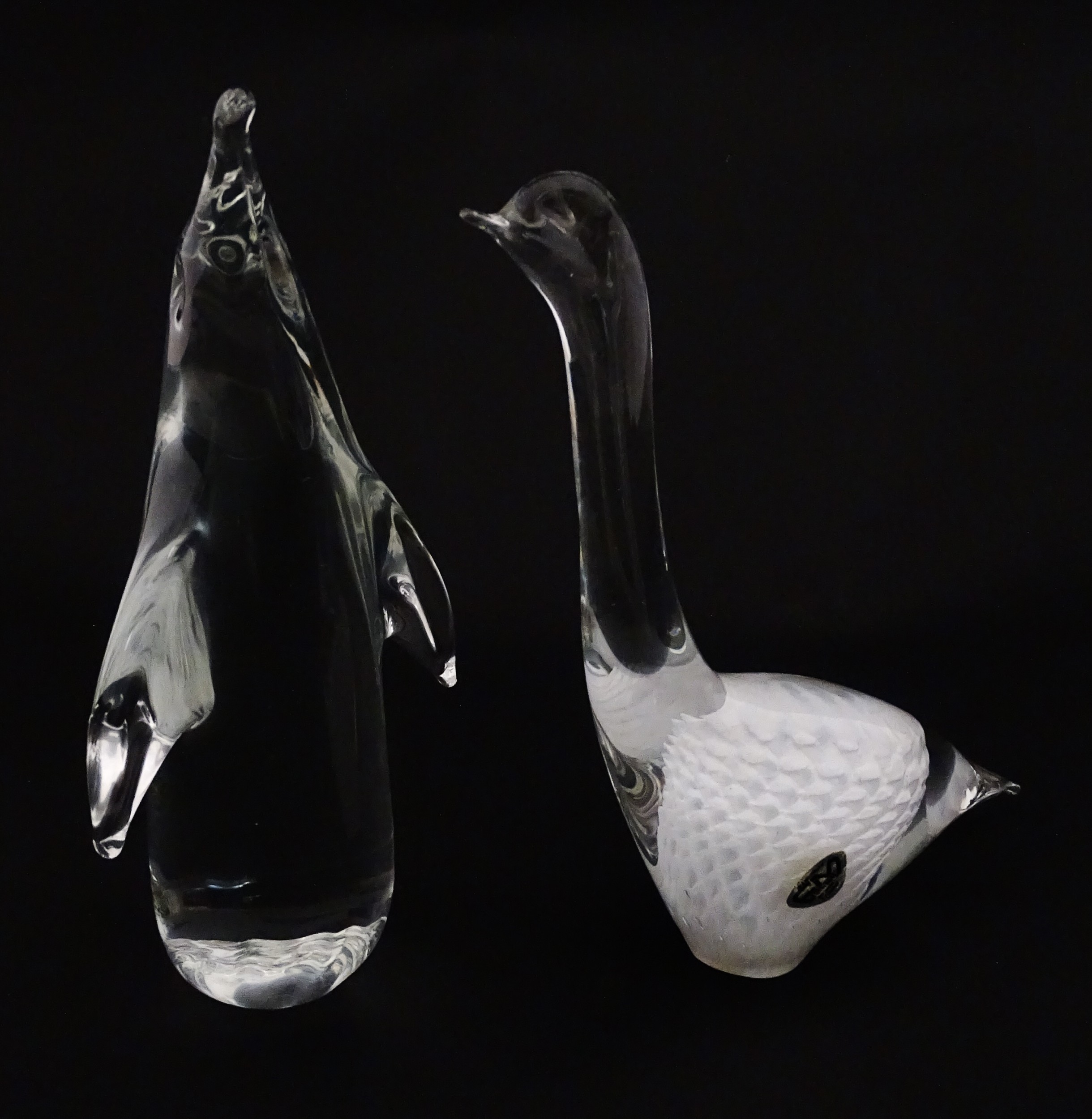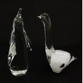 Two Swedish art glass figures / paperweights, one formed as a penguin and signed under FM Ronneby Sweden B.715-17. The other formed as a swan and signed FM Ronneby Sweden B.39-190. the tallest approx 8" high (2)