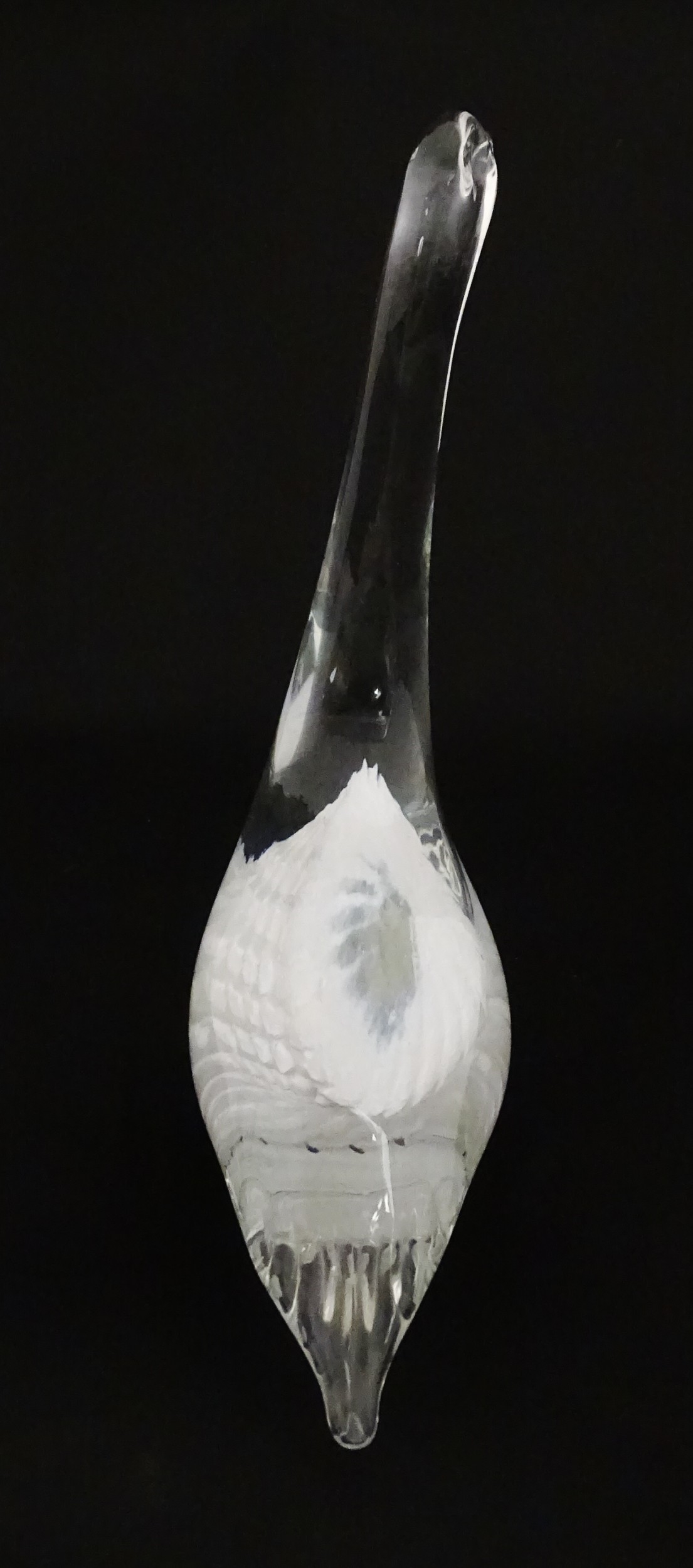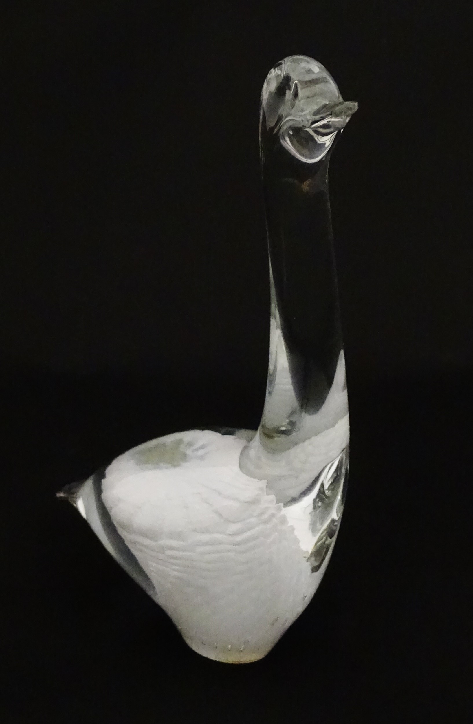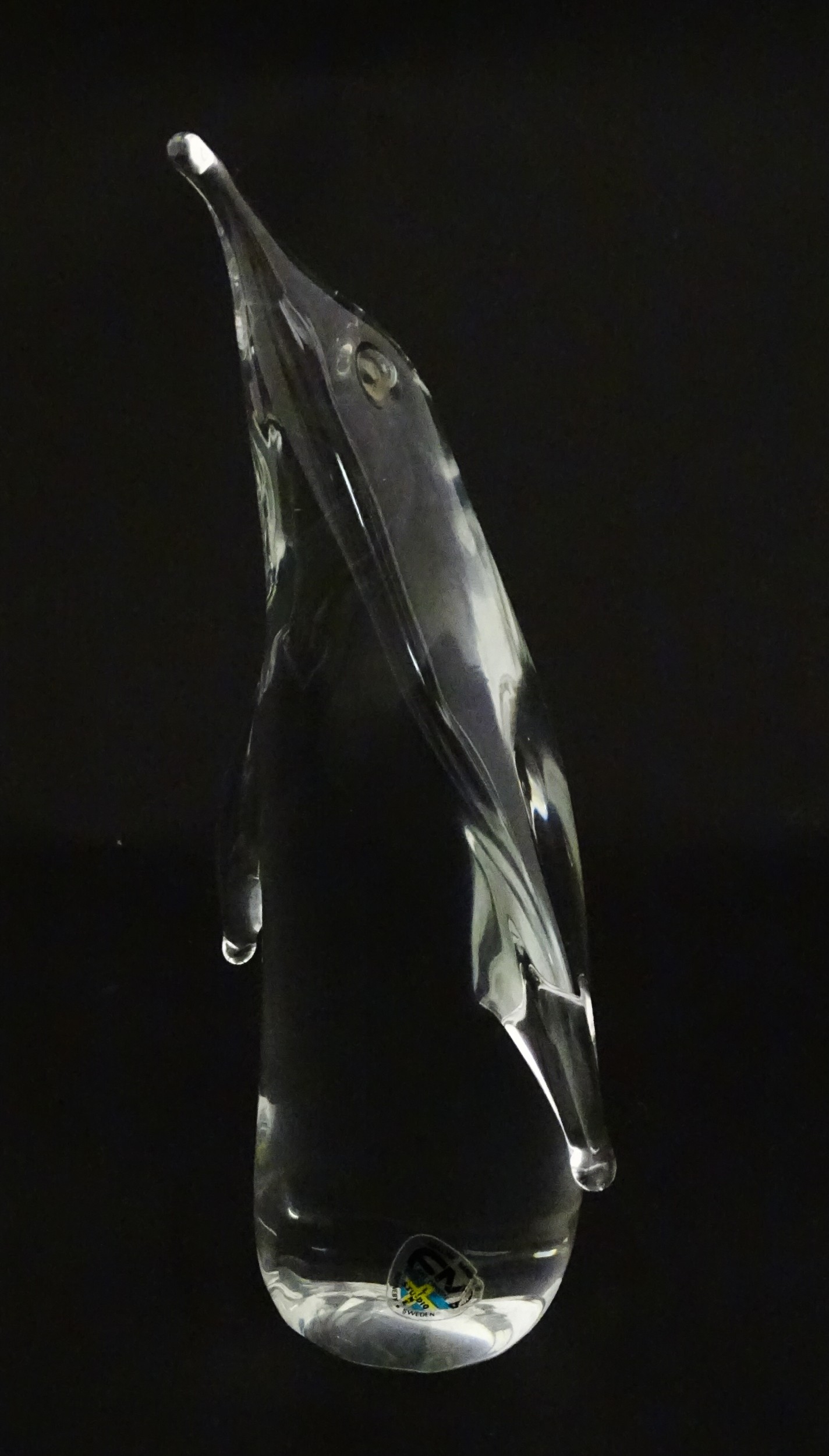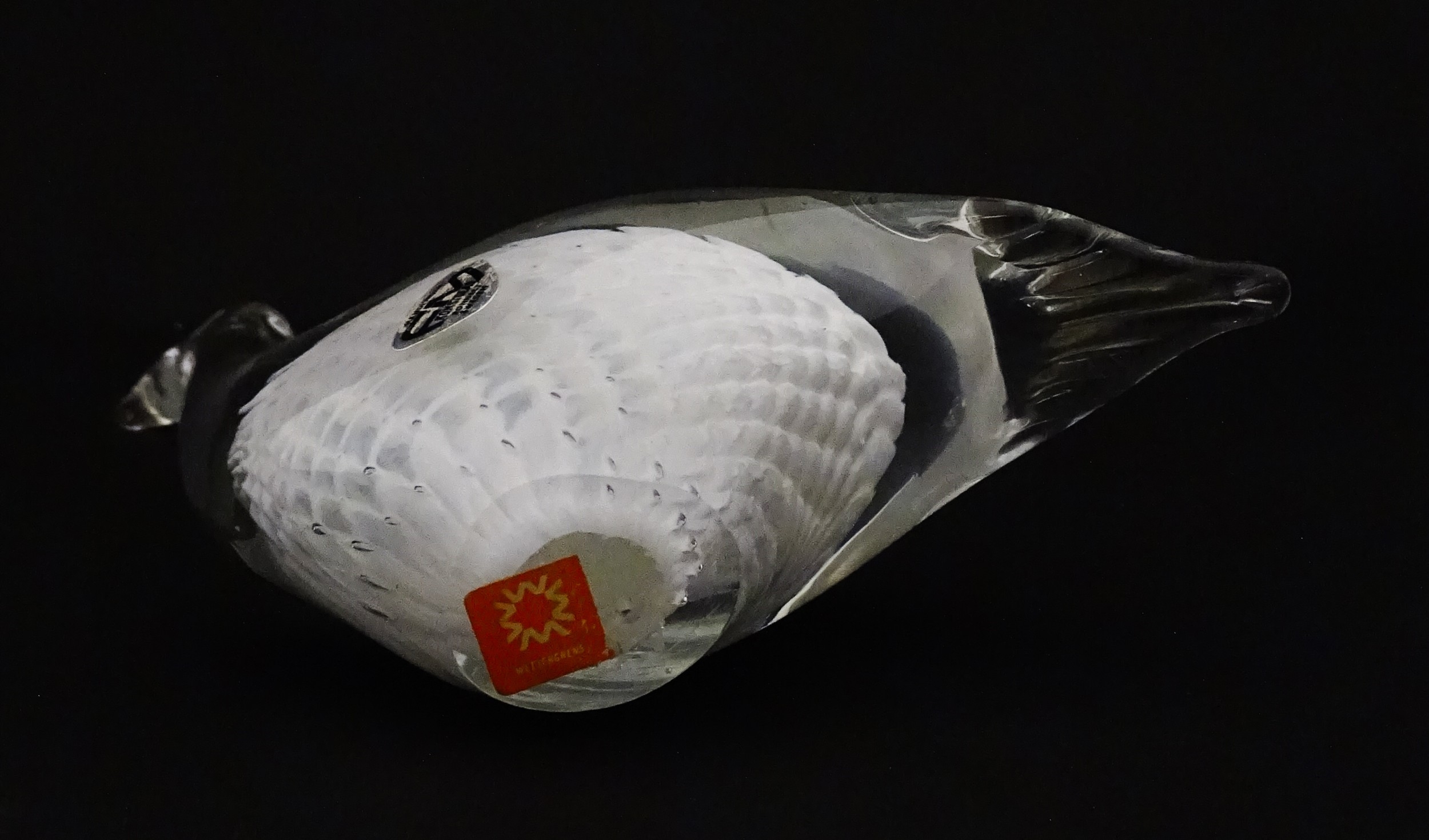 Two Swedish art glass figures / paperweights, one formed as a penguin and signed under FM Ronneby Sweden B.715-17. The other formed as a swan and signed FM Ronneby Sweden B.39-190. the tallest approx 8" high (2)
