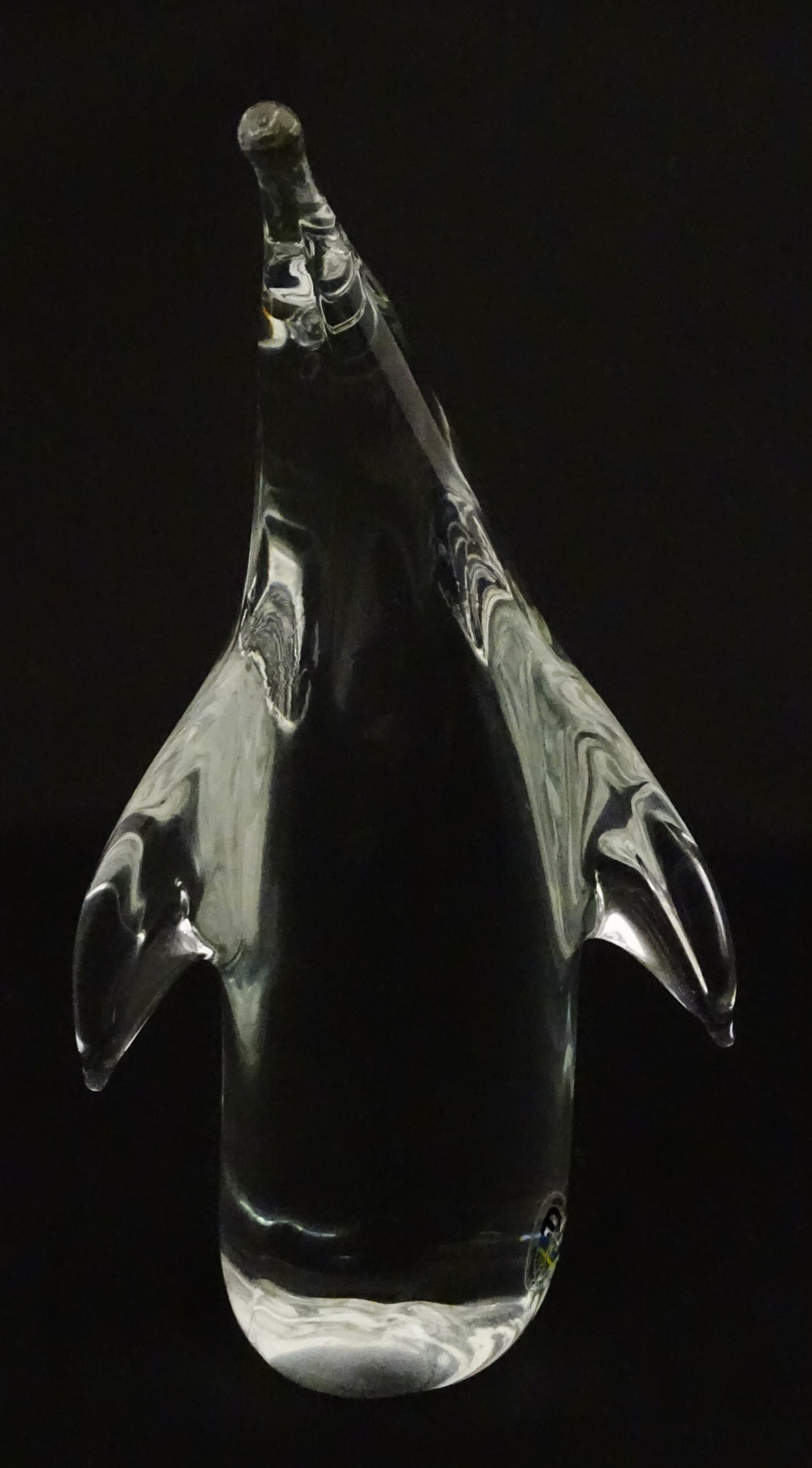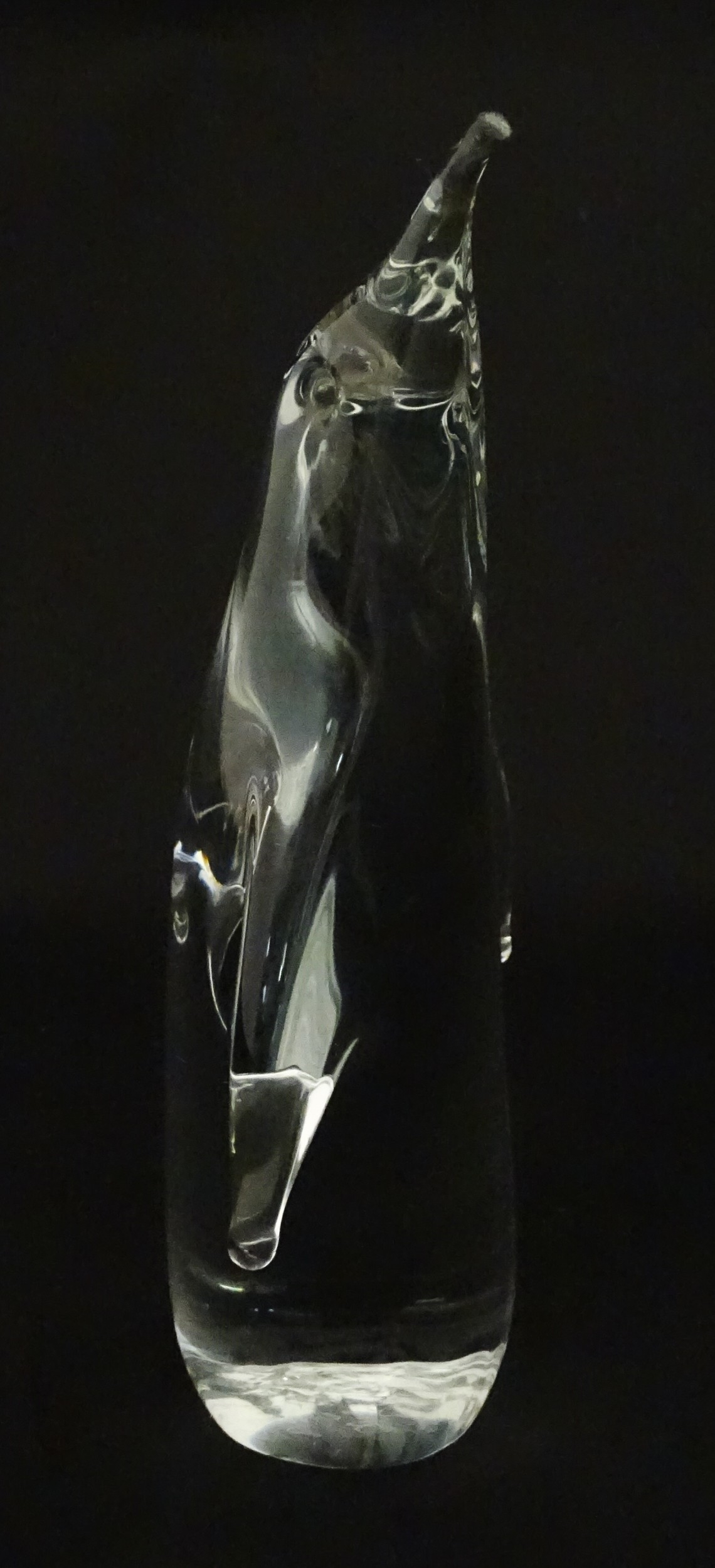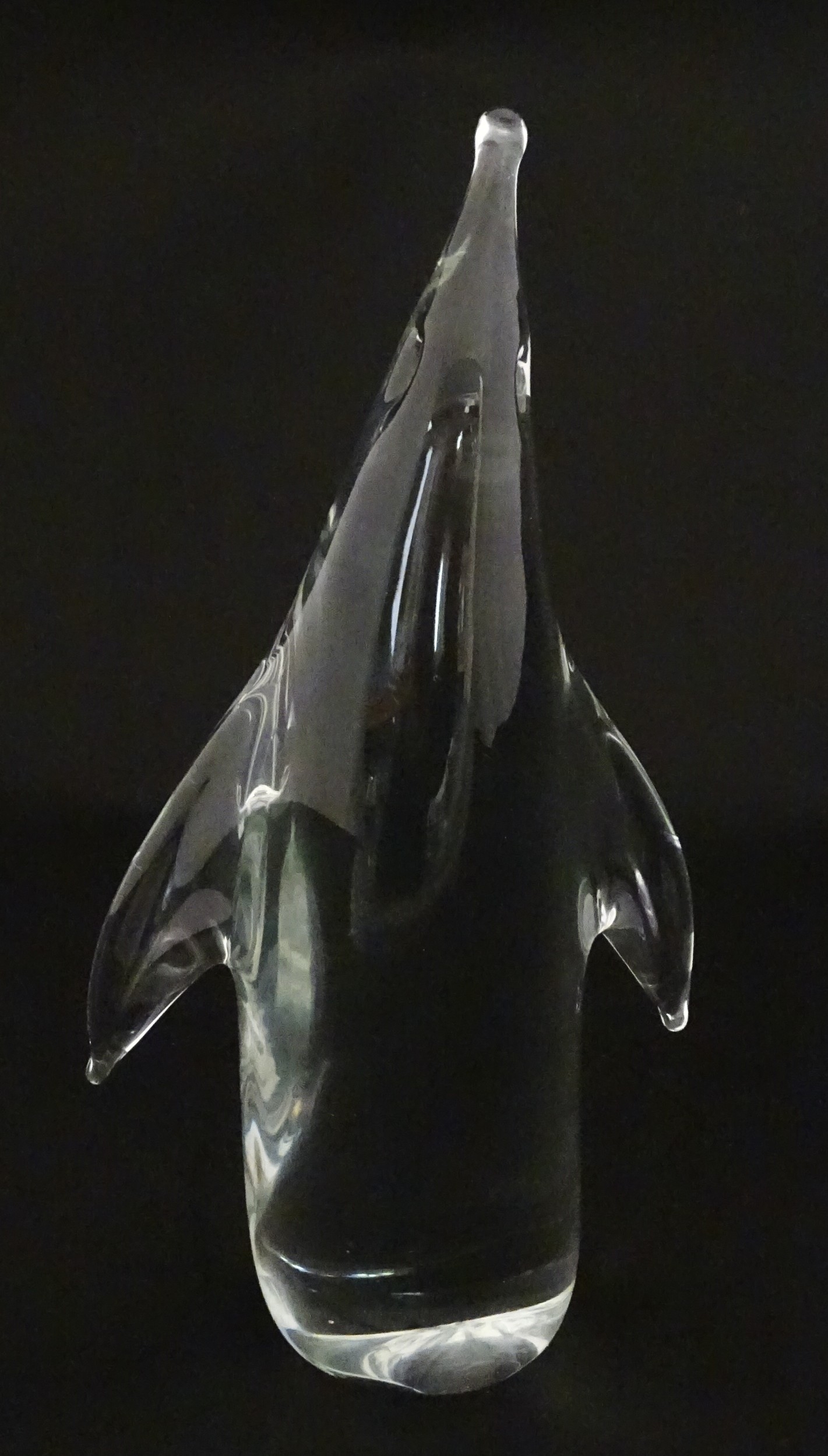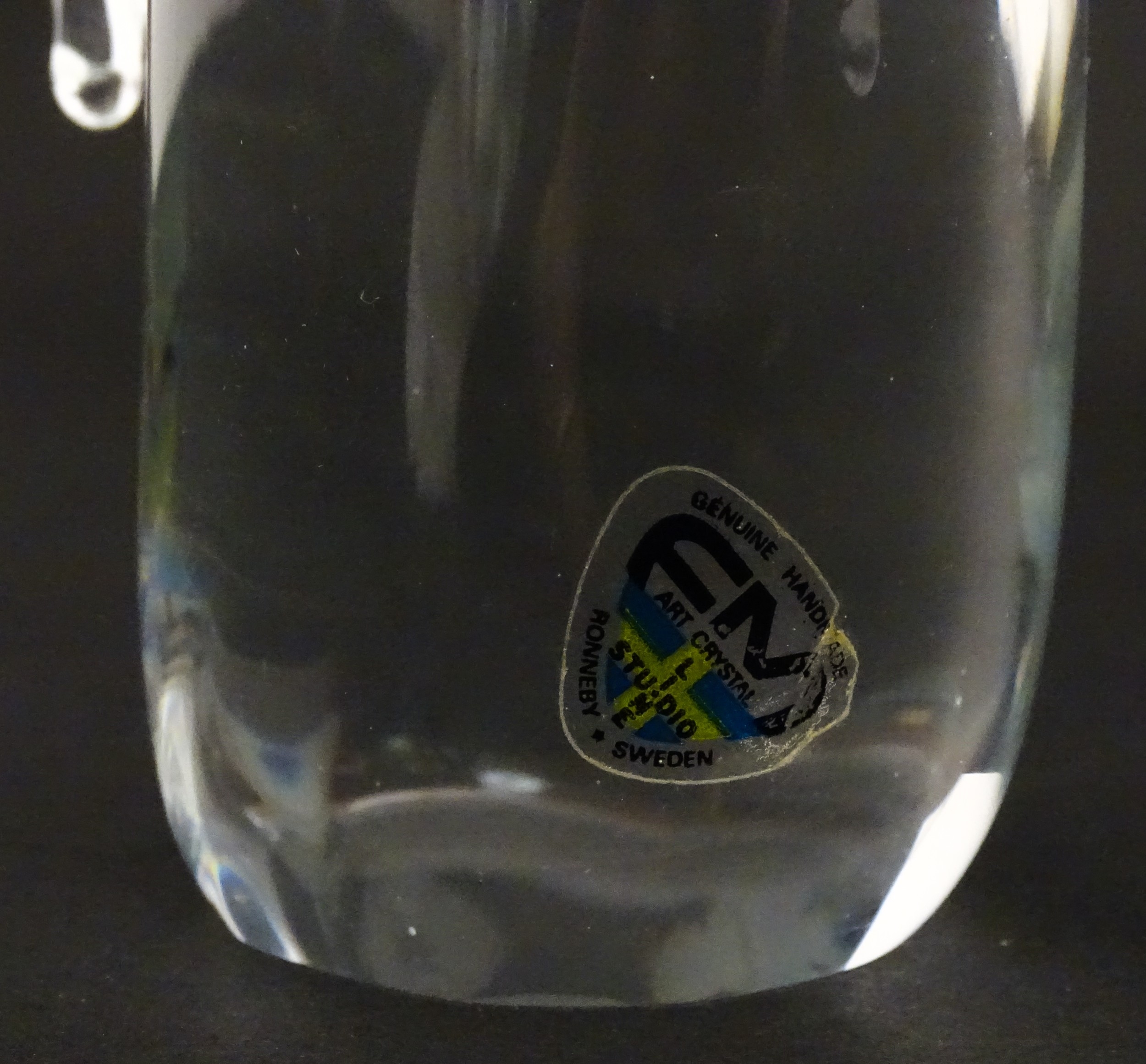 Two Swedish art glass figures / paperweights, one formed as a penguin and signed under FM Ronneby Sweden B.715-17. The other formed as a swan and signed FM Ronneby Sweden B.39-190. the tallest approx 8" high (2)