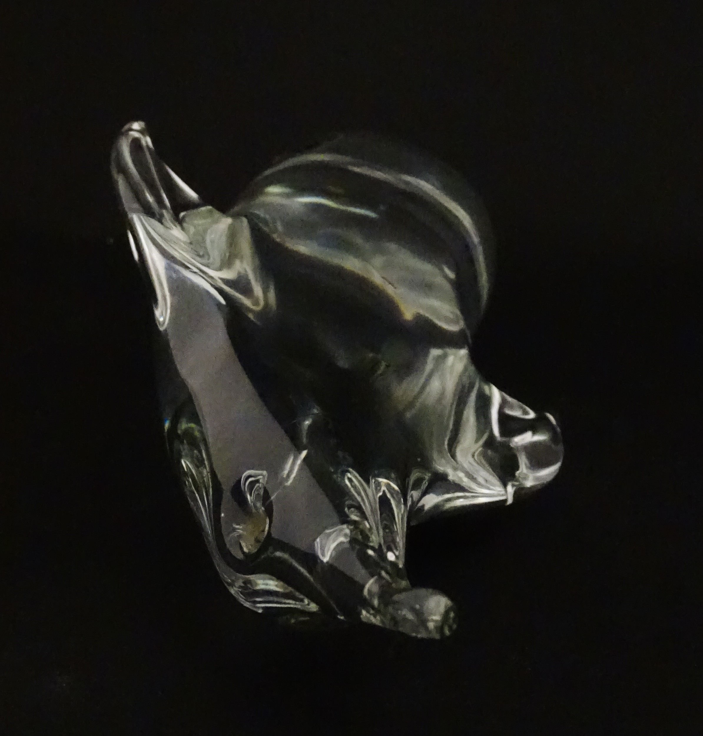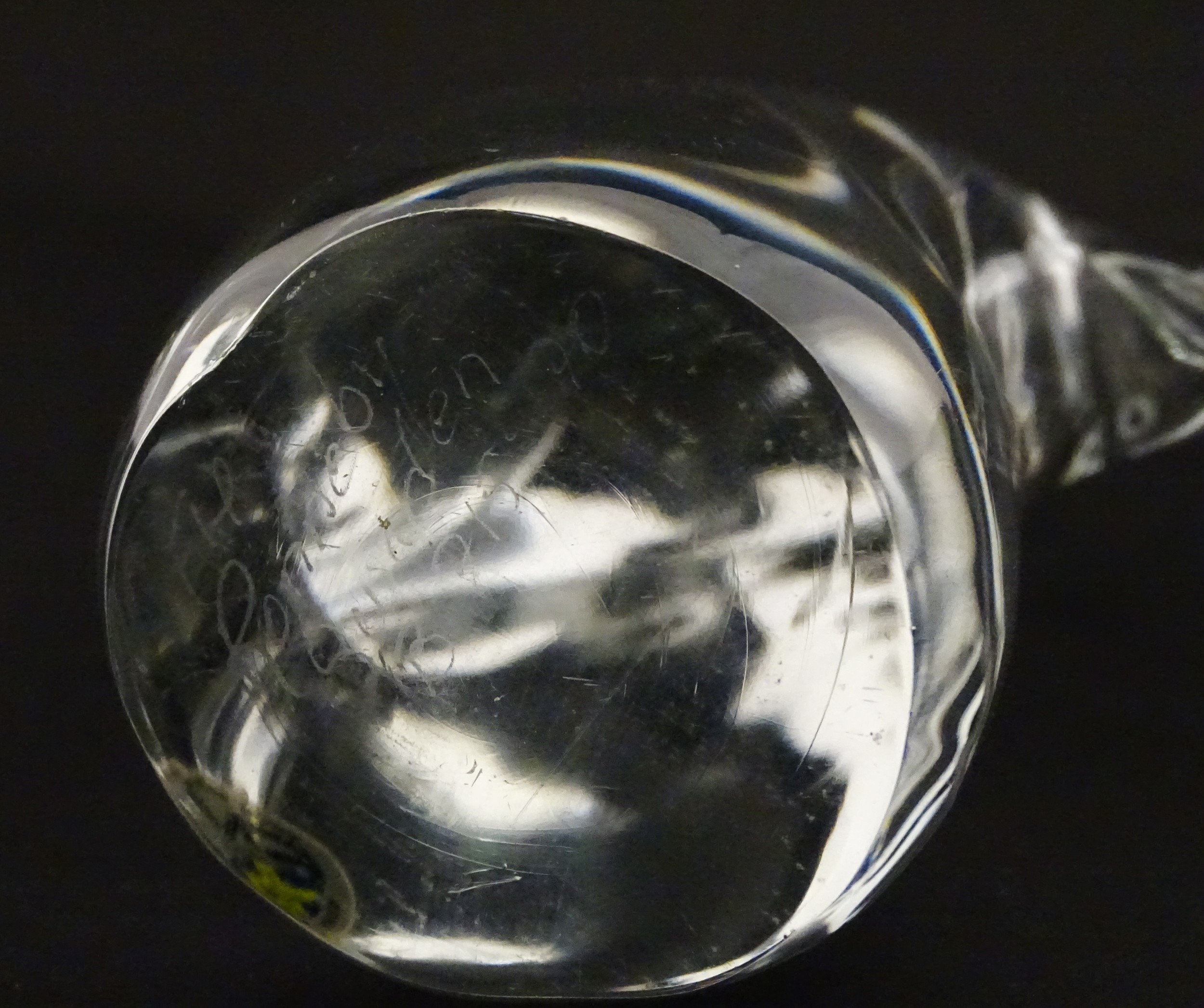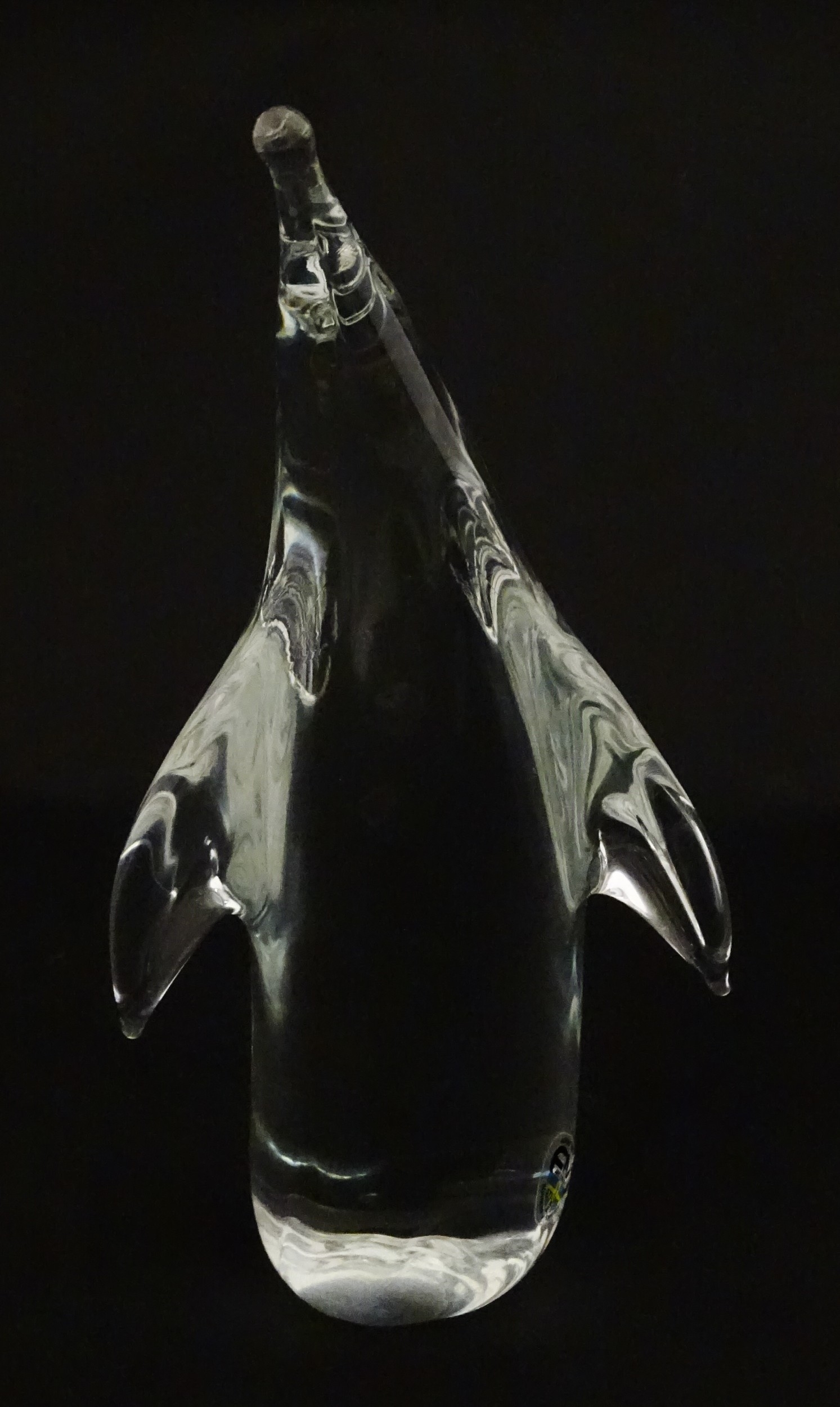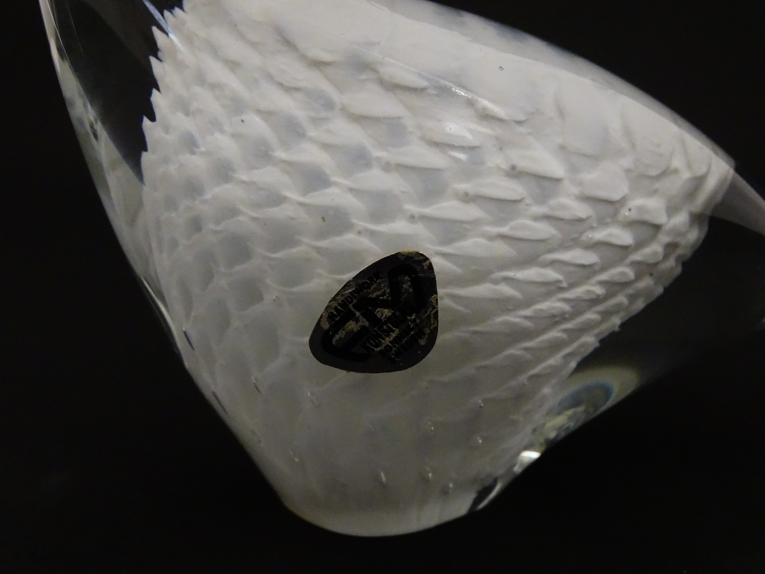 Two Swedish art glass figures / paperweights, one formed as a penguin and signed under FM Ronneby Sweden B.715-17. The other formed as a swan and signed FM Ronneby Sweden B.39-190. the tallest approx 8" high (2)