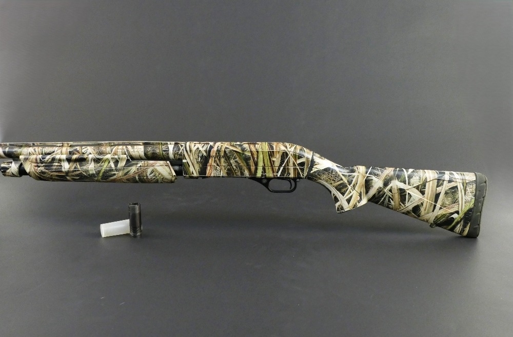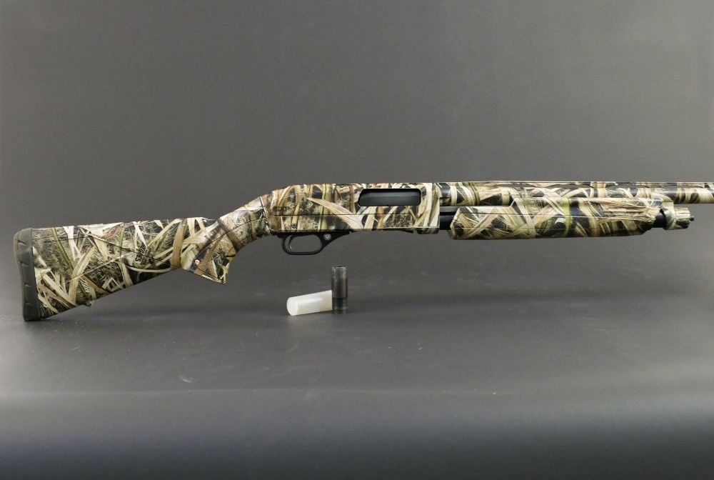 Winchester Super X pump action waterfowl 12 bore shotgun, with 29 1/2" multichoke barrel, comes with two chokes, 3 1/2" chamber and fitted with a fully camouflaged 13 1/2" lop synthetic stock. Serial No. 12AZV10368. SHOTGUN CERTIFICATE REQUIRED.