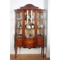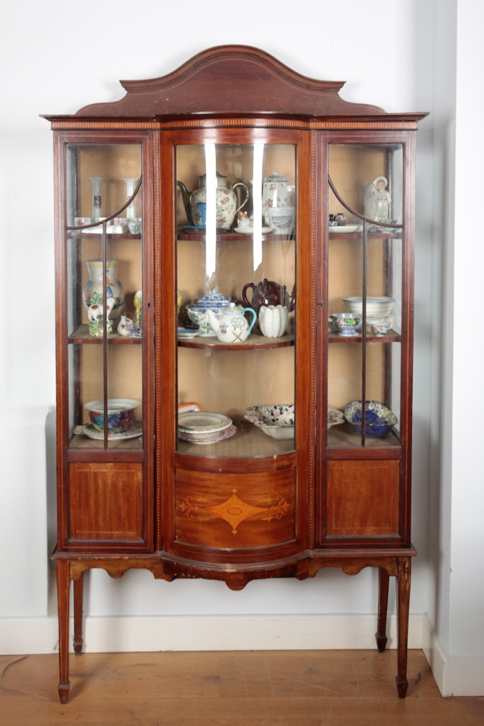 with ribbed circular body, 9cm high x 8.5cm diameter; together with a W.H. Goss porcelain 'Welsh Antiquities' teapot; a pair of Royal Worcester figures; and a collection of mixed 19th century and later ceramics, all contained in an Edwardian display cabinet, 200cm high x 113cm wide x 45cm deep