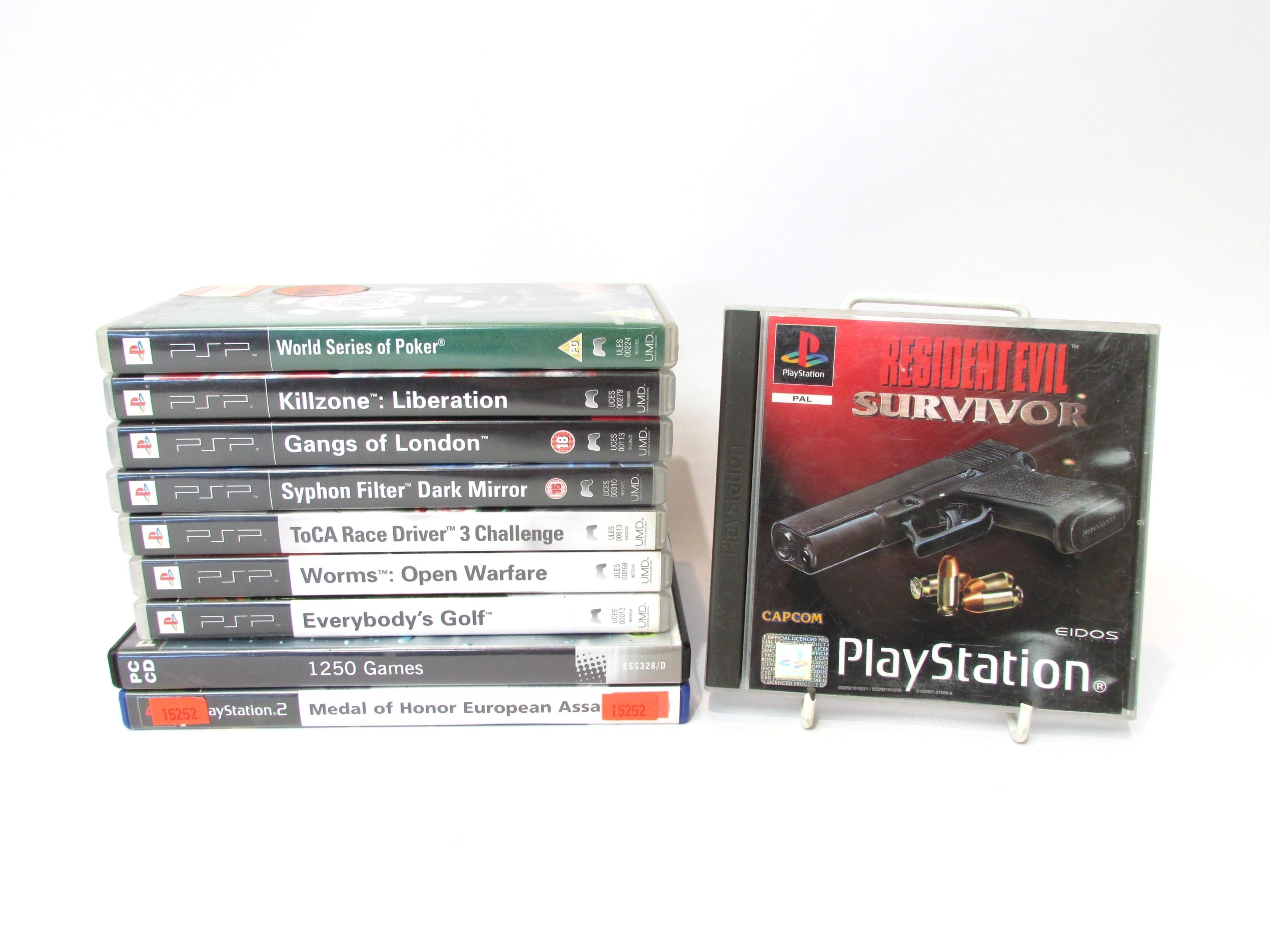 Sony PSP video games to include Killzone: Liberation, Gangs of London, Worms: Open Warfare, Everybody's Golf, Syphon Filter Dark Mirror, World Series of Poker, ToCA Race Driver 3 Challenge, the Playstation 1 (PS1) Resident Evil Survivor and the Playstation 2 (PS2) Medal of Honor European Assault, together with a PC Tom Clancy's Splinter Cell and CD-ROM '1250 Games' (11)