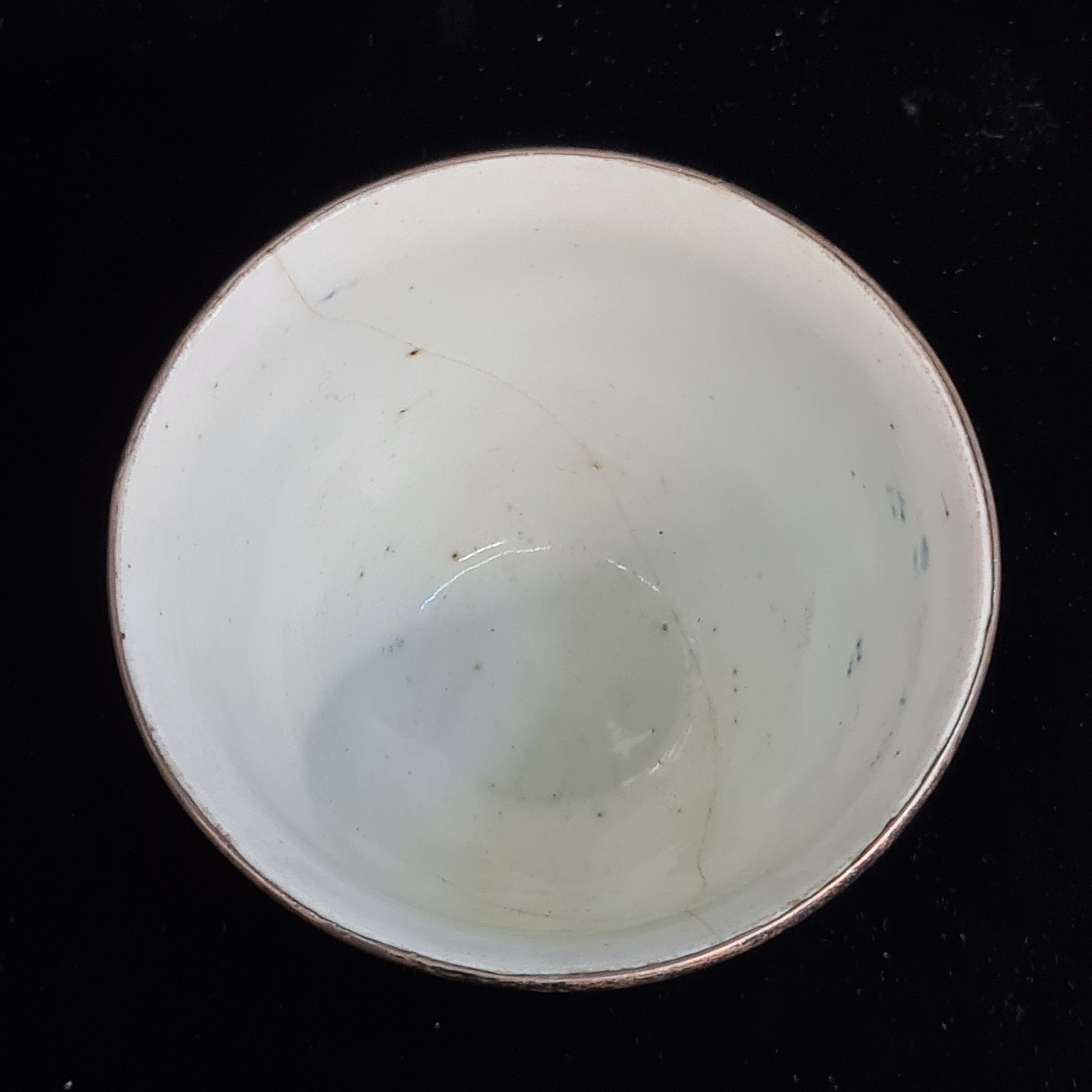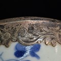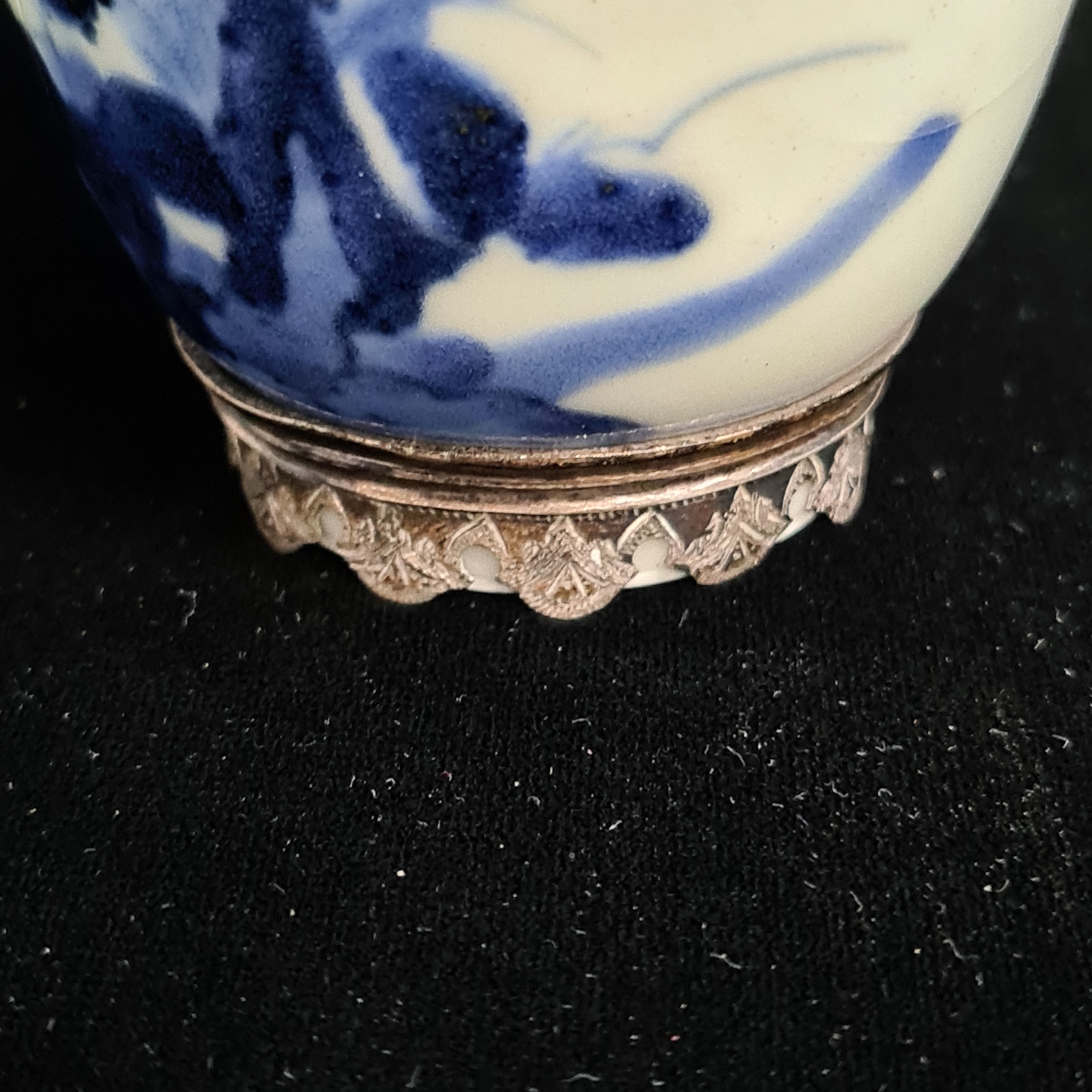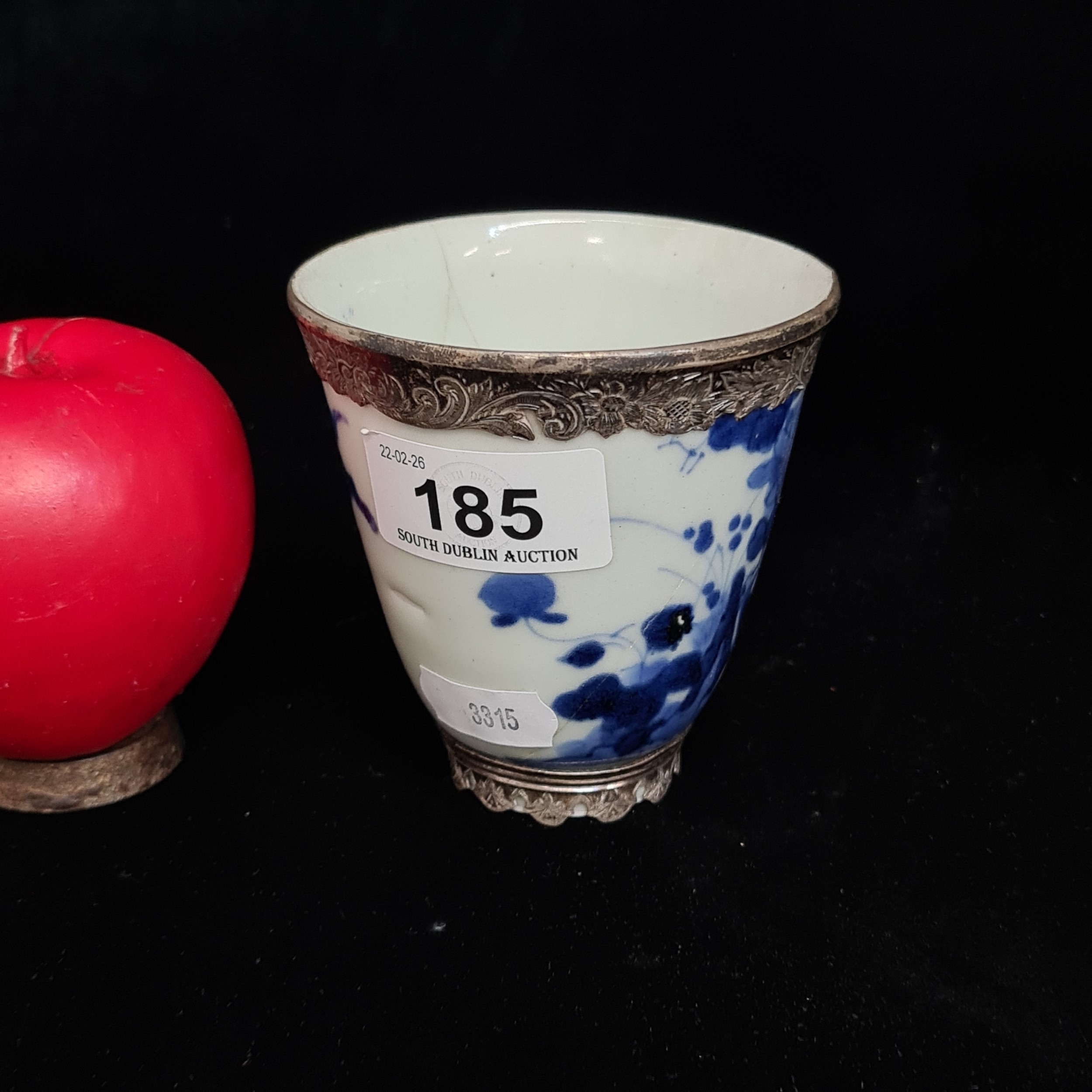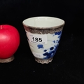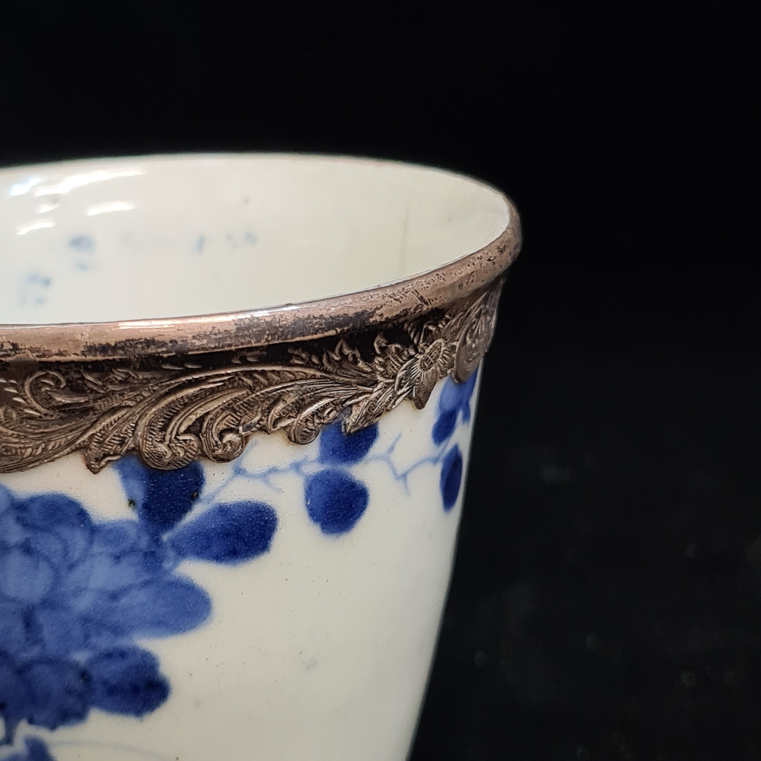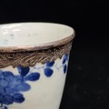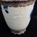 A beautiful antique porcelain cup decorated in a traditional hand painted blue and white colour pallet with floral illustrations. Features an elegant silver rim to both top and base. Hallmarked JC (Joseph Cole & Son) Birmingham. Has repair.