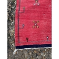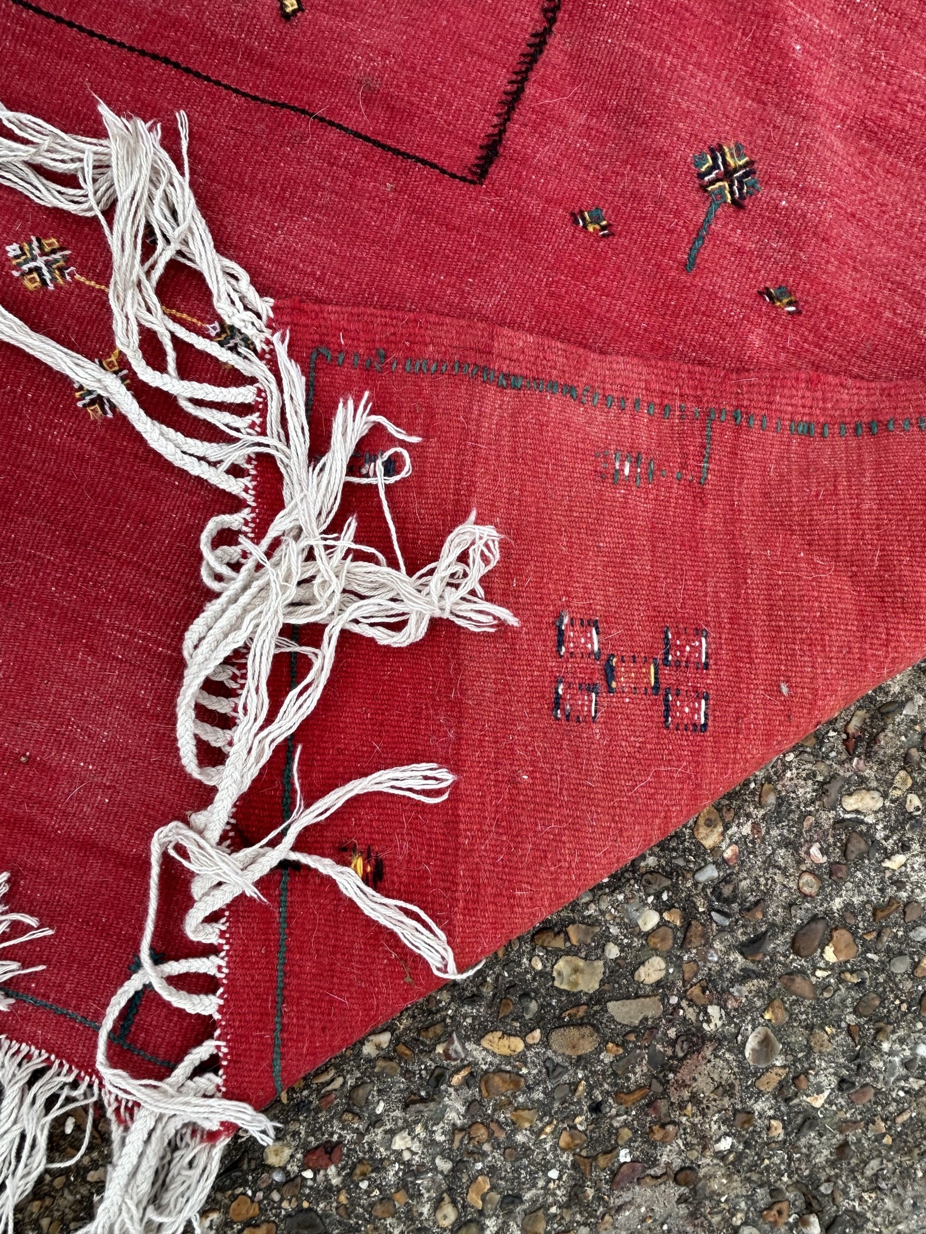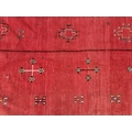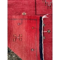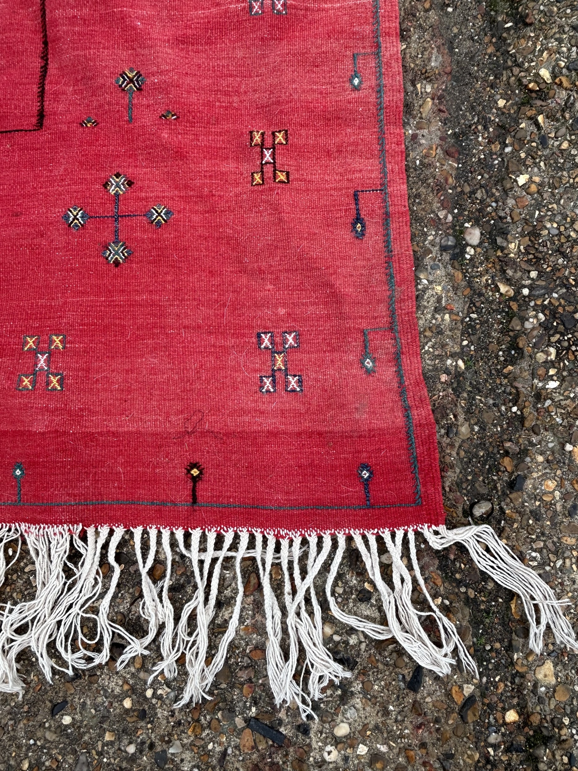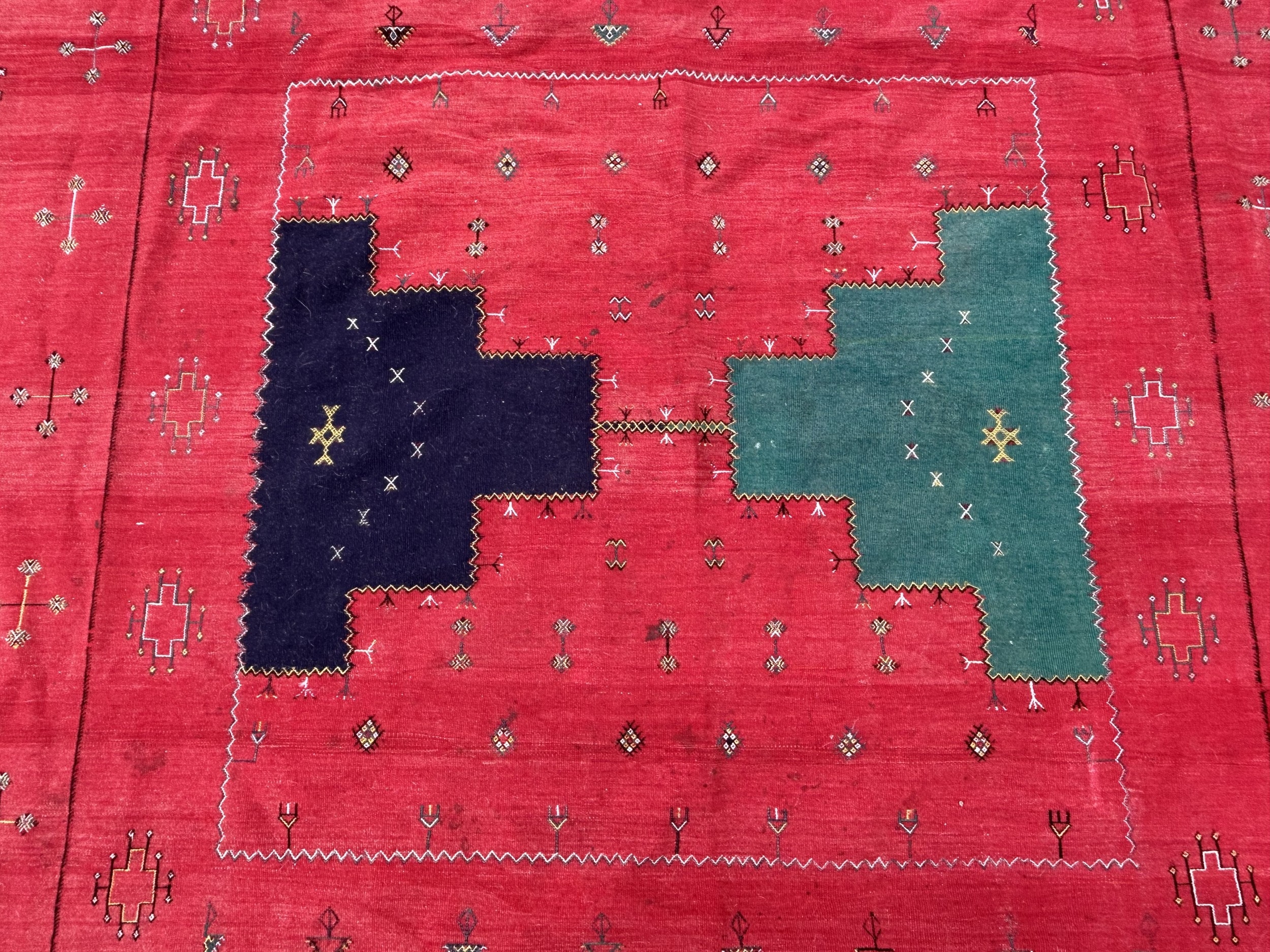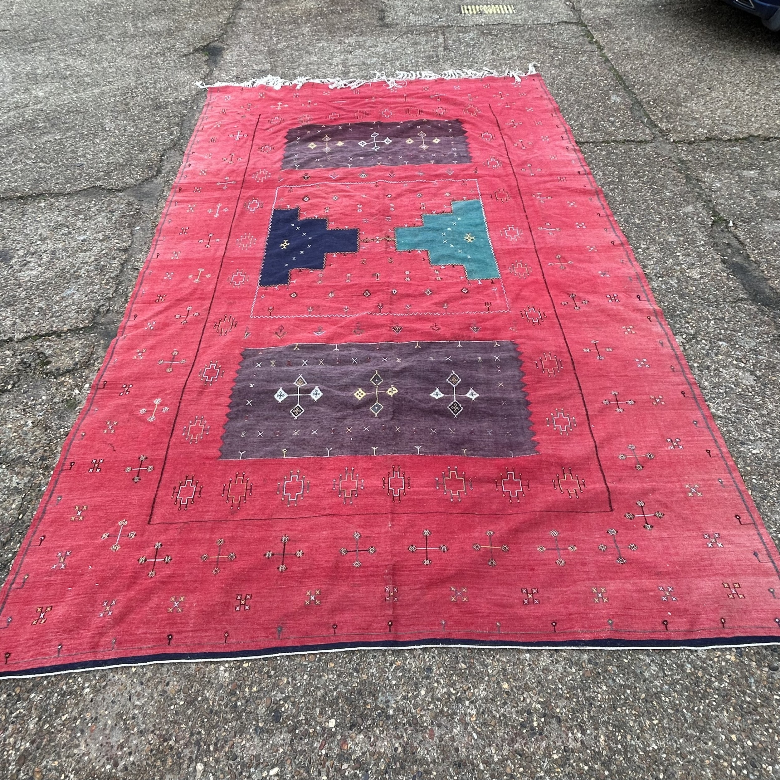 A red ground patterned floor rug with tassels to one end, approx. 8 ft x 13 ft (wear in places)