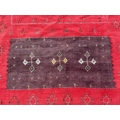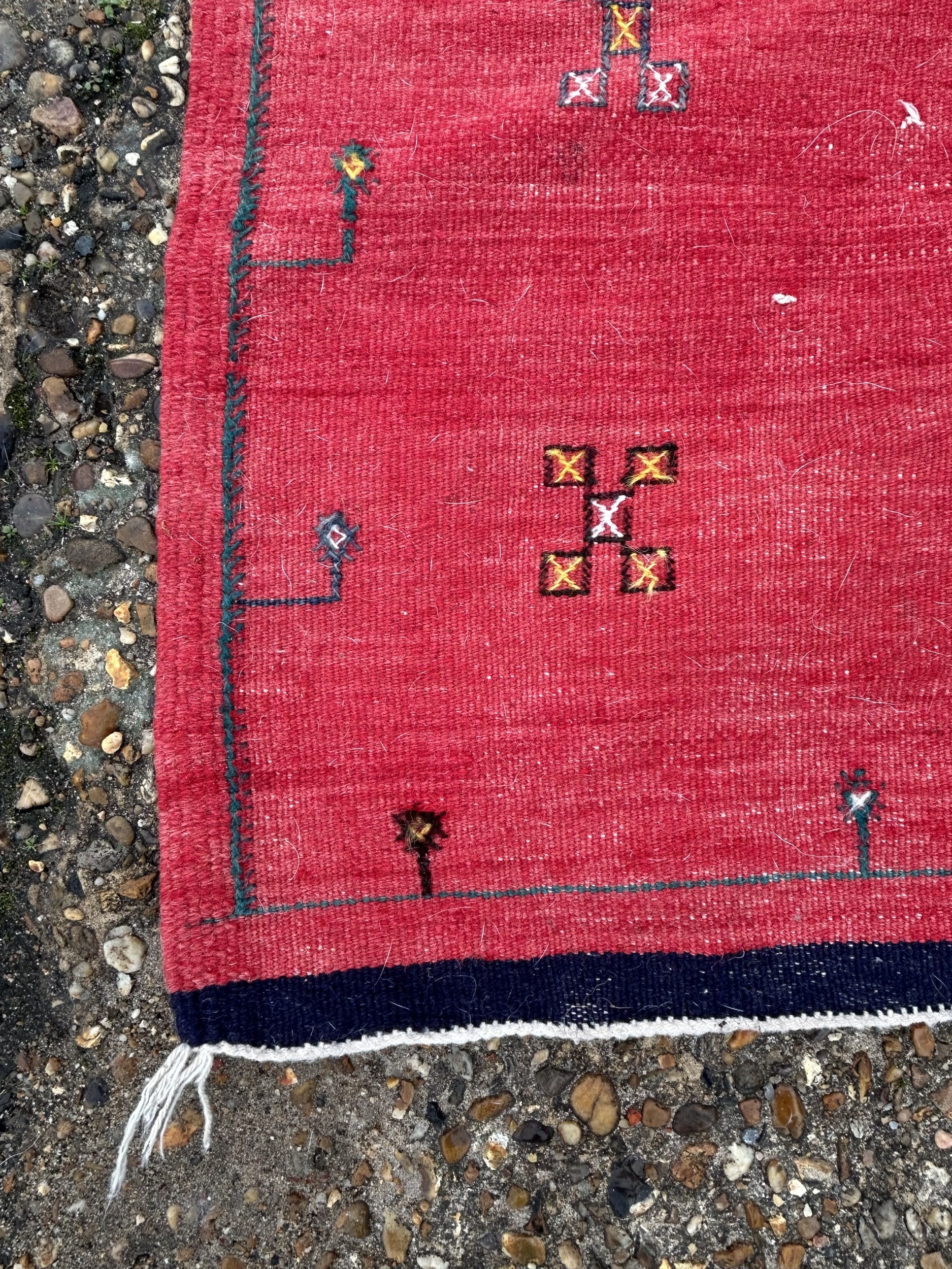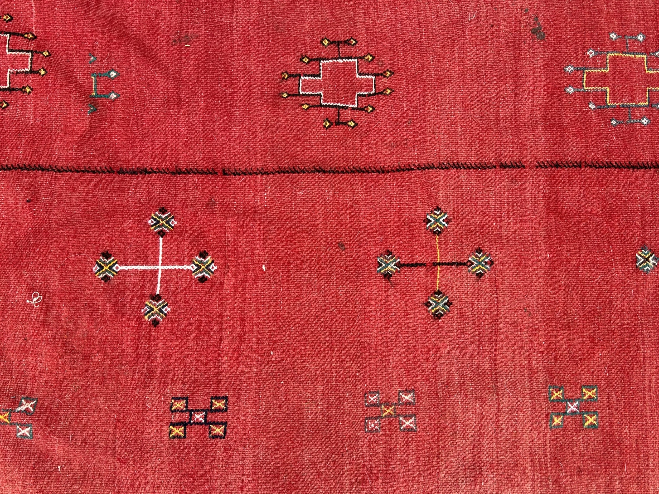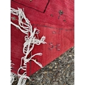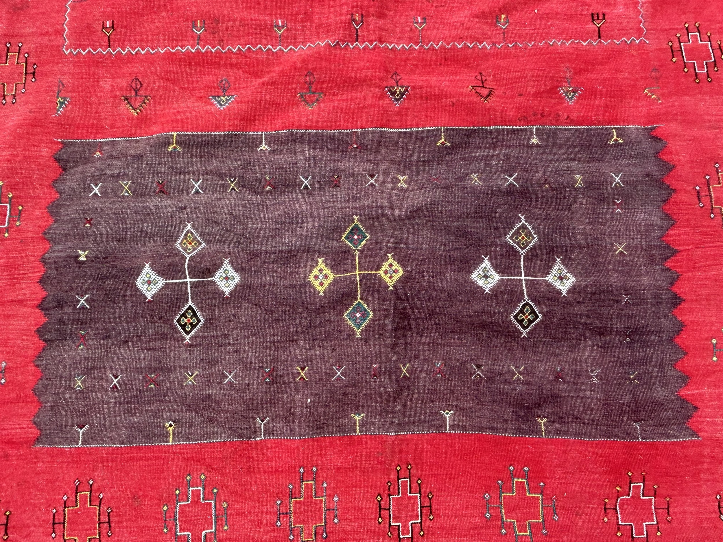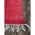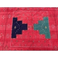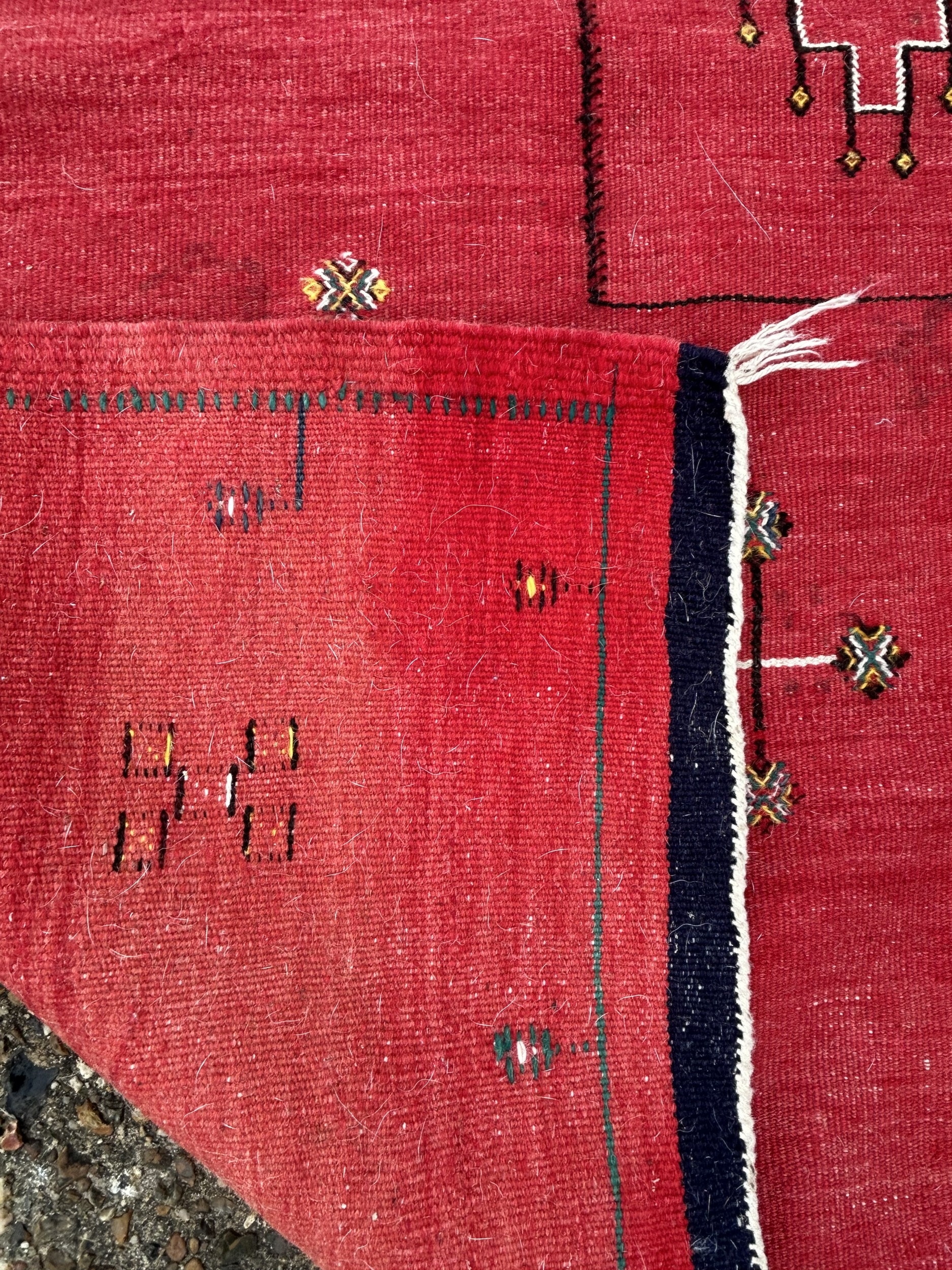 A red ground patterned floor rug with tassels to one end, approx. 8 ft x 13 ft (wear in places)