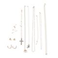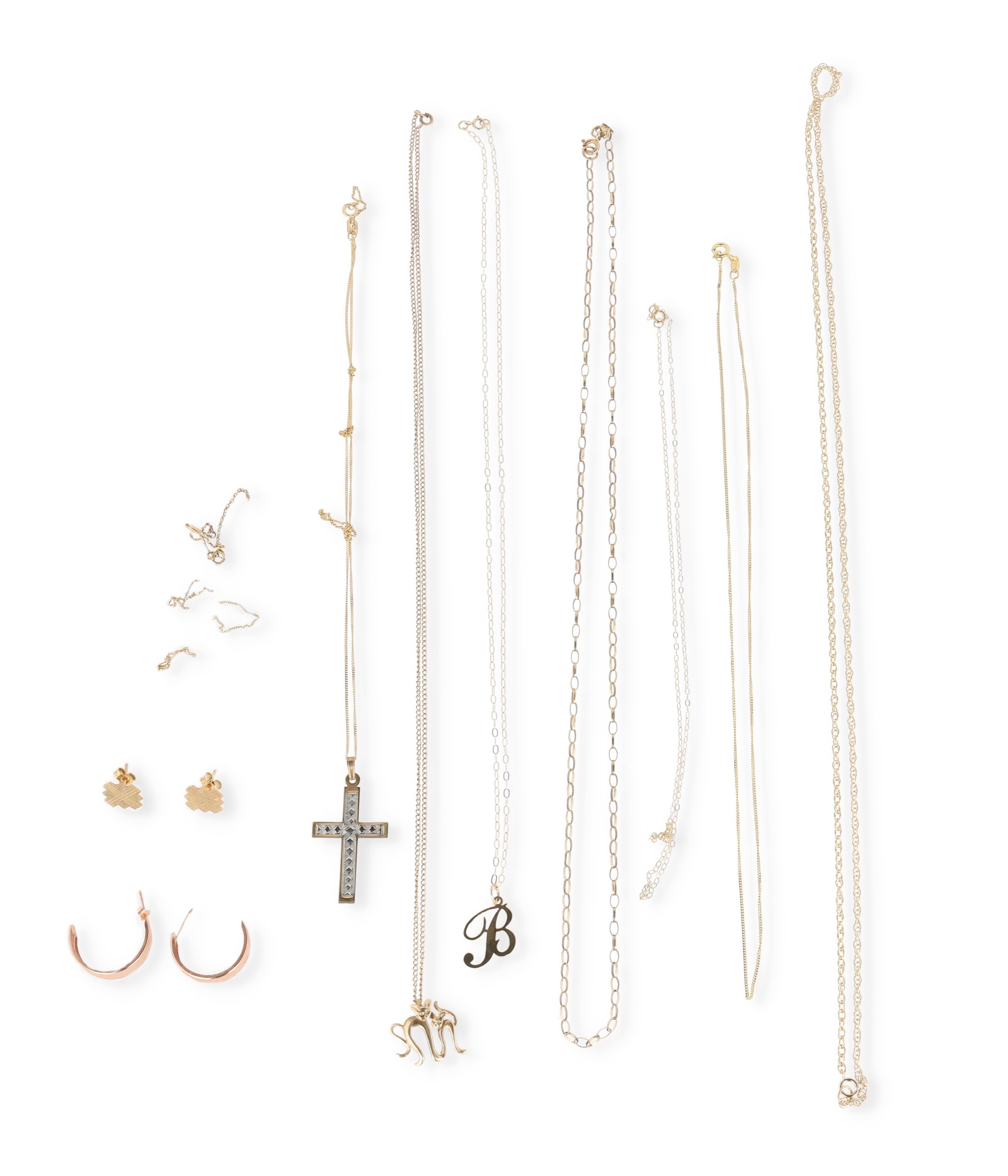 SEVEN 9CT GOLD NECK CHAINS OF VARYING DESIGN, THREE WITH PENDANTS, TOGETHER WITH TWO PAIRS OF 9CT GOLD EARRINGS, AND BROKEN GOLD NECK CHAINS