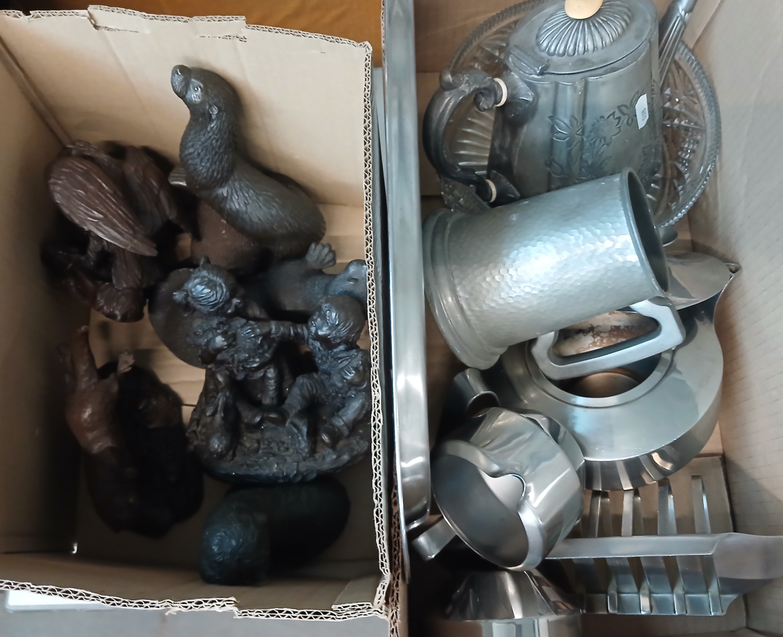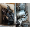 A box of metal ware including stainless and pewter, and a box of Heredities figures