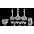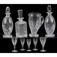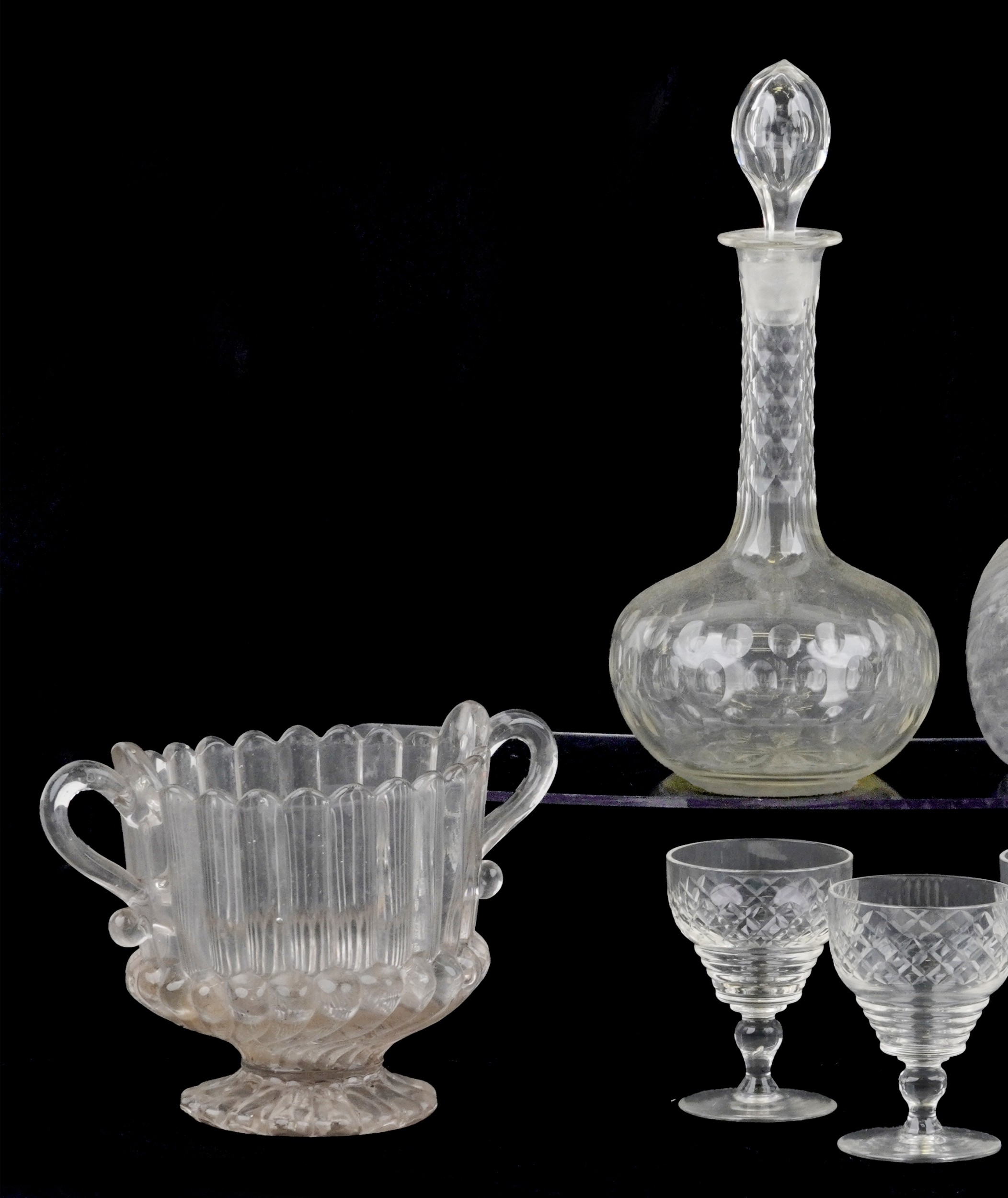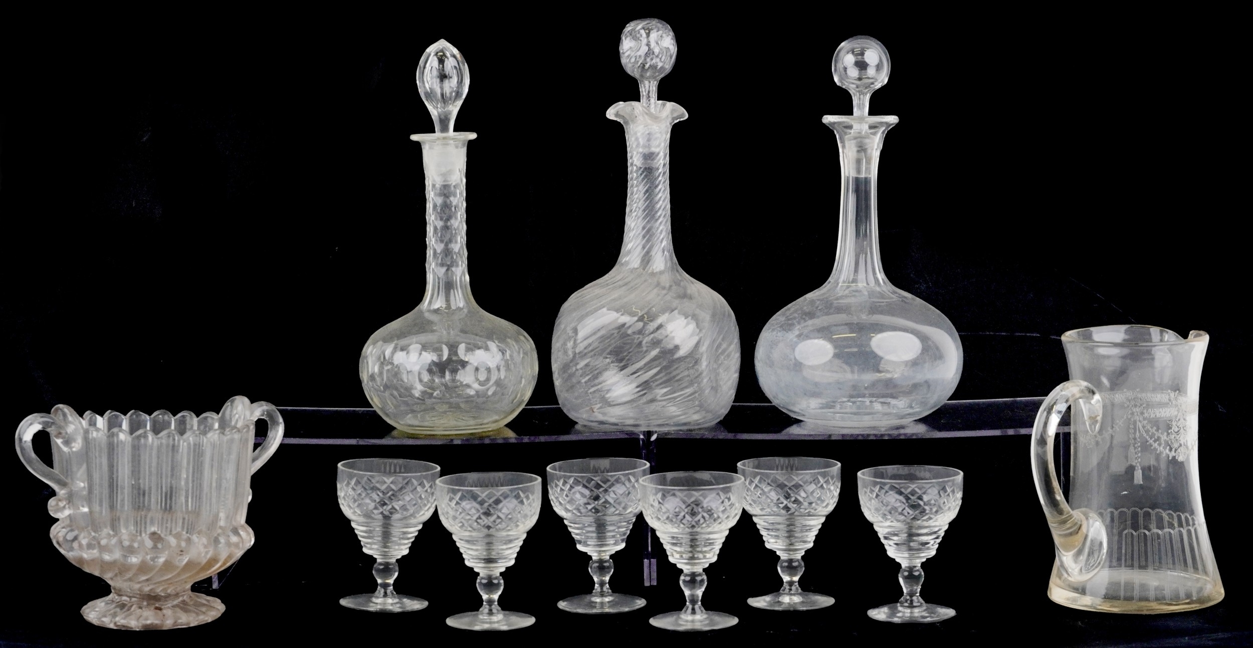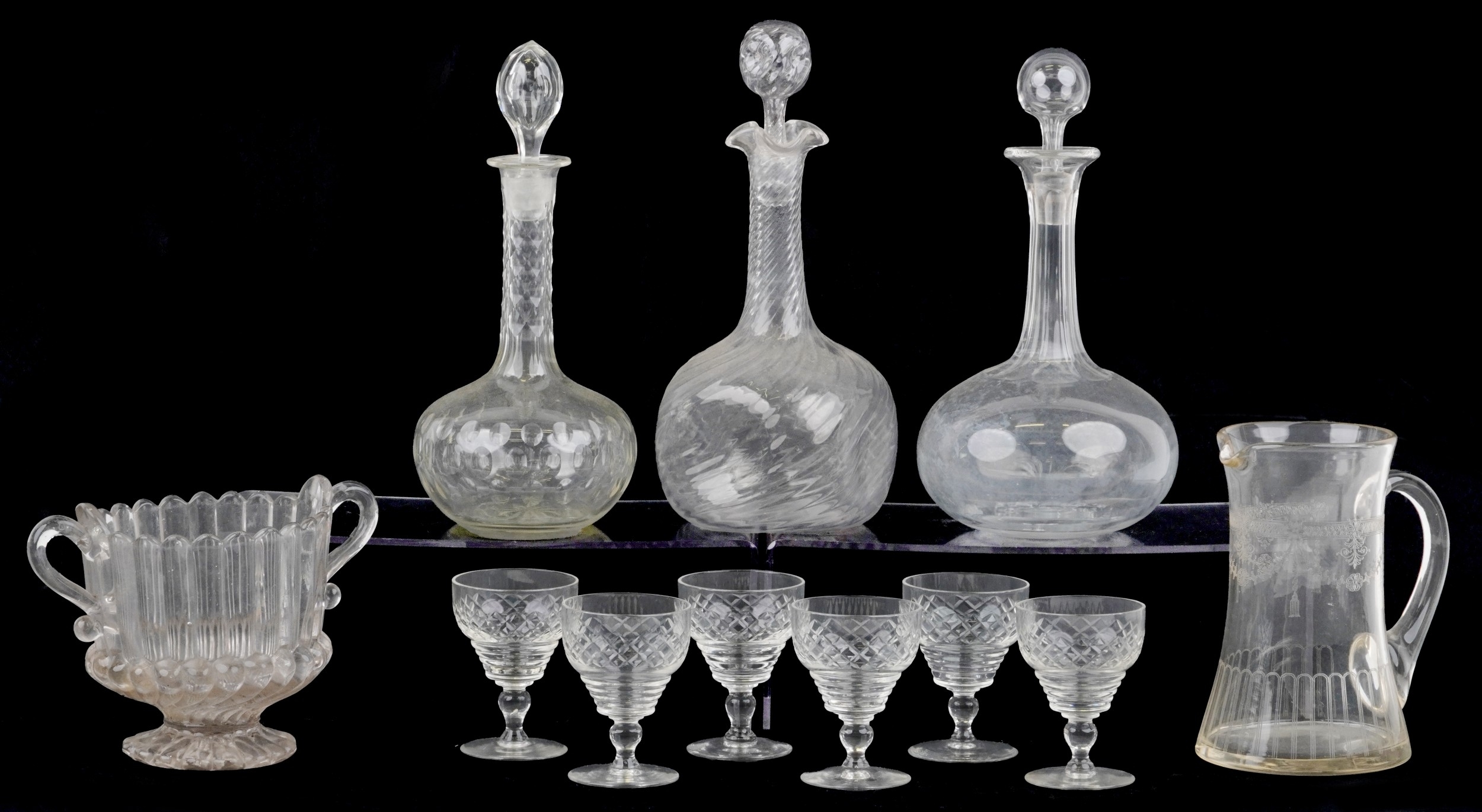 Antique and later glassware including decanters, sherry glasses and an urn shaped vase, the largest 28cm high.
