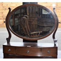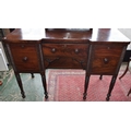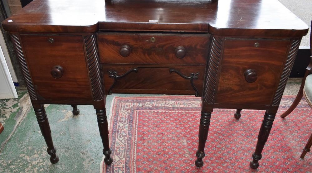 A George III mahogany sideboard, rounded inverted breakfront top above an arrangement of drawers and a cupboard door flanked by barberpole reeded quarter columns, turned legs, 133cm wide
