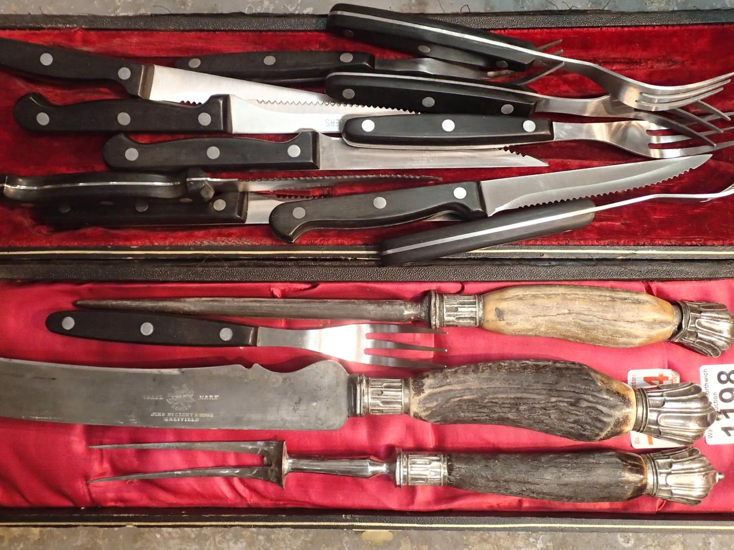 Twelve piece Viner cutlery set and three piece antler handled carving set by John McClory and Sons. P&P Group 2 (£18+VAT for the first lot and £3+VAT for subsequent lots)