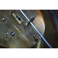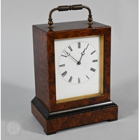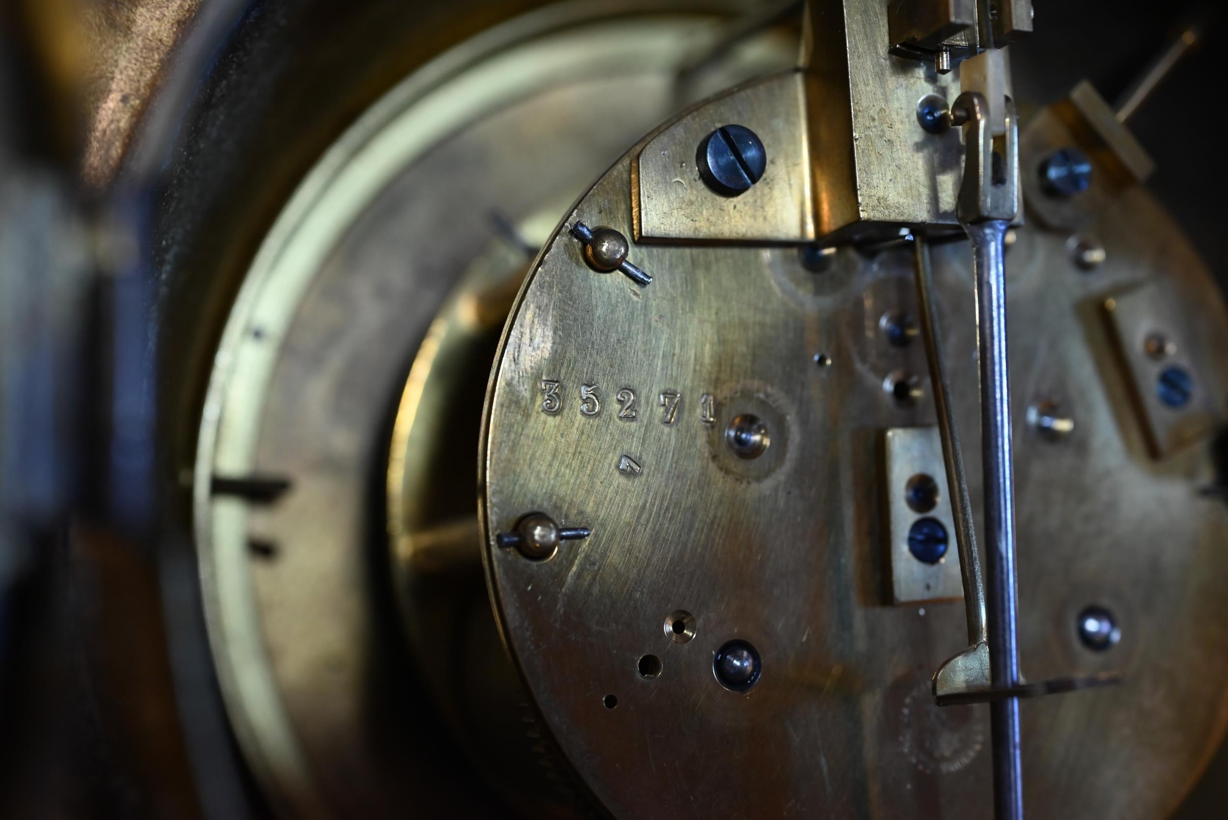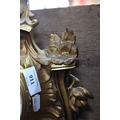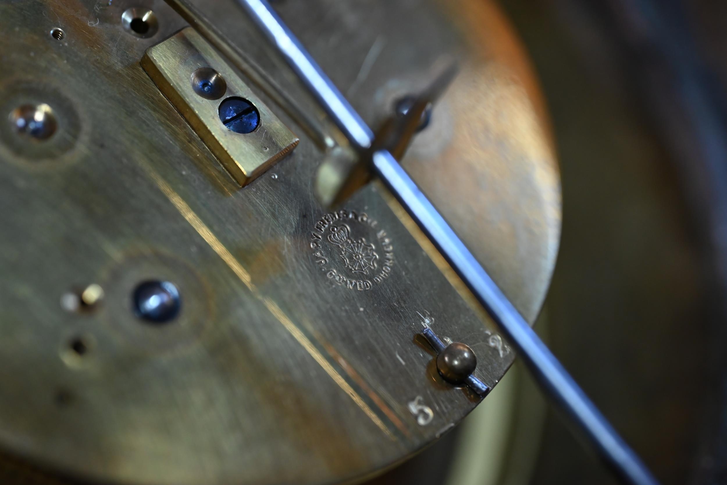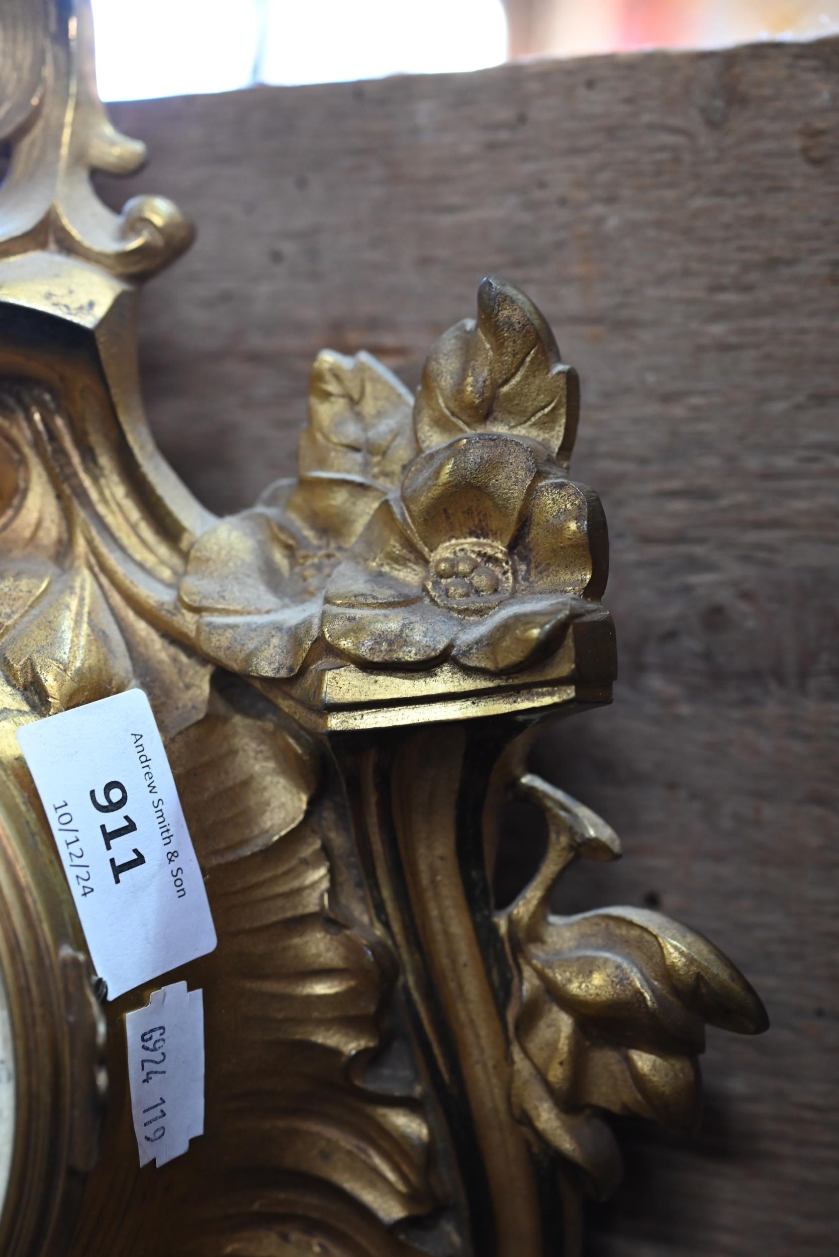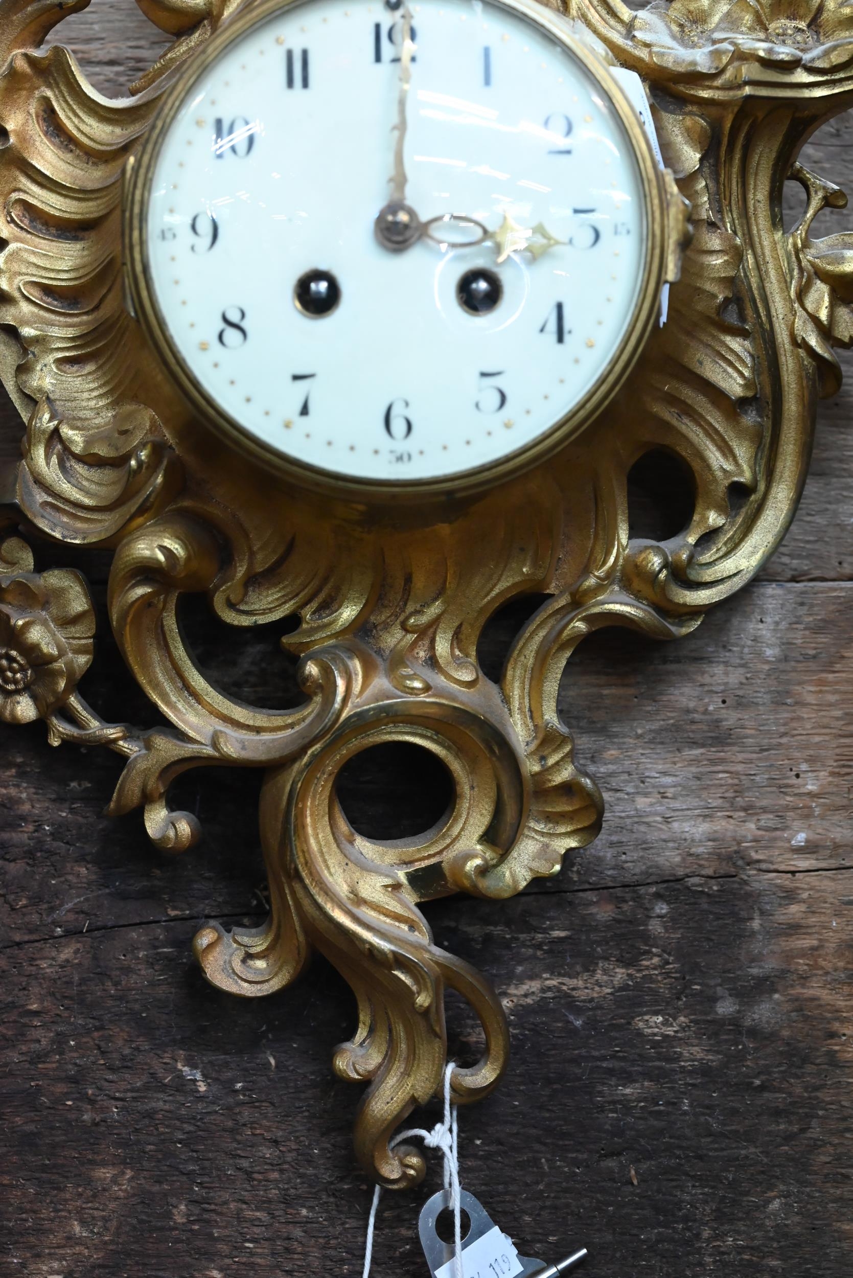 An antique French gilt metal 8-day cartel clock, the 8-day two train movement by Japy Freres, striking the half and hours on a bell, with drop pendulum, the white enamelled dial with Arabic numerals, 12 cm dia. x 50 cm h