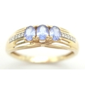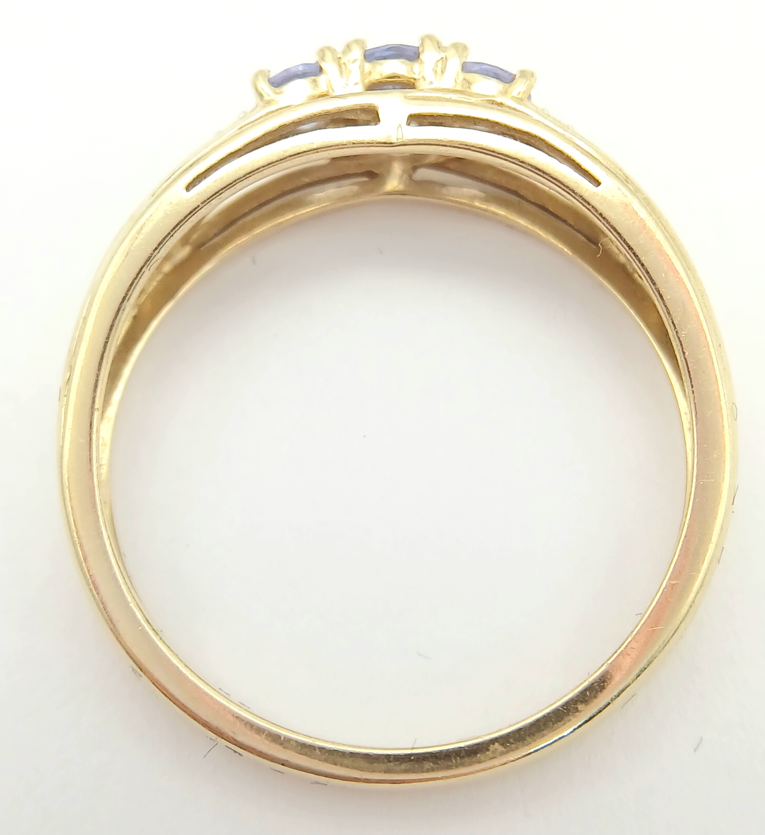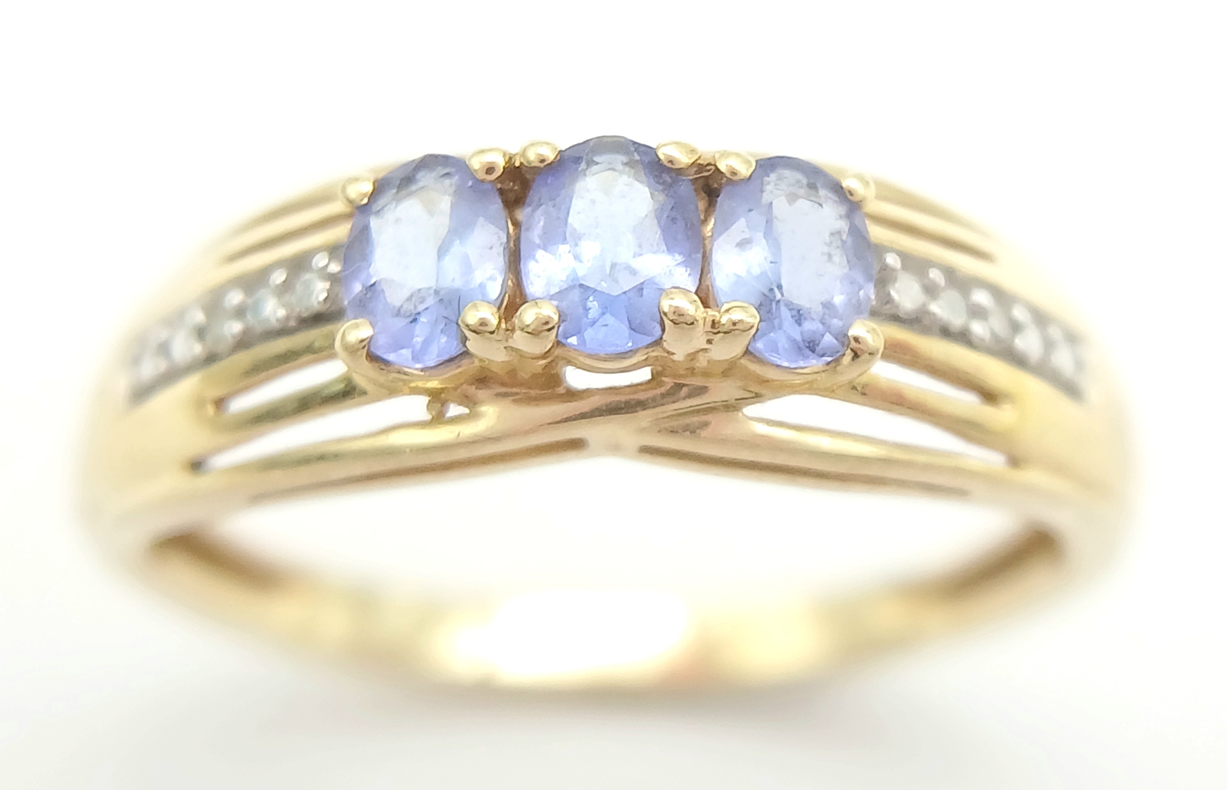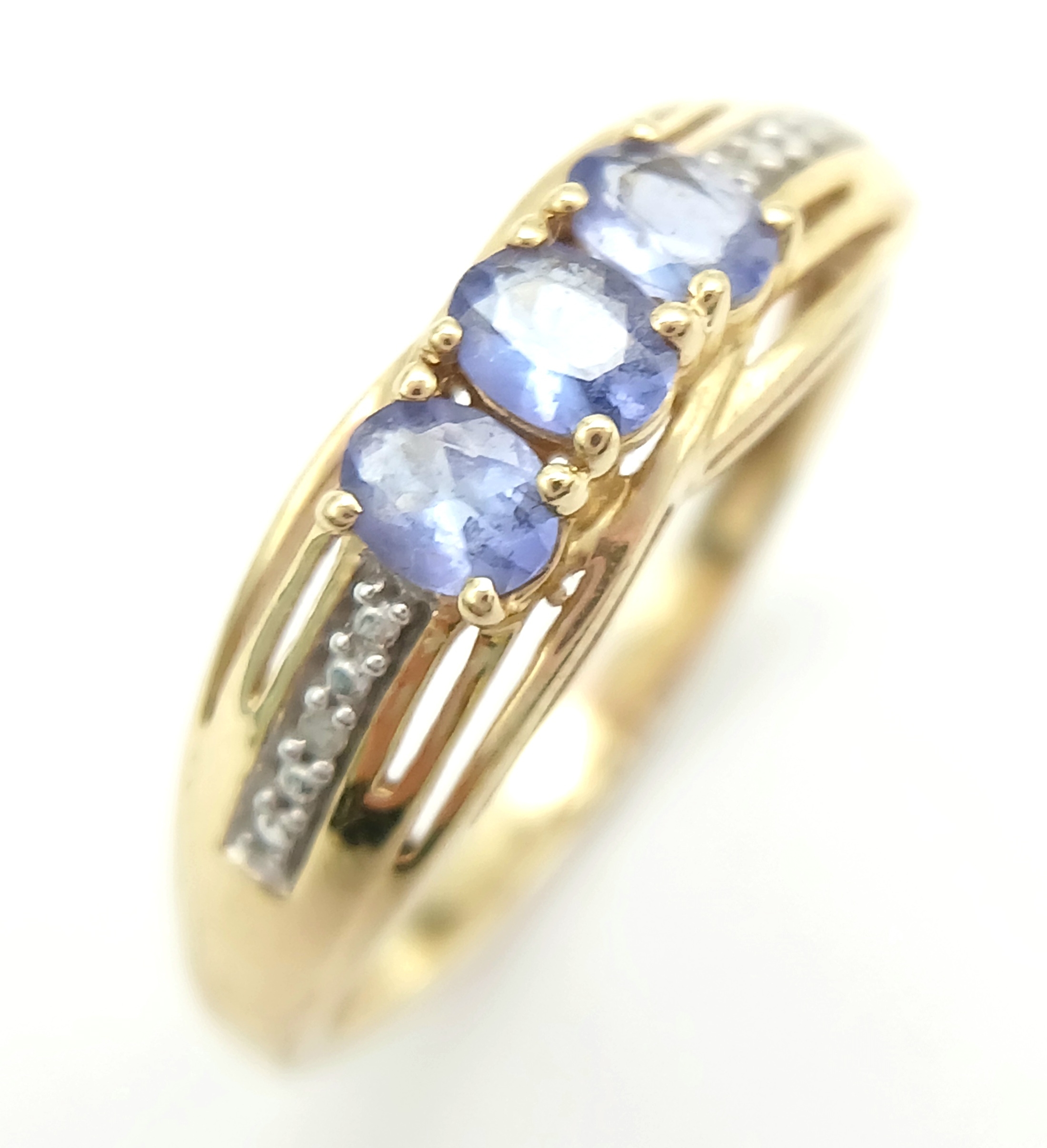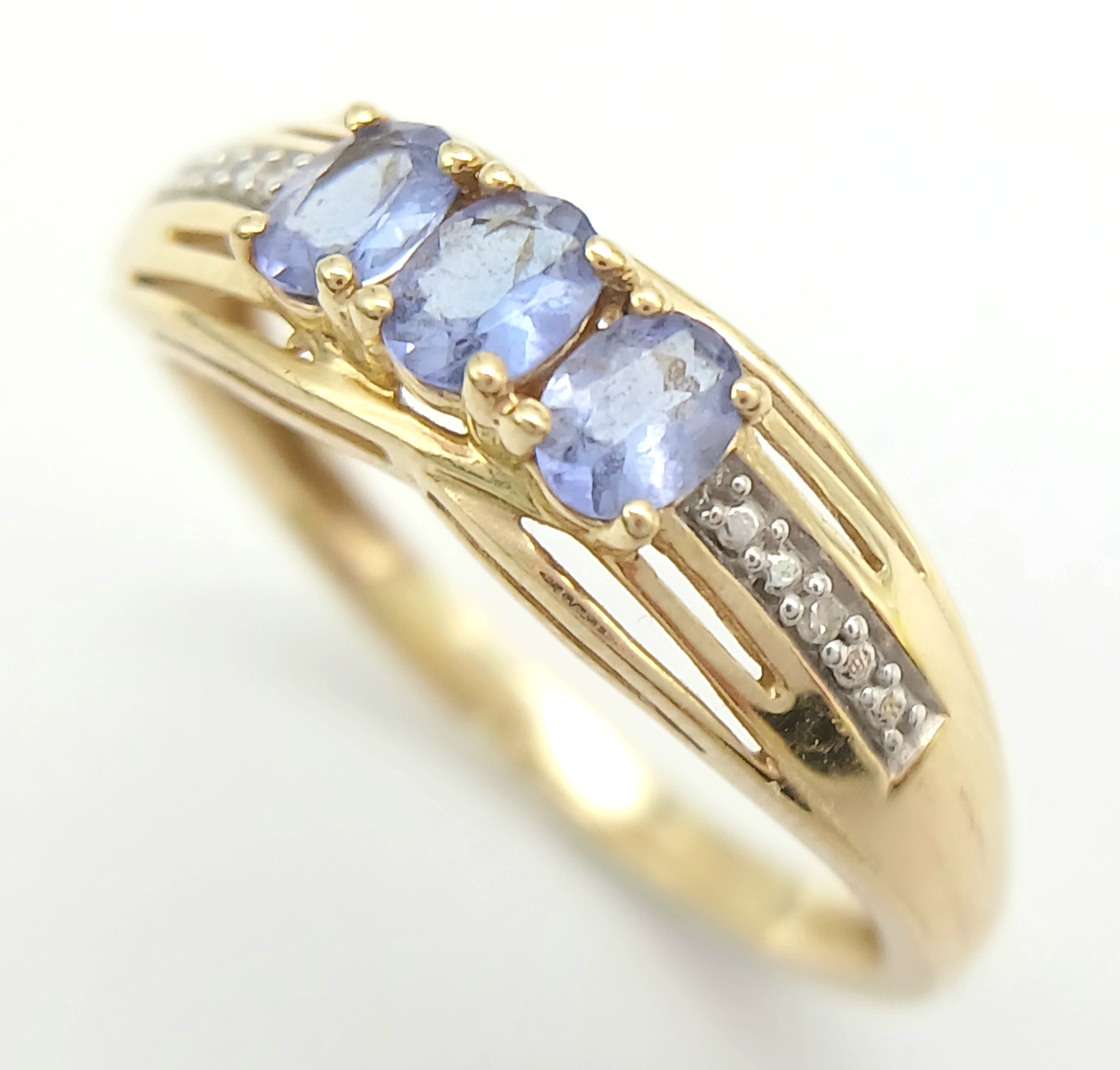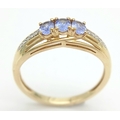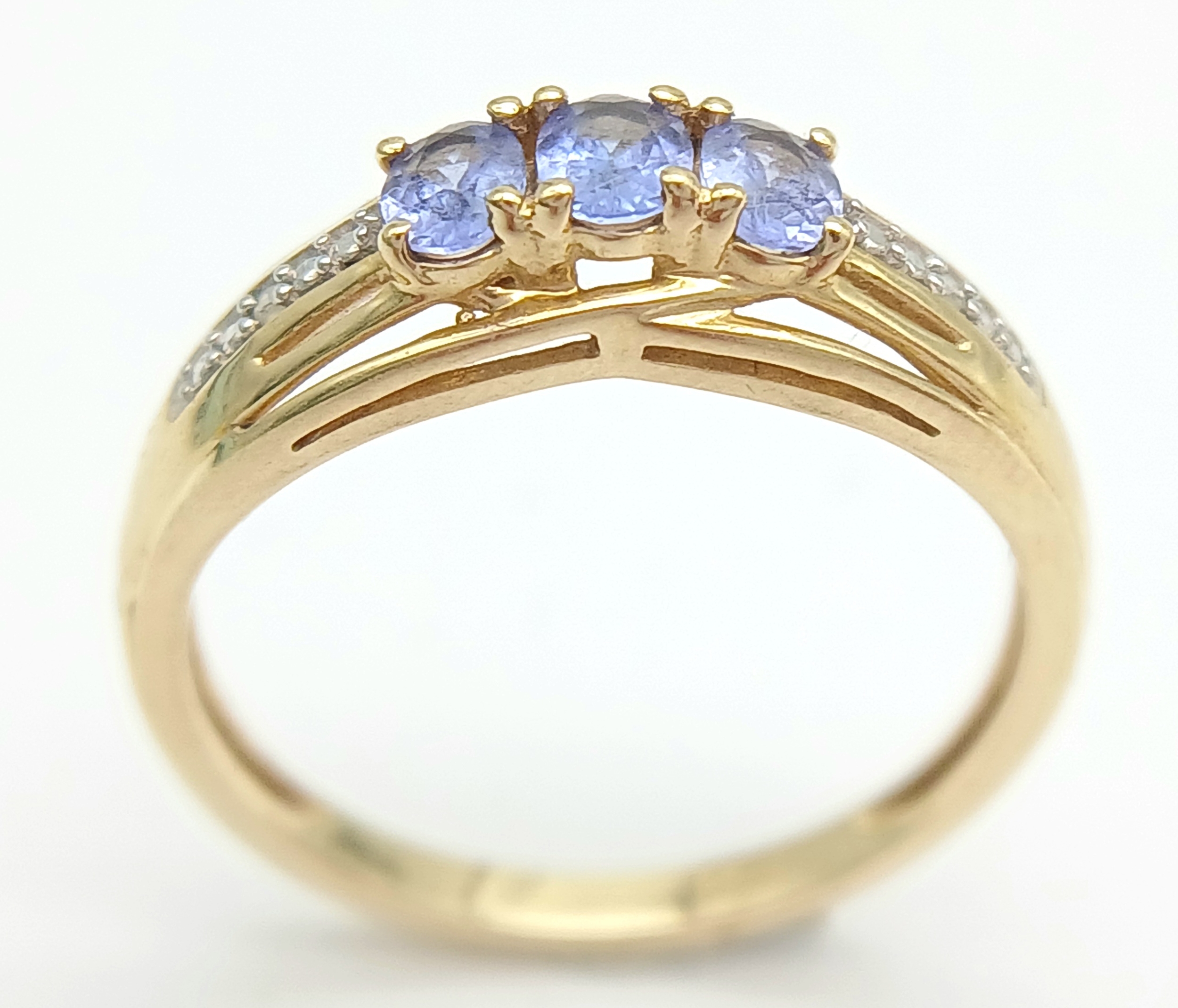 Stunning 14 CARAT GOLD, SAPPHIRE TRILOGY RING with DIAMOND SHOULDERS. Fully hallmarked. 2.4 Grams. Size O - O 1/2. Beautiful quality Ring , please see pictures.