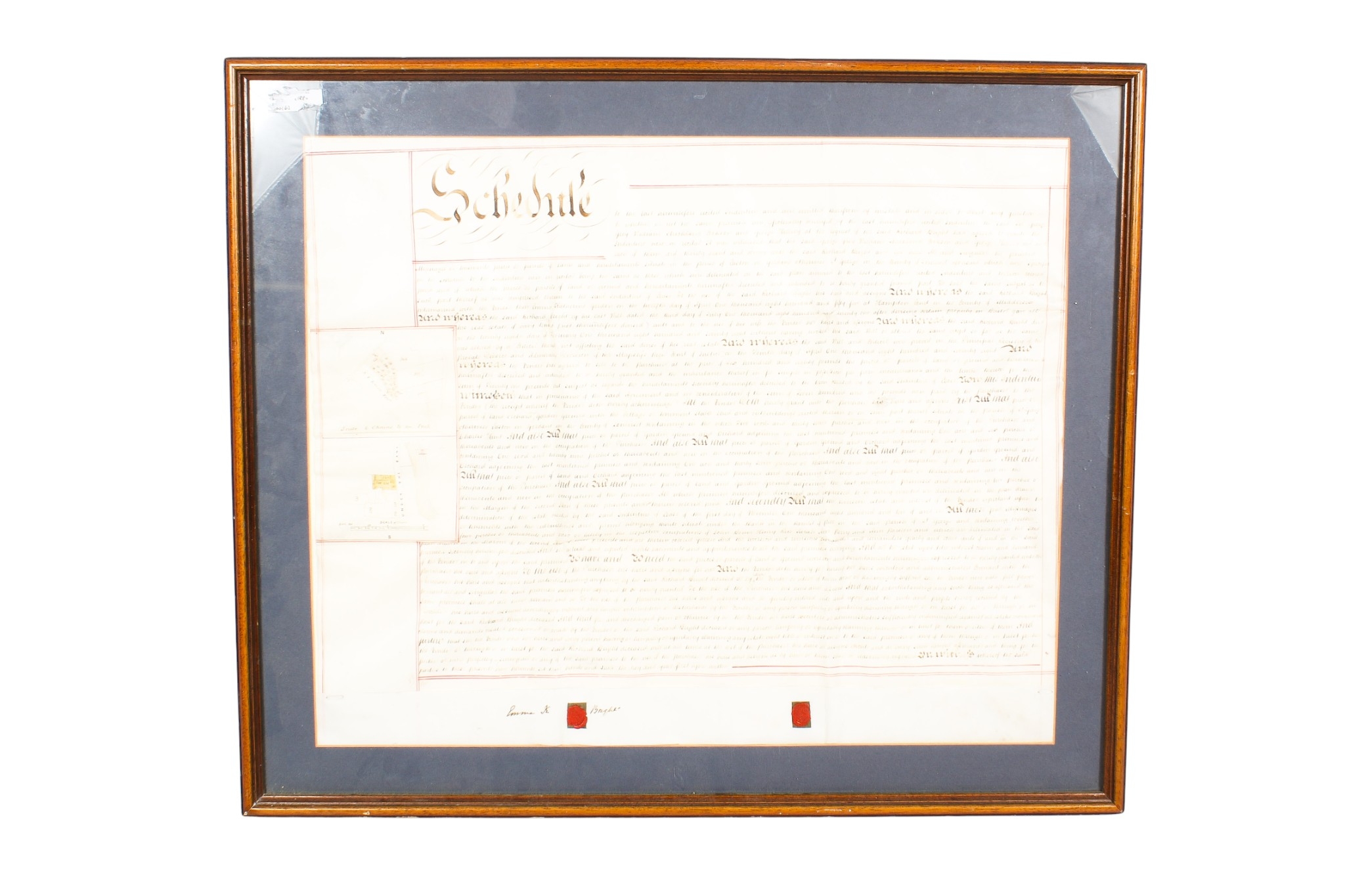 A hand written deed, local interest (New Street, Wells, etc.). 68cm x 55cm, framed and glazed, 82cm x 69cm