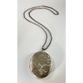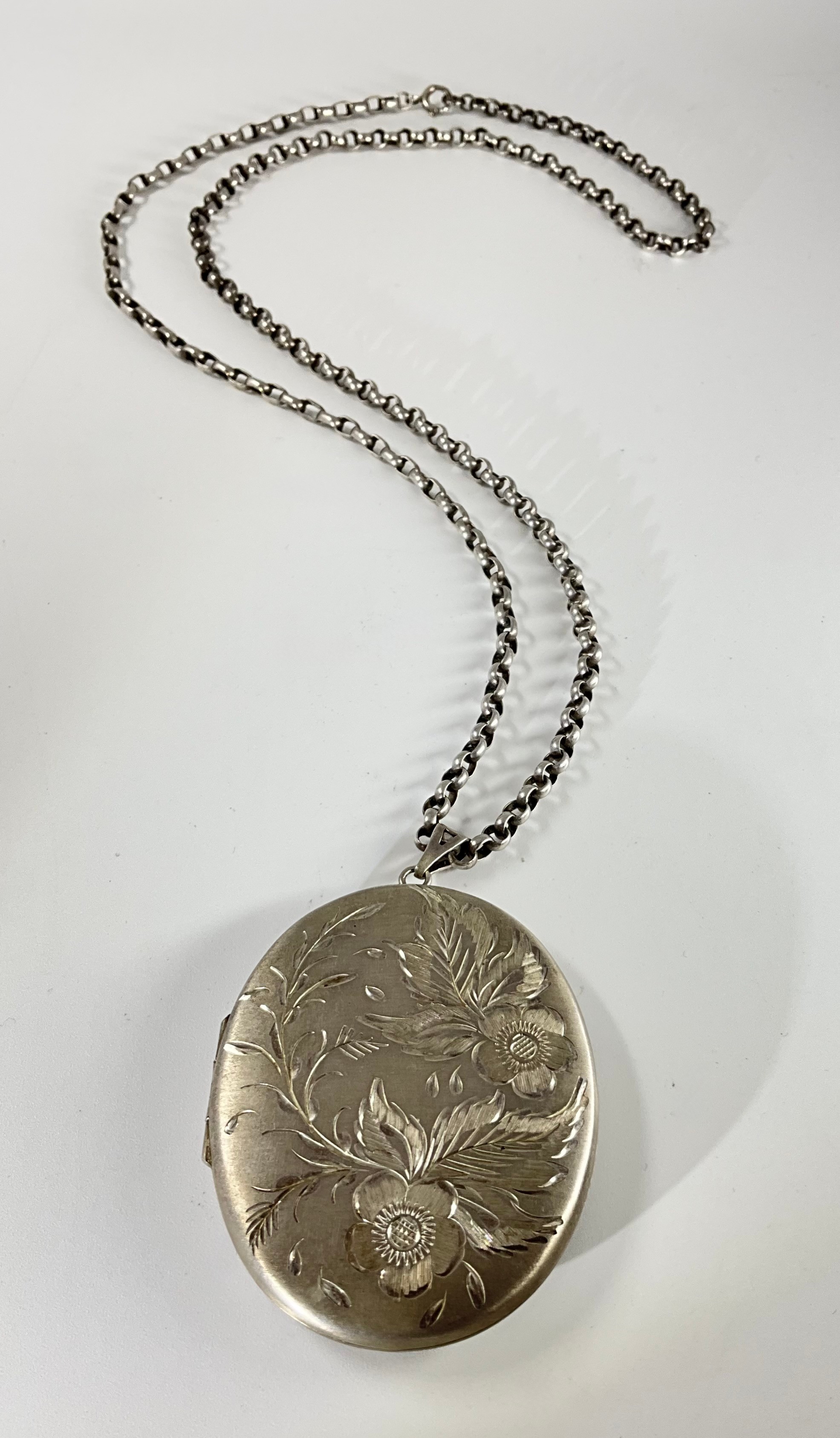 A Vintage hallmarked silver floral design oval photograph locket pendant with silver belcher chain,