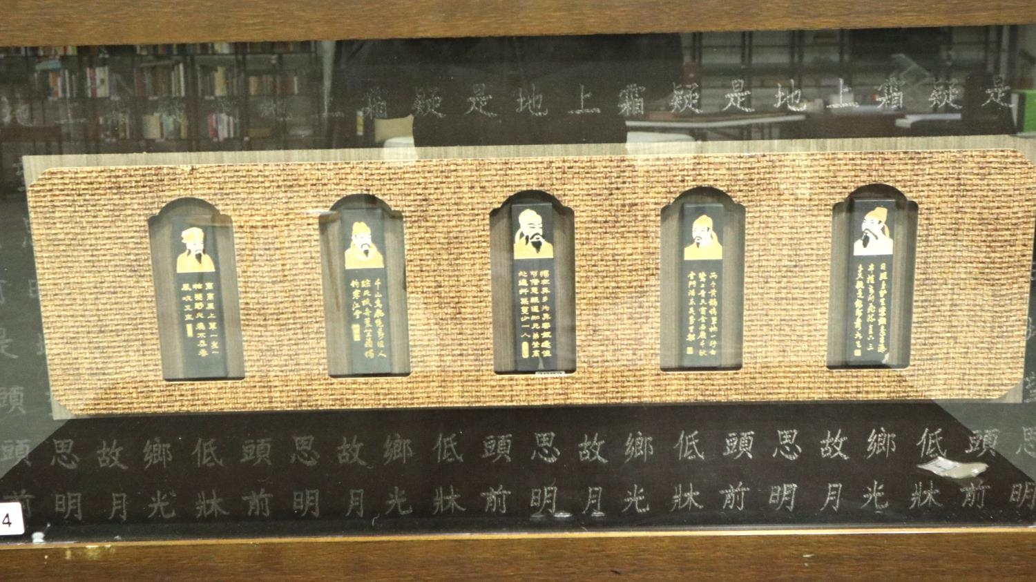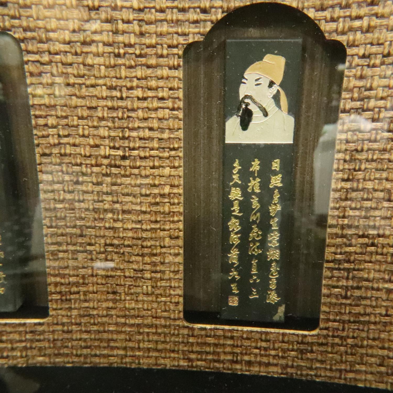 Framed tableau featuring The Five Emperors of China, overall 98 x 48 cm. Not available for in-house P&P, contact Paul O'Hea at Mailboxes on 01925 659133
