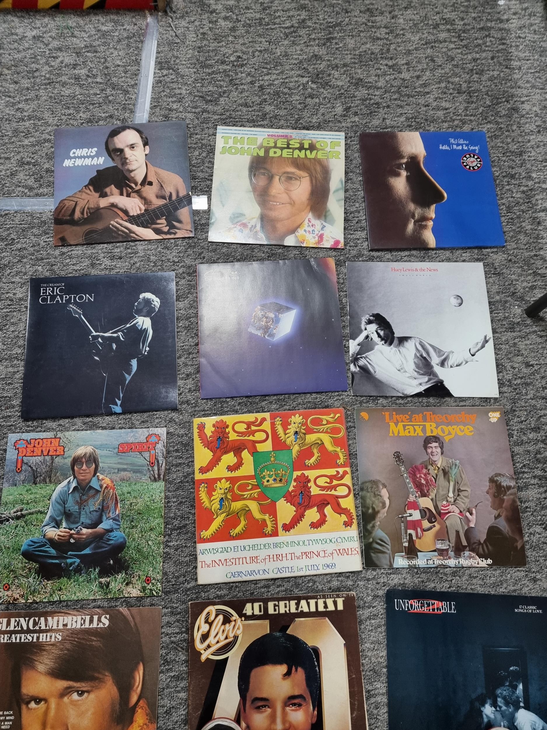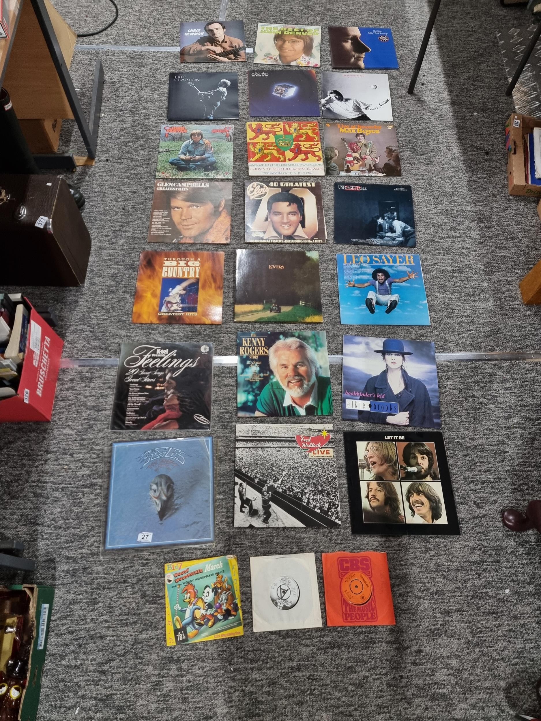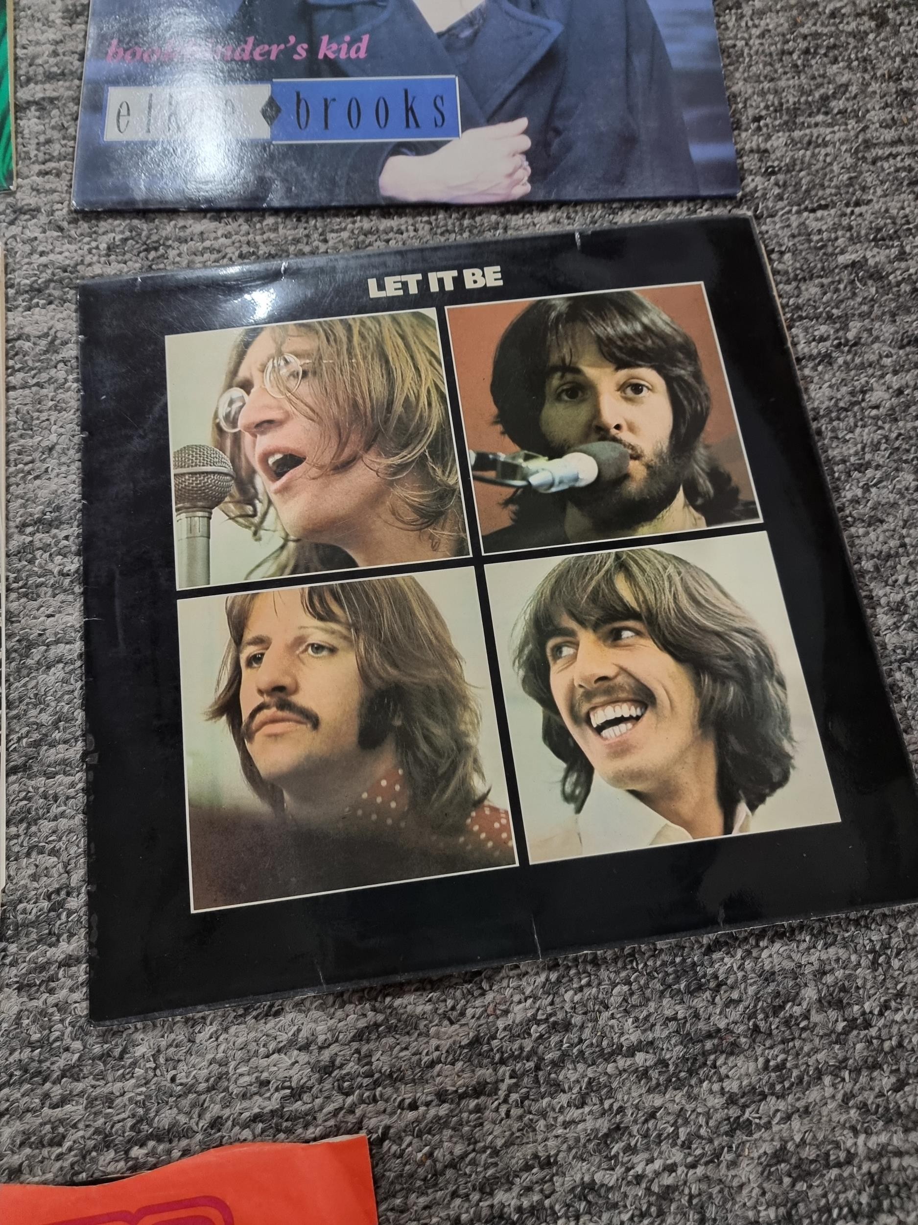 A selection of Vinyl LP records which includes a rare Beatles Let it be import pressing with a Parlophone sleeve marked PPCS 7096. Other records include artists such as Eric Clapton, Phil Collins, Chris Rea, Elvis etc.