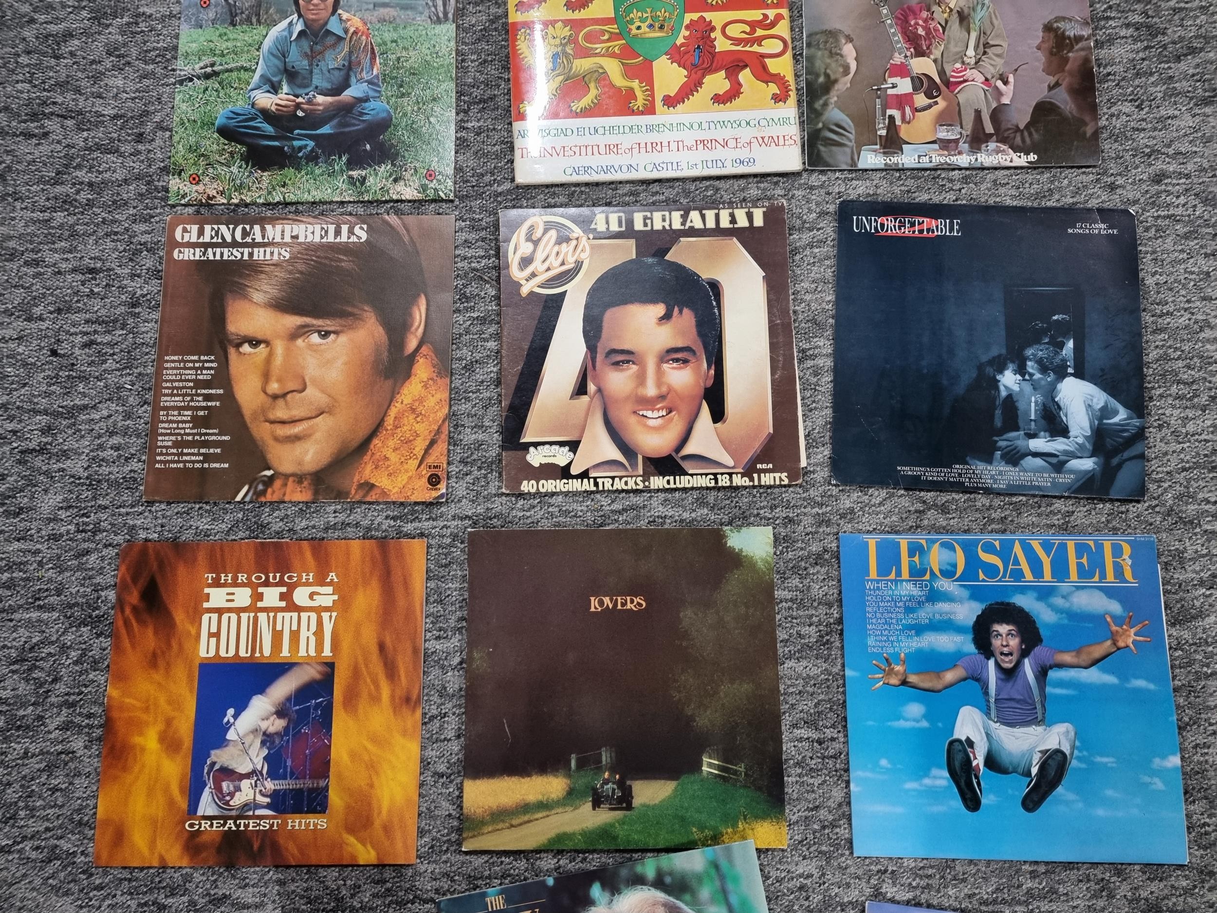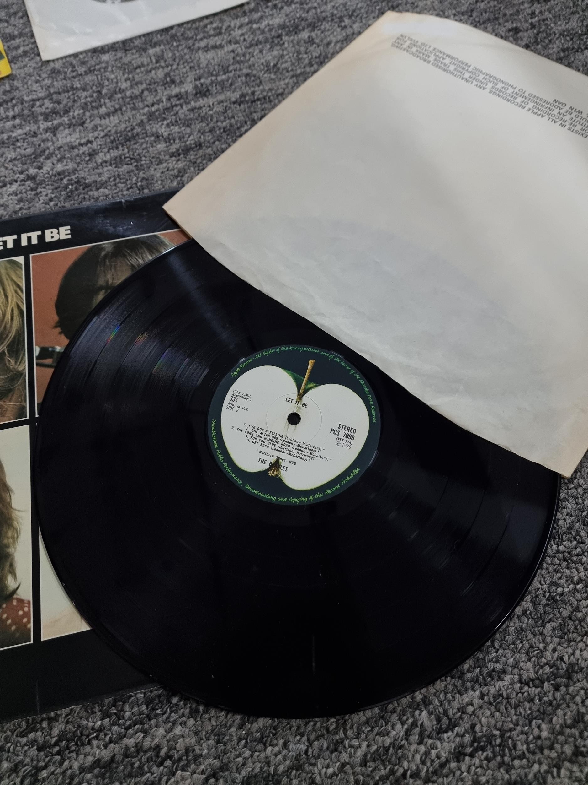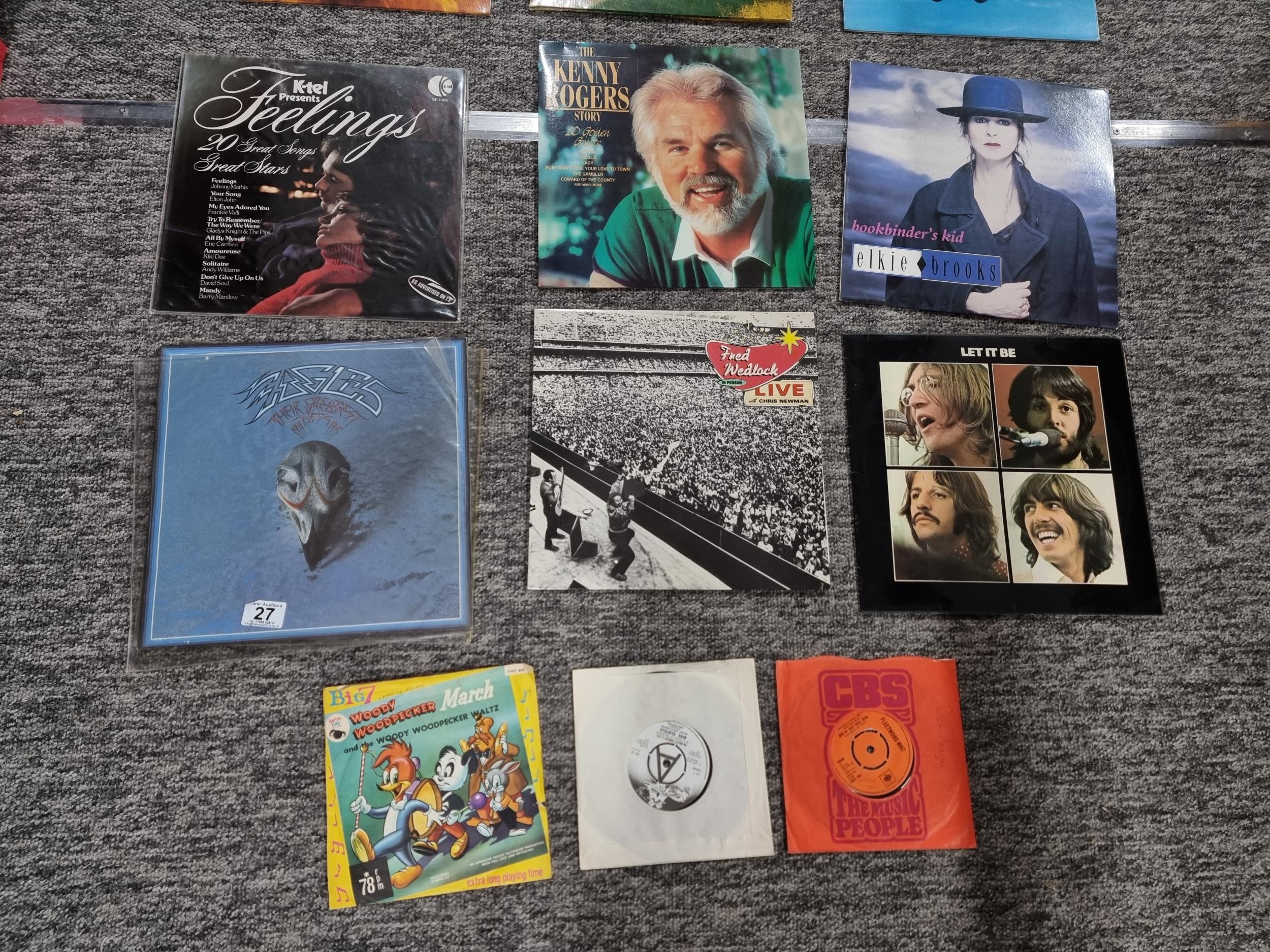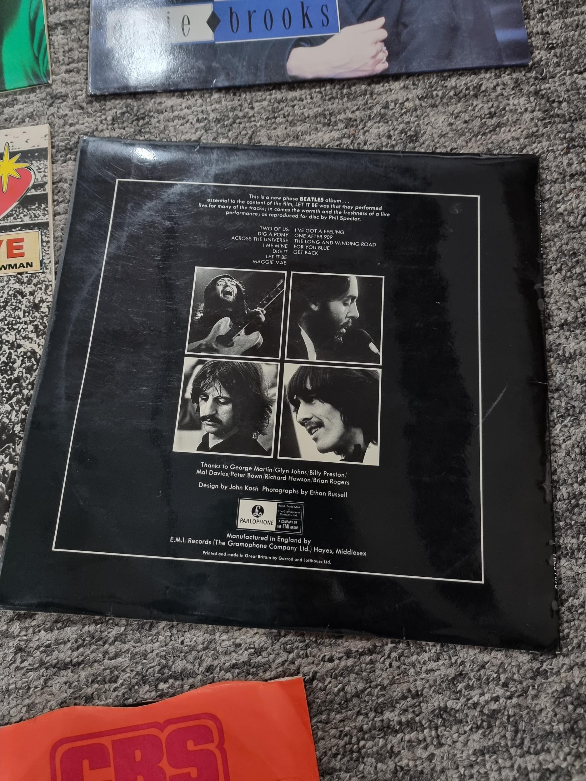A selection of Vinyl LP records which includes a rare Beatles Let it be import pressing with a Parlophone sleeve marked PPCS 7096. Other records include artists such as Eric Clapton, Phil Collins, Chris Rea, Elvis etc.