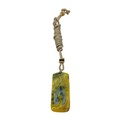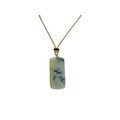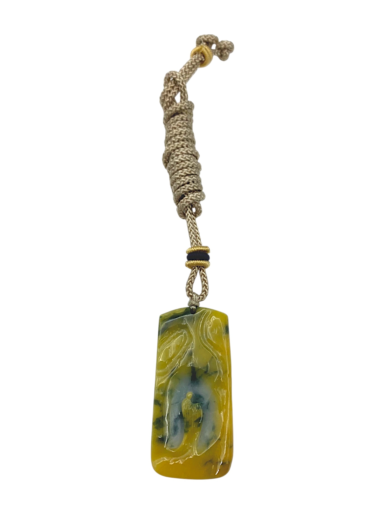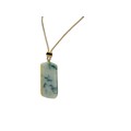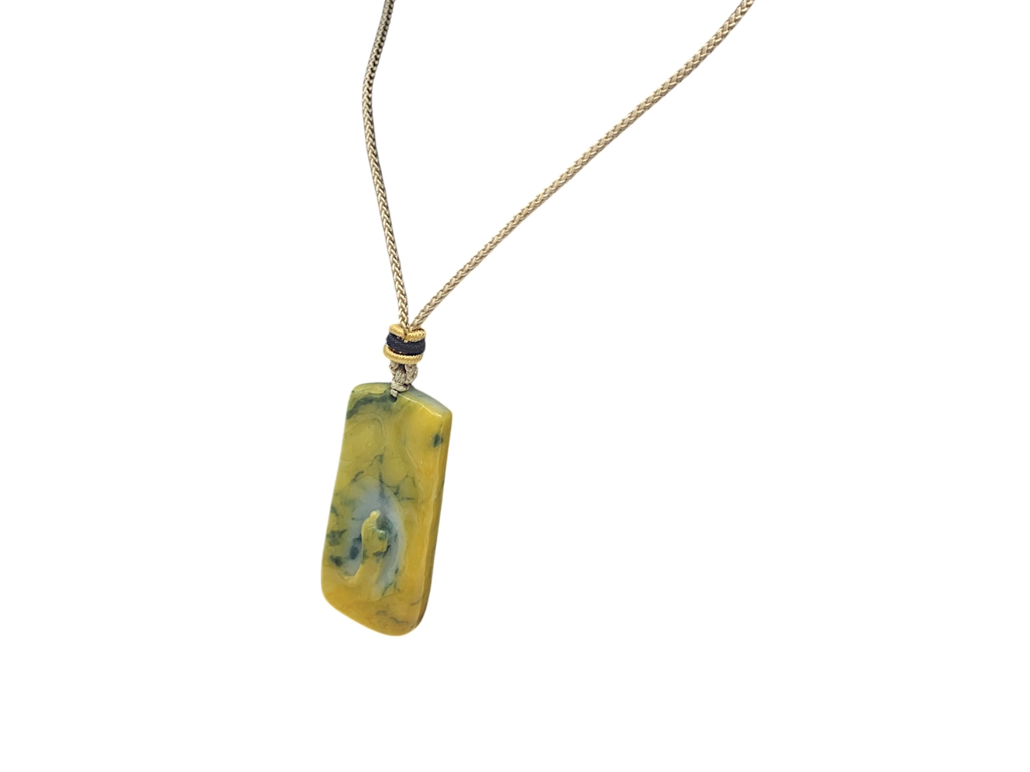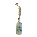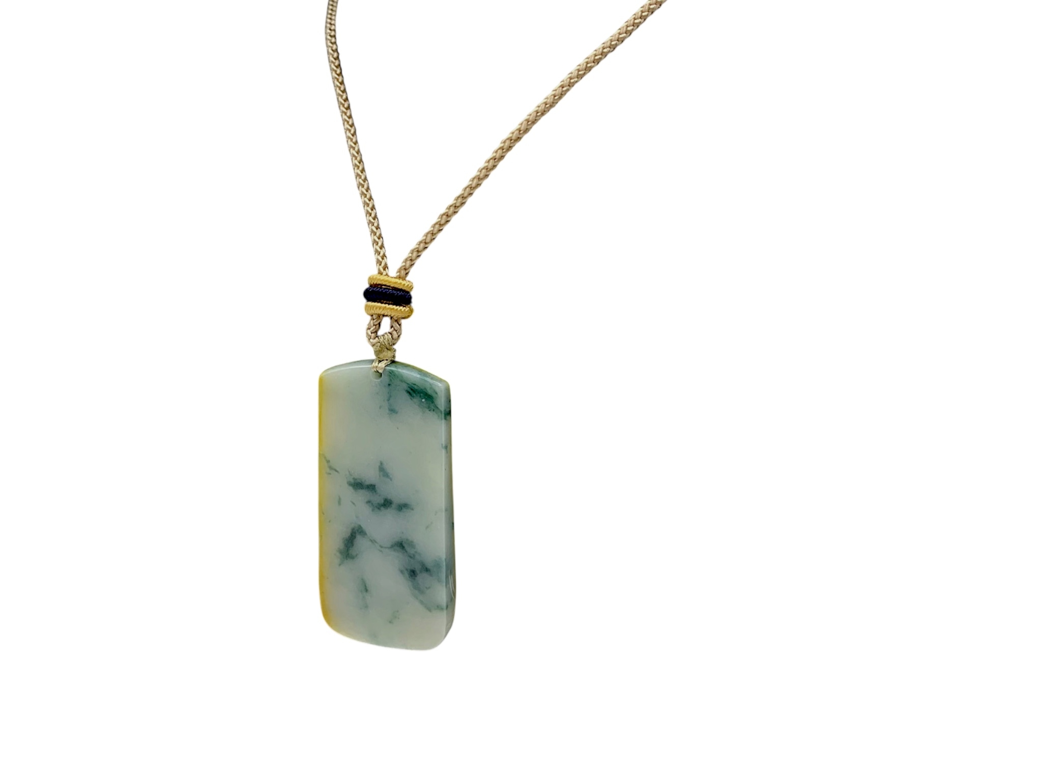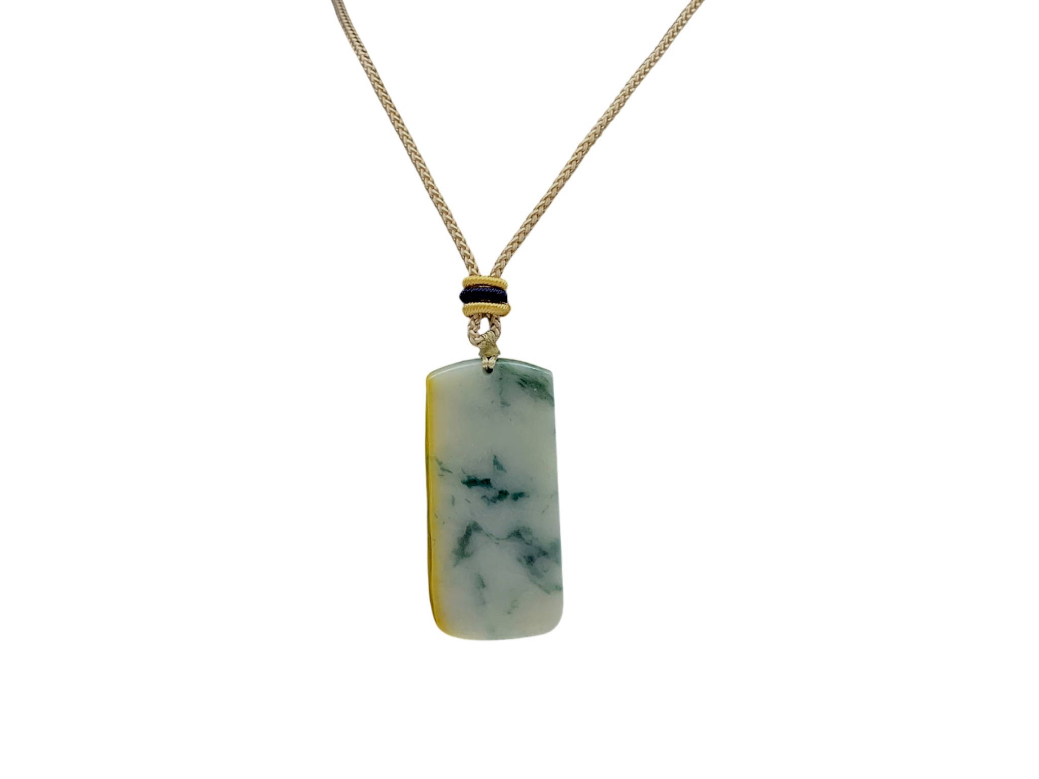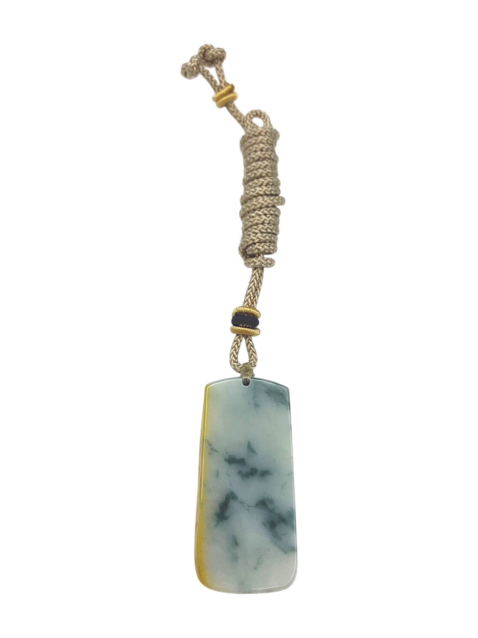 A Jade Pendant Necklace.The stone shows contrasting pale celadon and darker green tones. Suspended from a black cord necklace with bead fittings. Pendant dimensions: approximately 2 × 4.5 cm, 18 g, Cord length: approximately 30 cm.