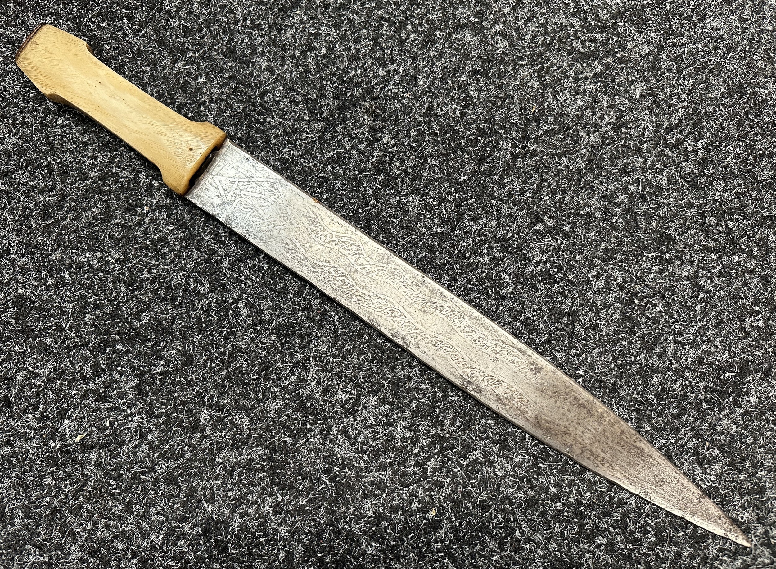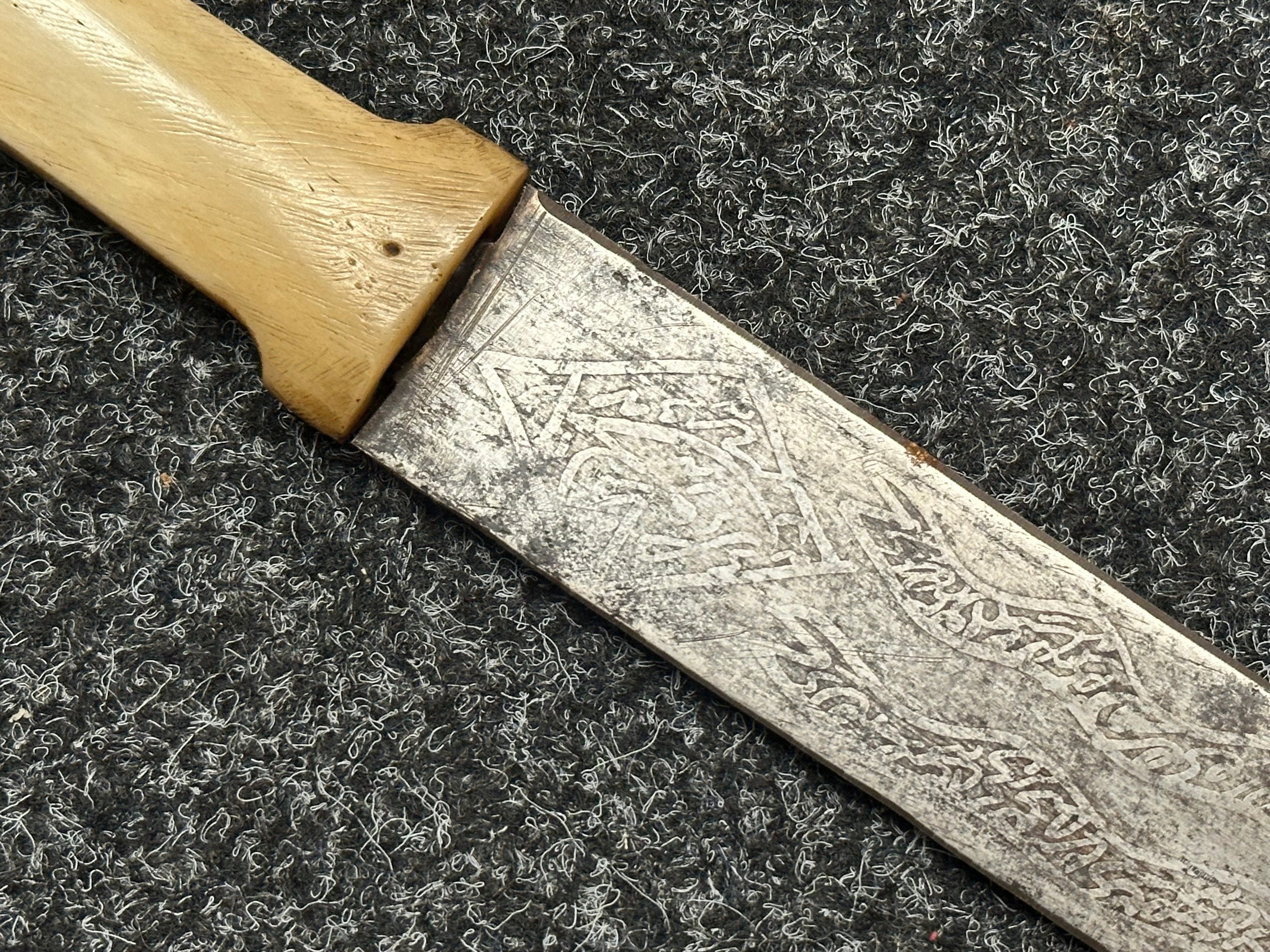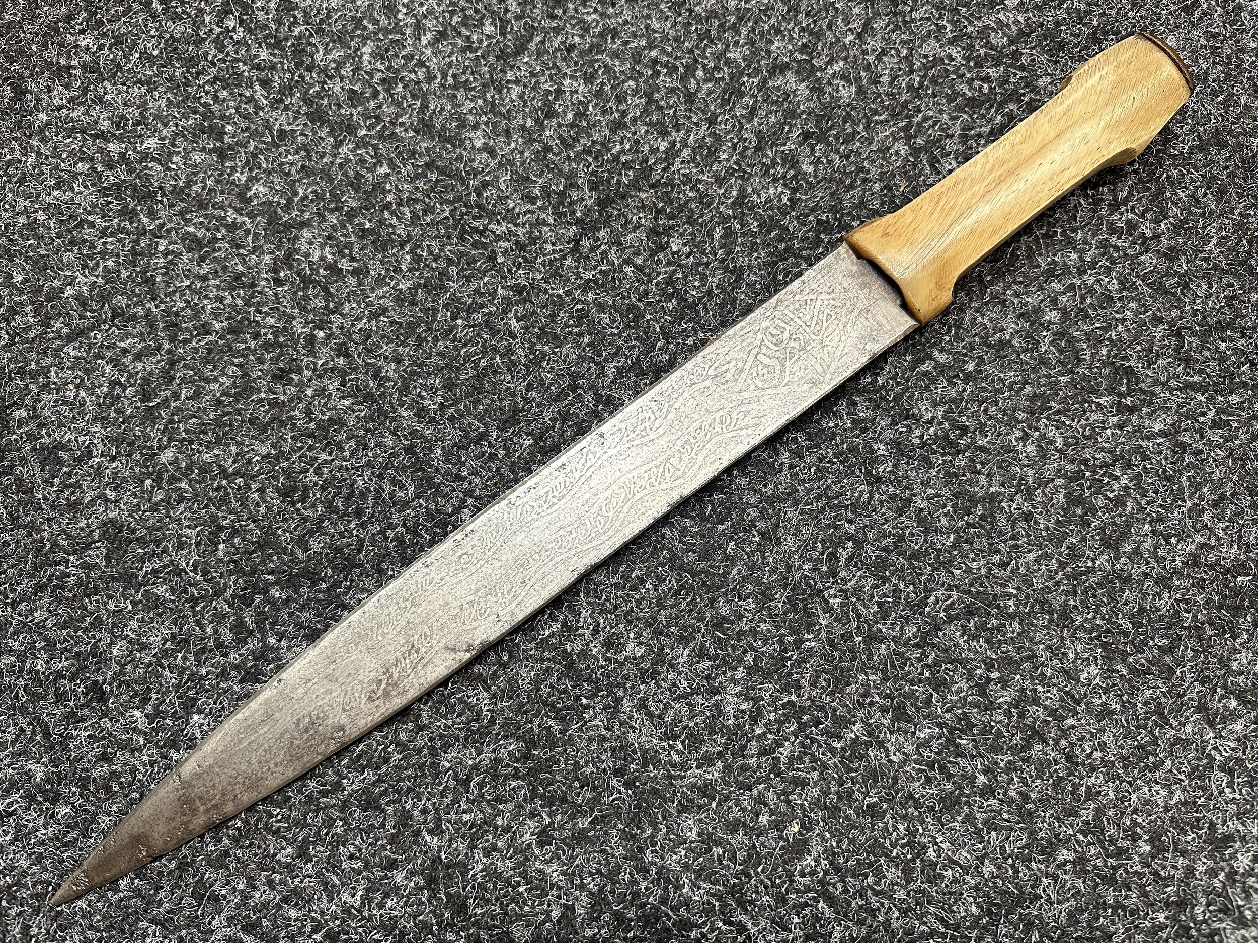 Indian dagger with double edged blade 340mm in length, both sides with etched decoration of script. Bone handle with wooden pommel cap. Overall length 463mm. No scabbard.