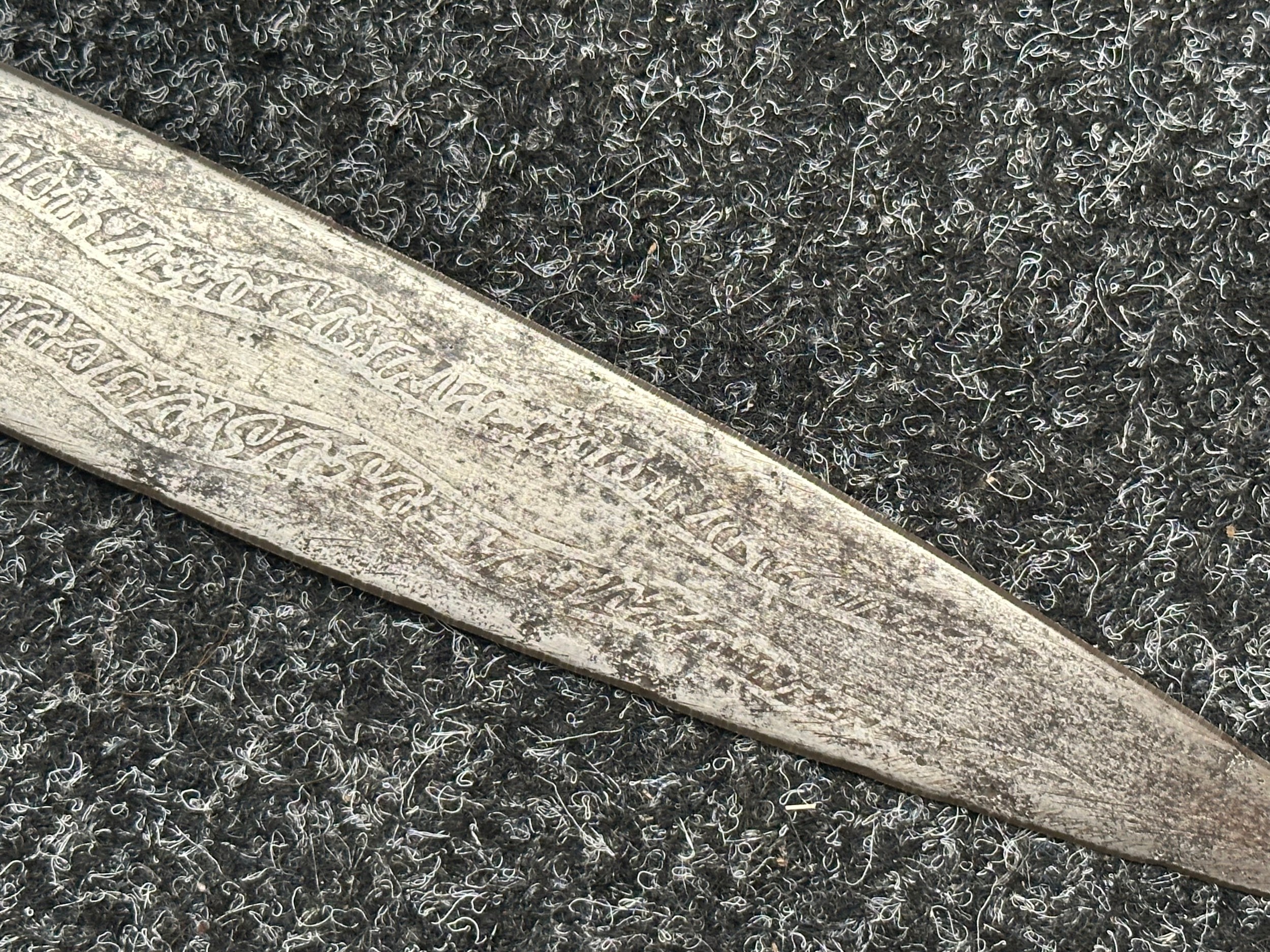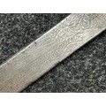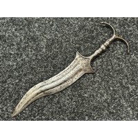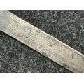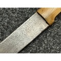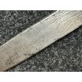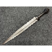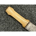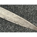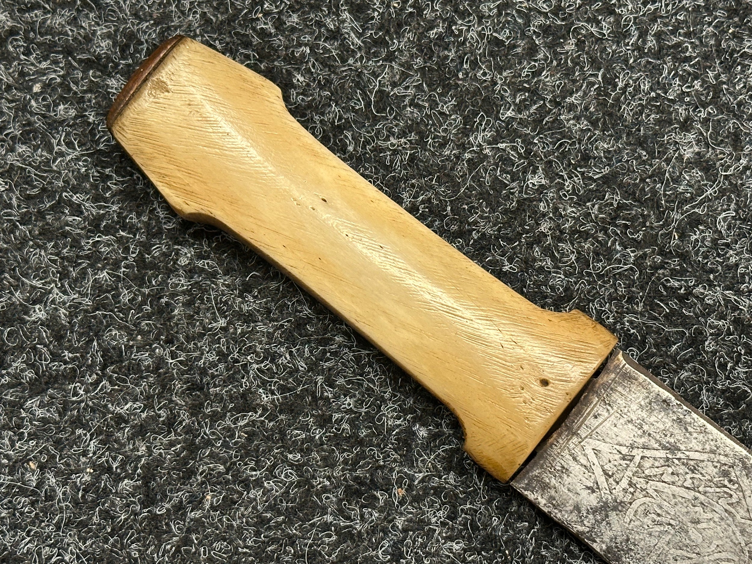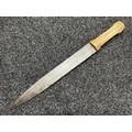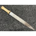 Indian dagger with double edged blade 340mm in length, both sides with etched decoration of script. Bone handle with wooden pommel cap. Overall length 463mm. No scabbard.