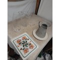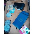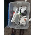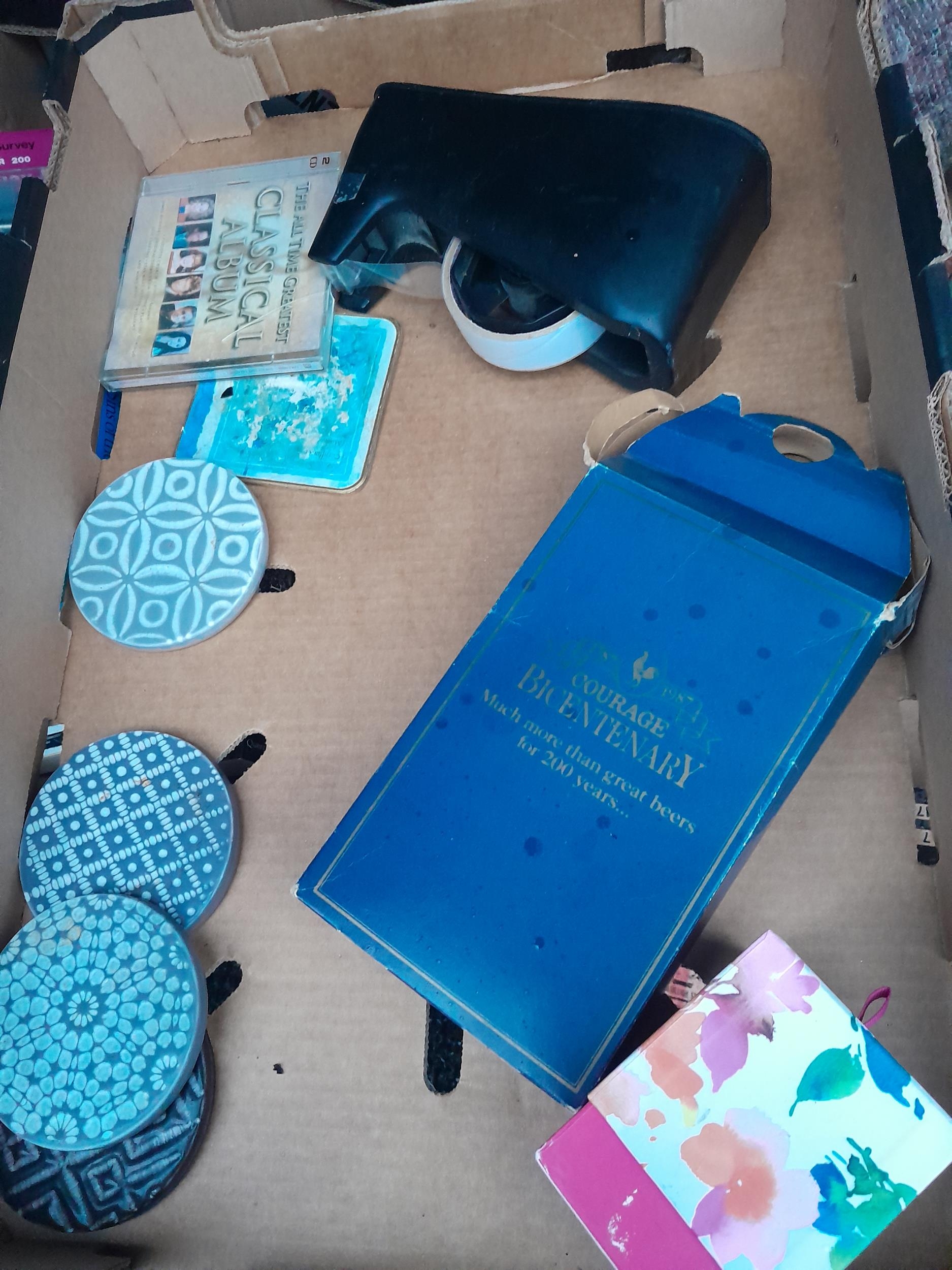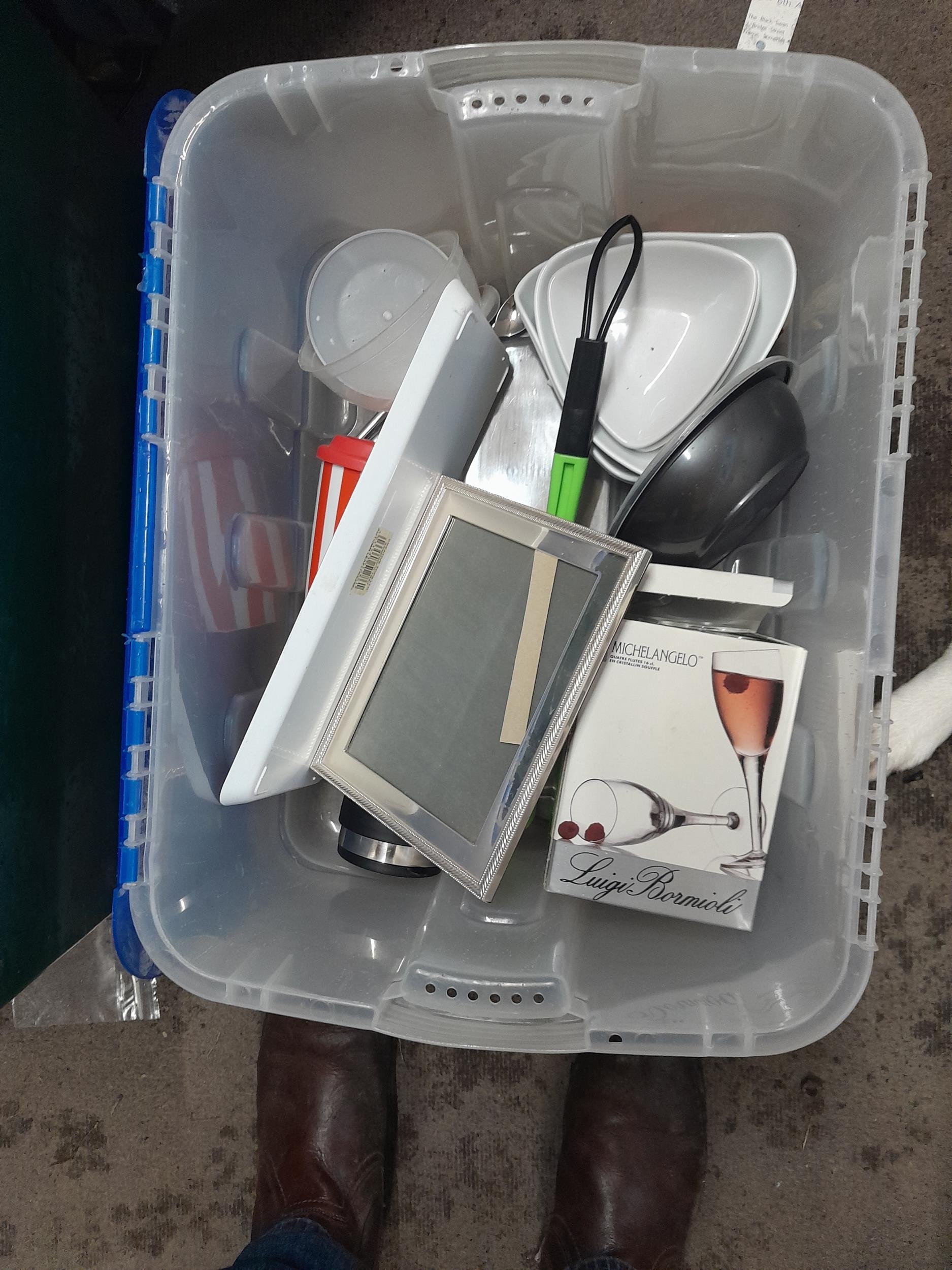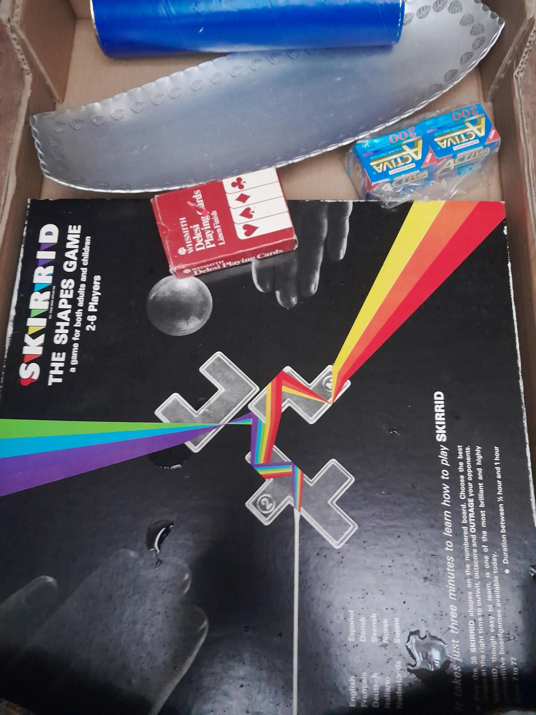 Boxes of oddments : childs games, Laura Ashley table lamp, china glass etc.