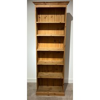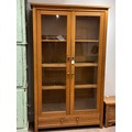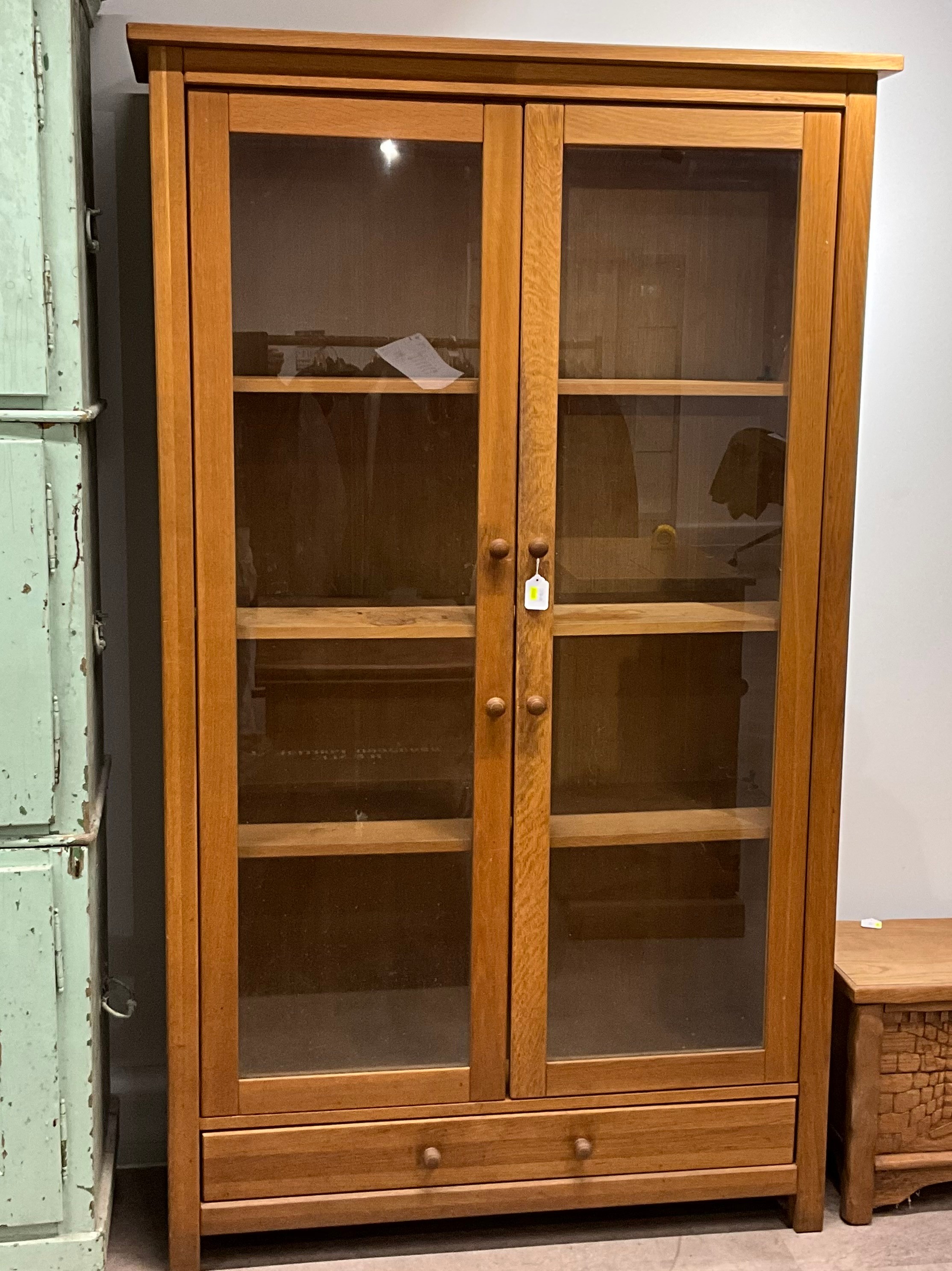 Modern oak bookcase with two oak-framed glass doors, three shelves above a single drawer, supported by four straight supports.