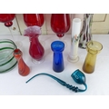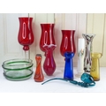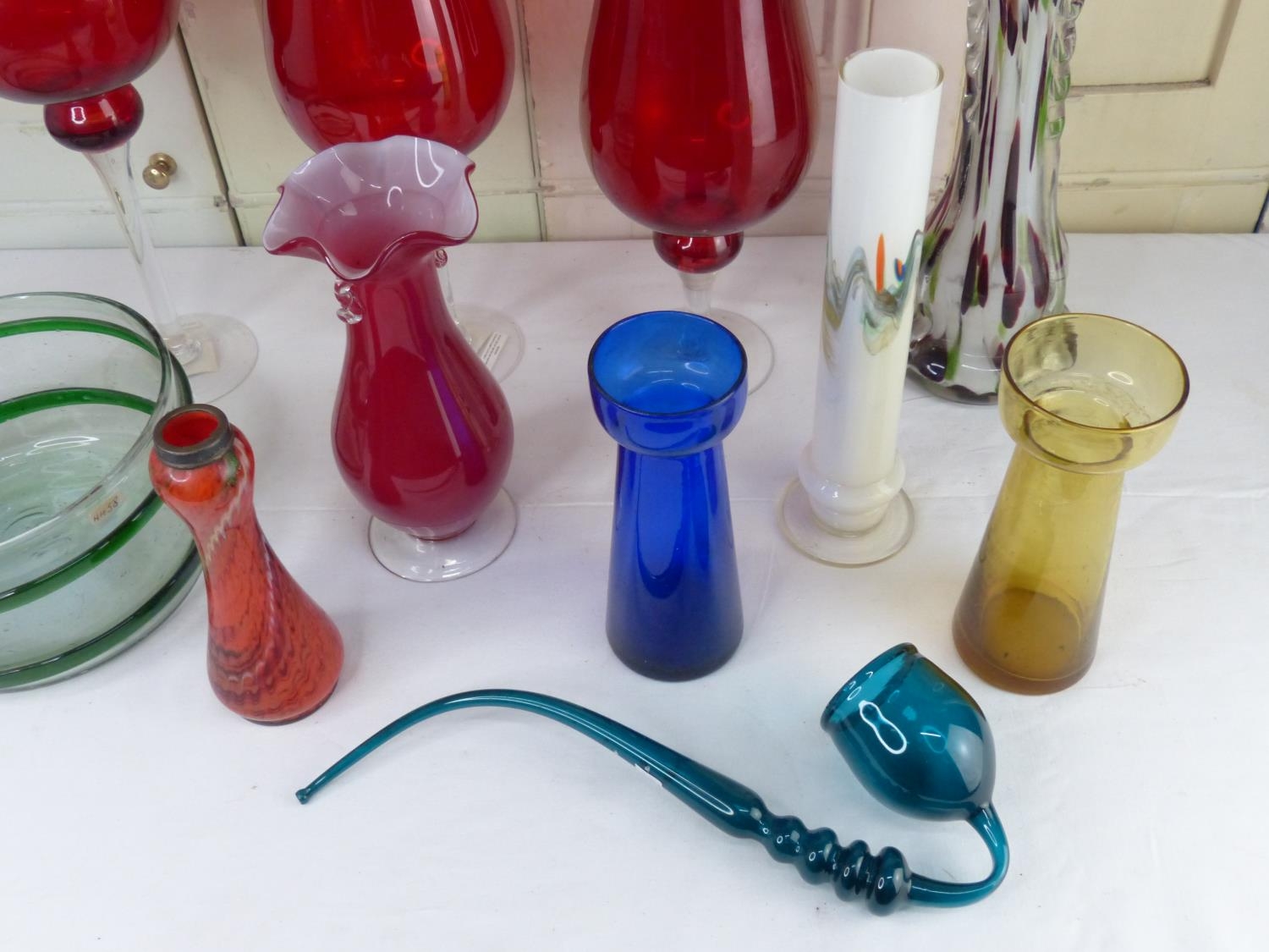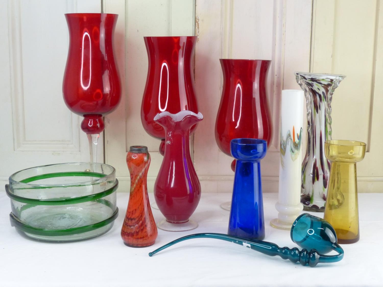 A set of three ruby glass lanterns, a vintage blue glass pipe and more.