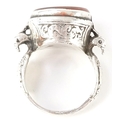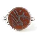 A Persian unmarked silver ring with an intaglio hardstone seal, size N/O, 9.6g.