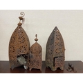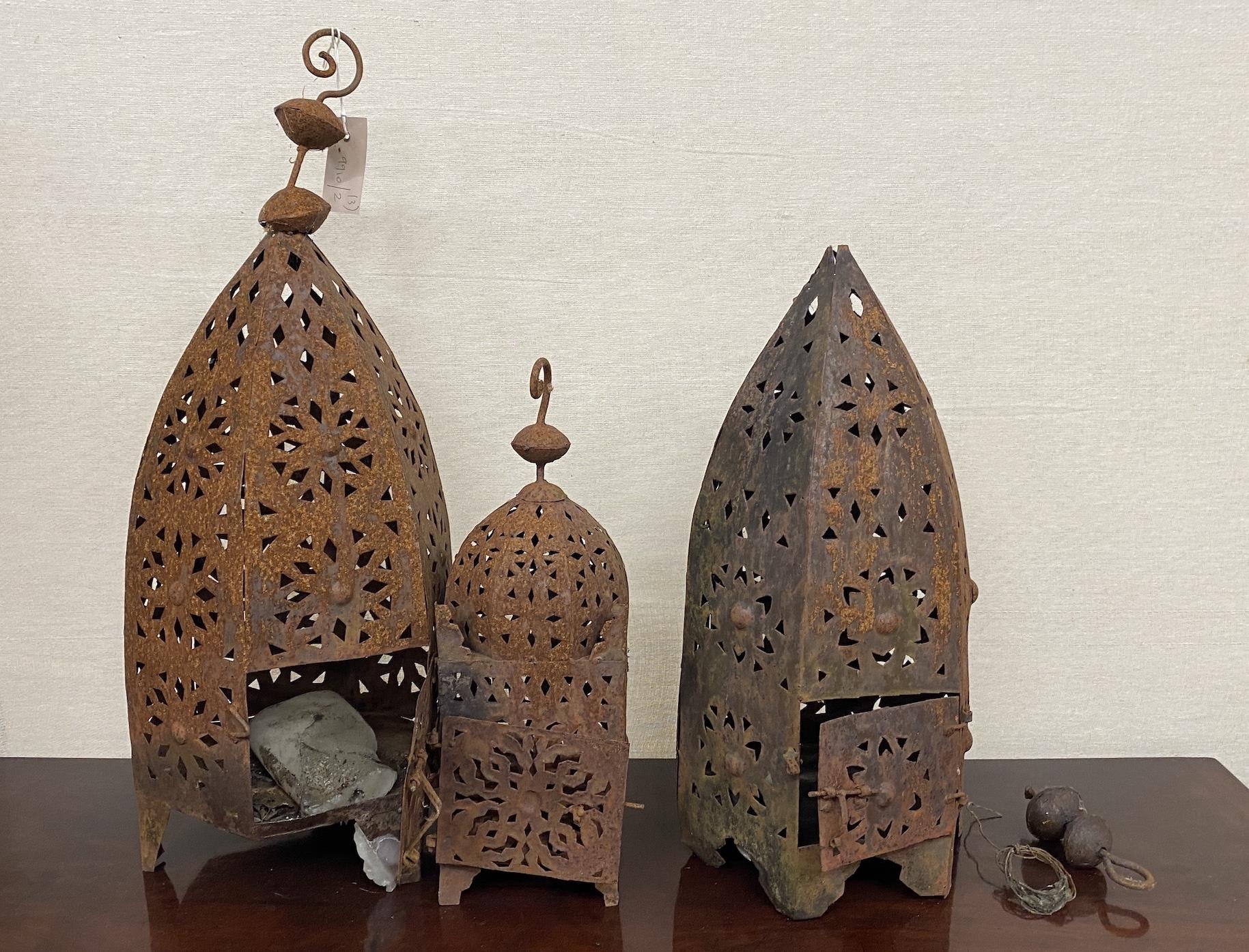 Three Moorish style weathered metal garden lanterns, largest height 60cm