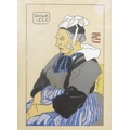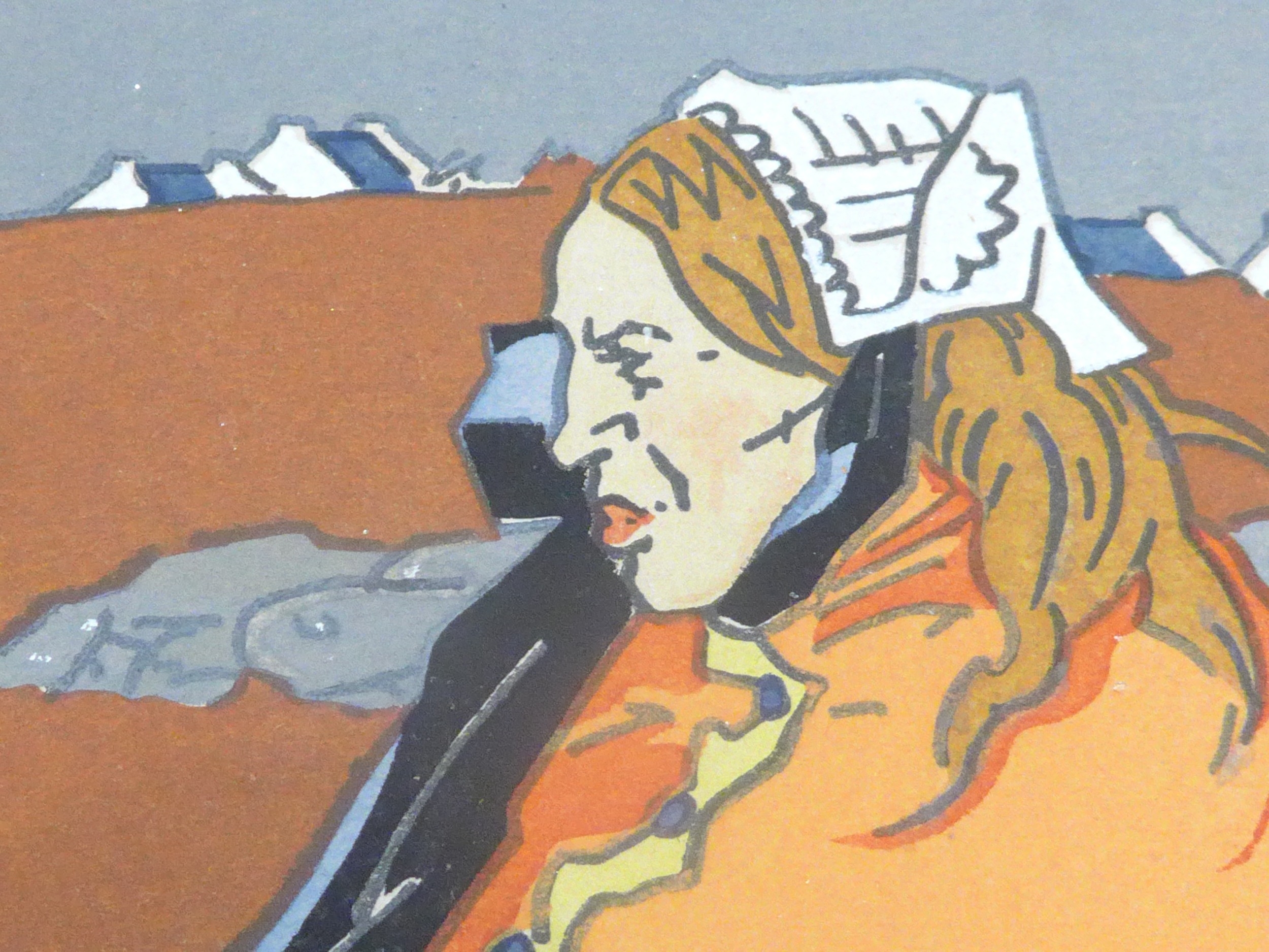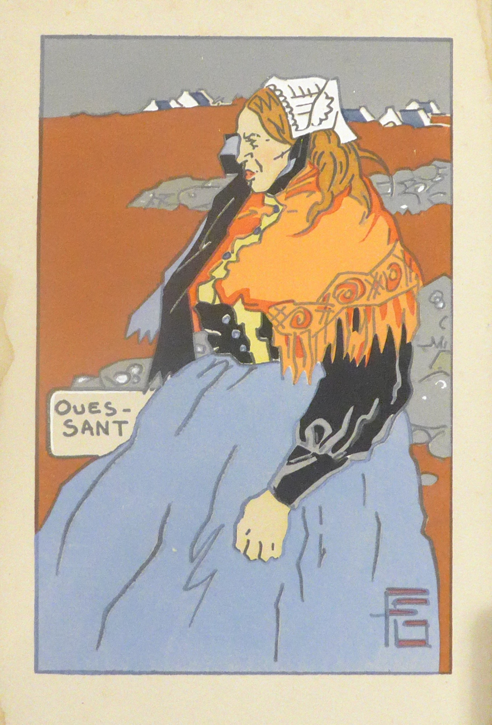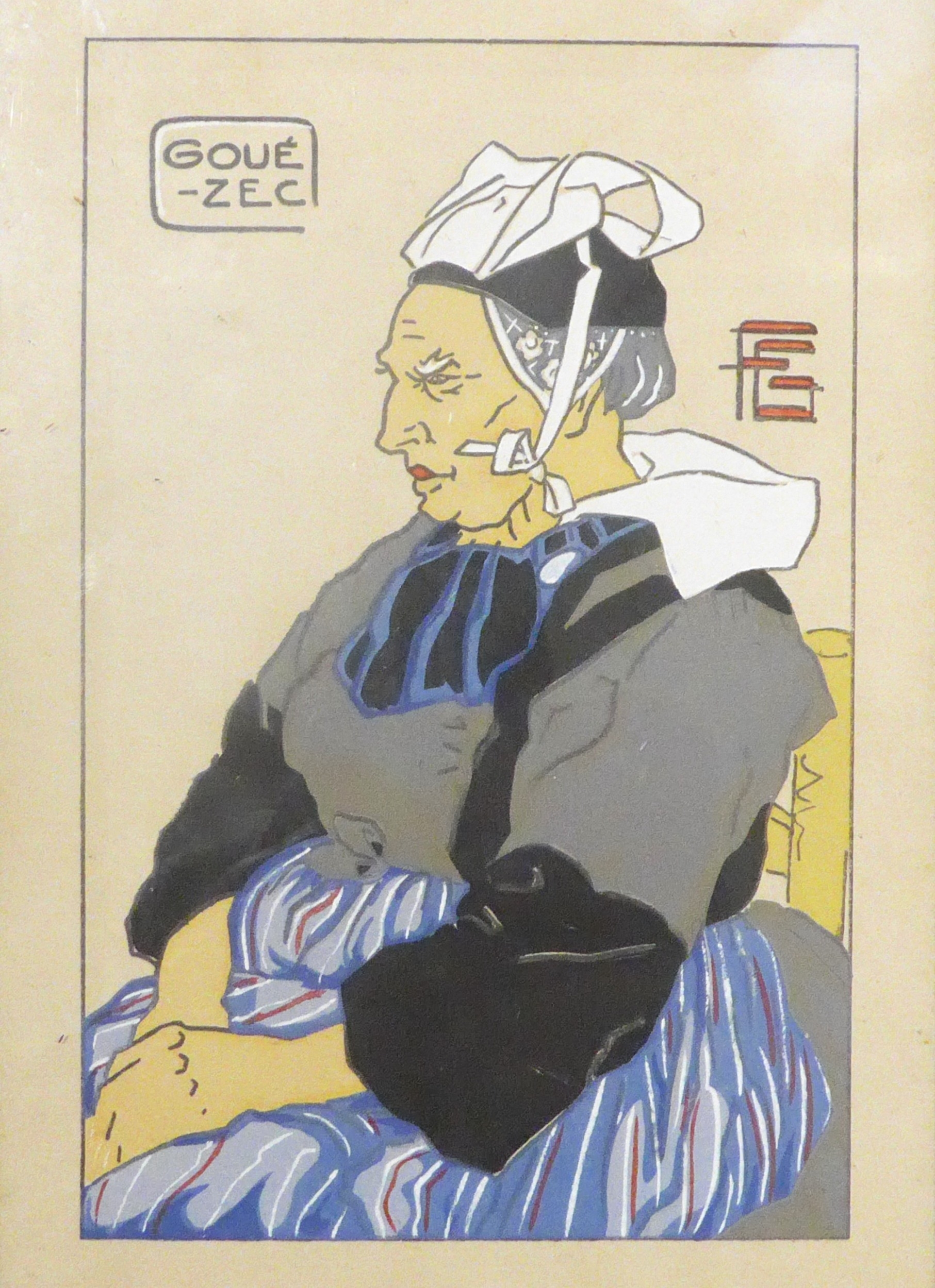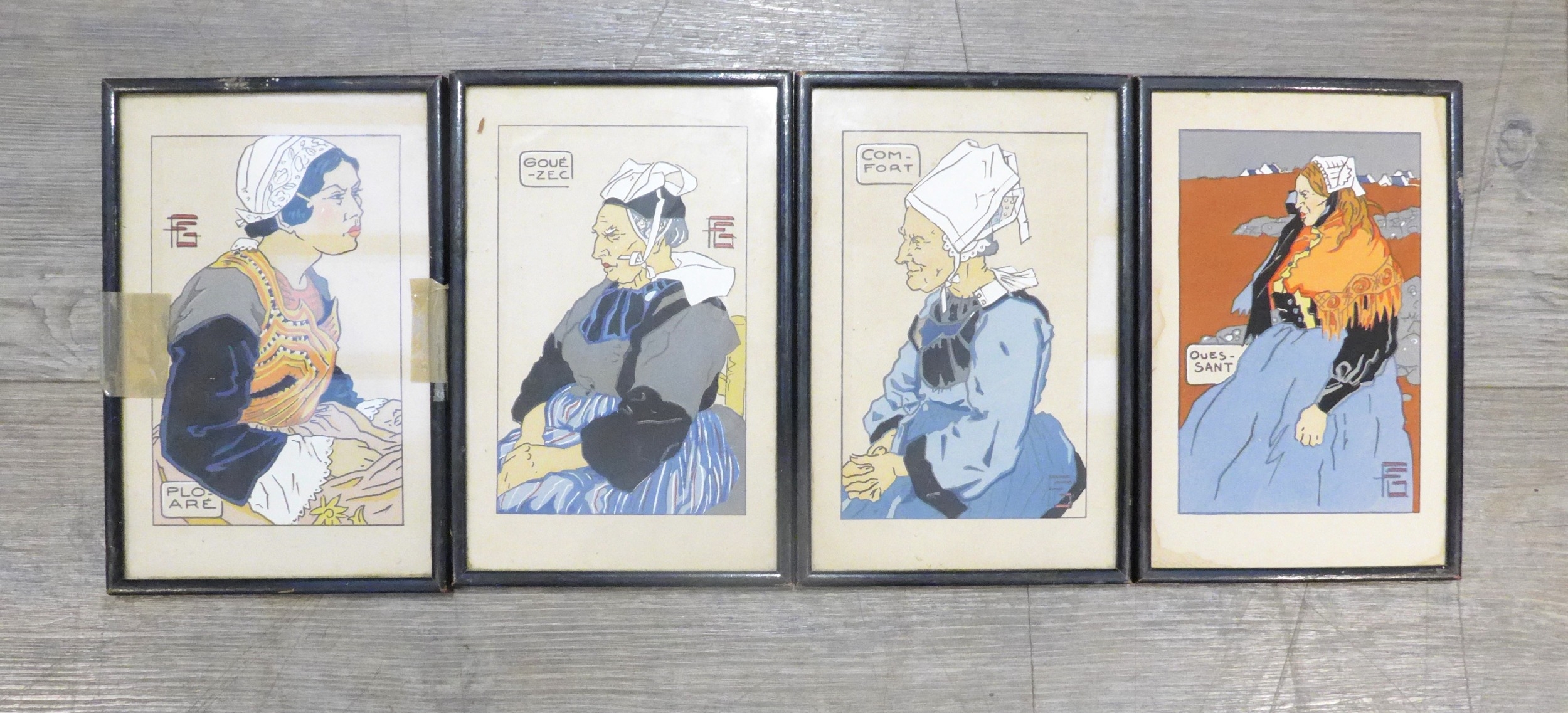 Four stencil hand coloured prints from Georges Geo-Fourrier (1898-1966) portraits series including 'Ploare', 'Ouessant', 'Gouezec' and 'Comfort'. Three framed and glazed, one in frame only. Image sizes 22.3cm x 14.3cm