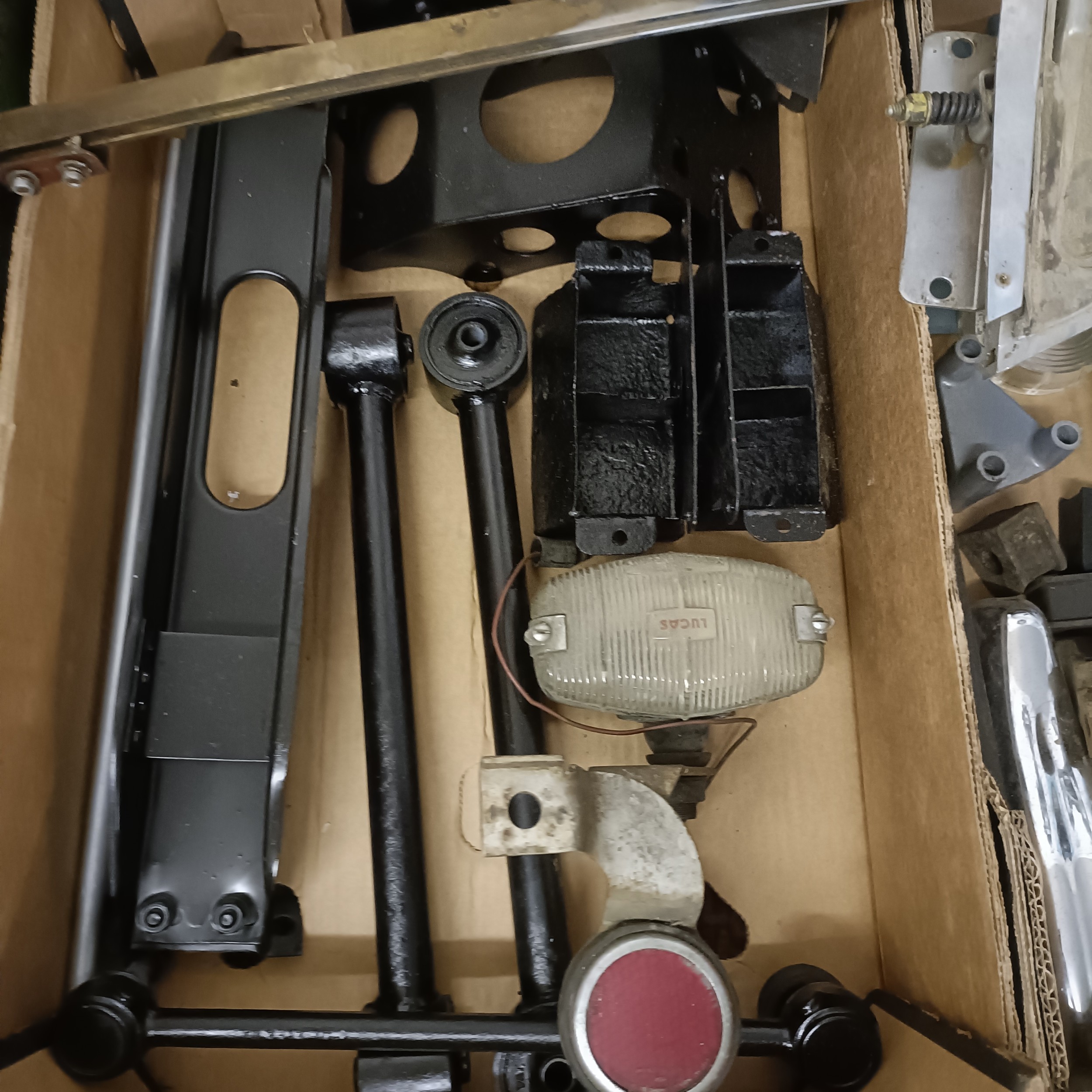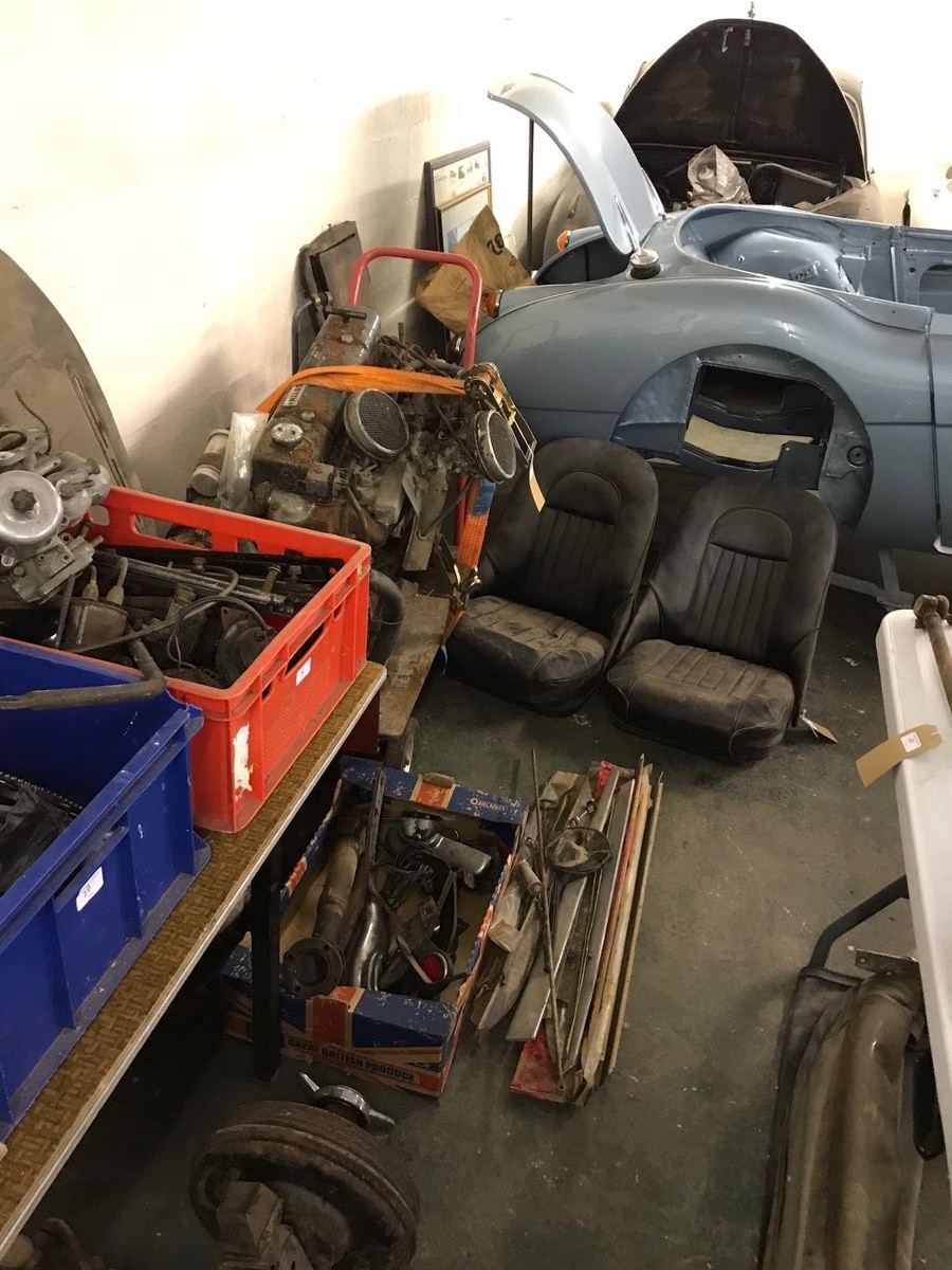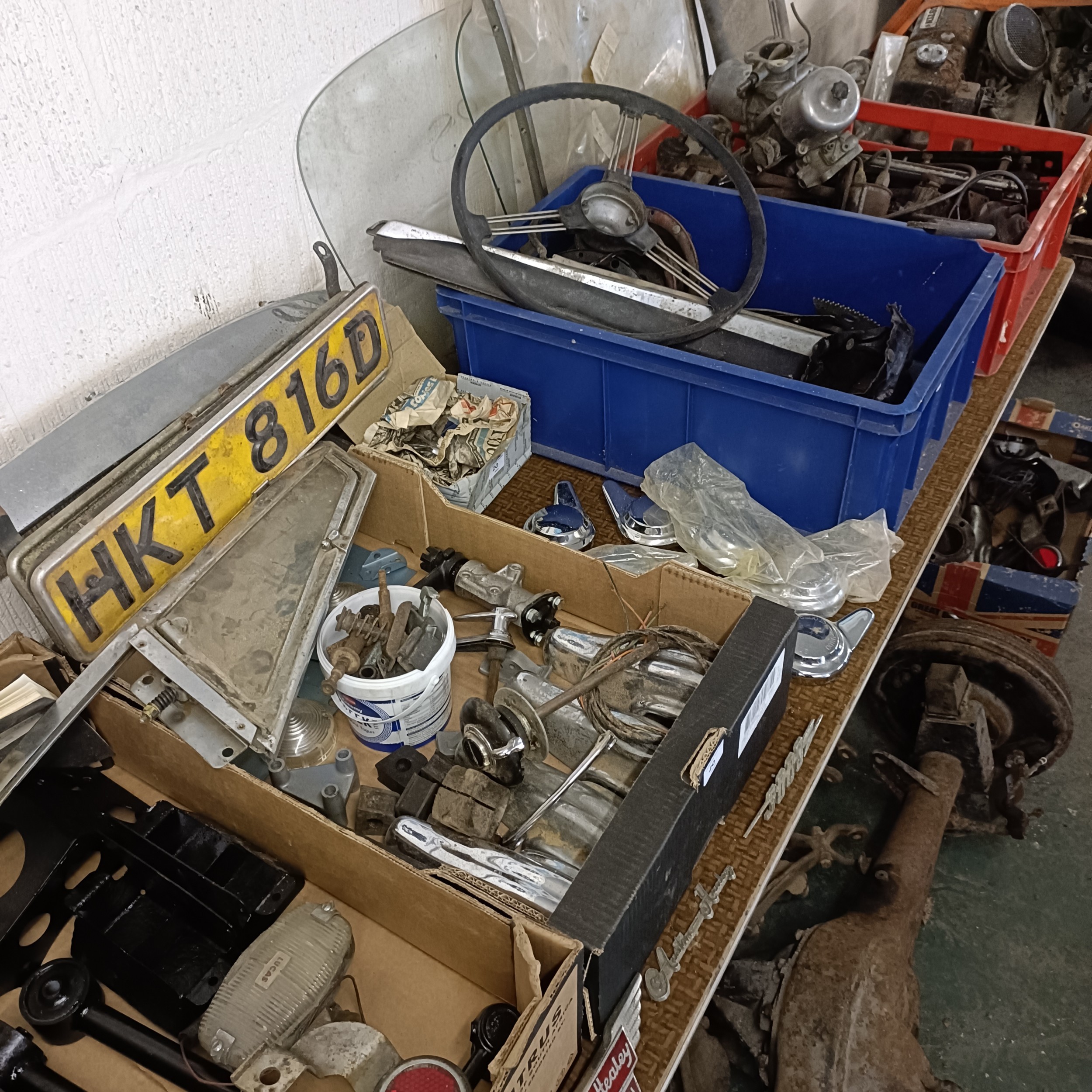 With a large number of Austin-Healey 3000 parts briefly including an engine, gearbox, windscreen, hood frame, seats, trim, radiator, rear axle, walnut dashboard, badges, windows, bumpers, front grill and door cards which were all found in various rooms on numerous shelves throughout the property, please refer to images for an overall view but note there are no wheels