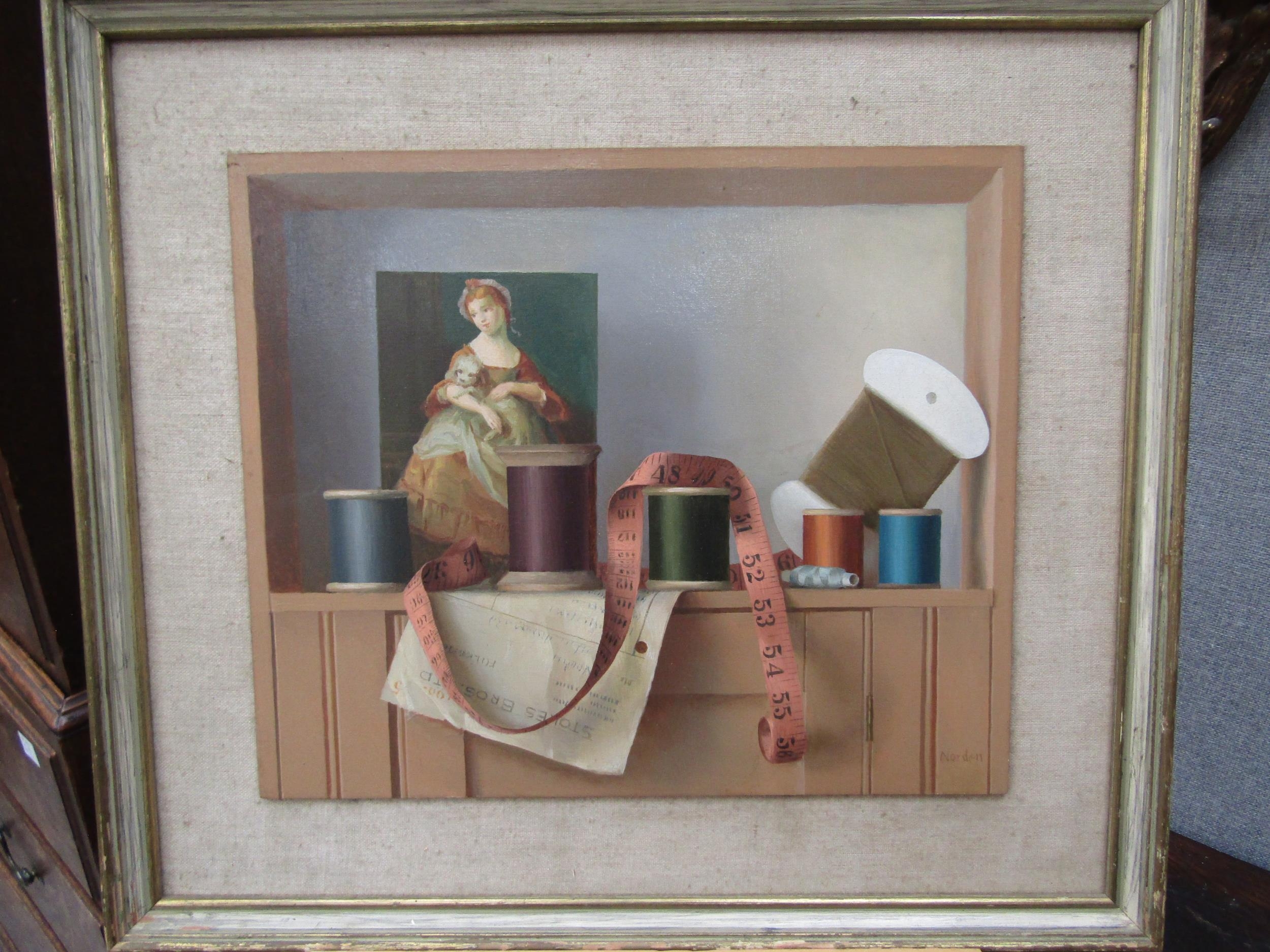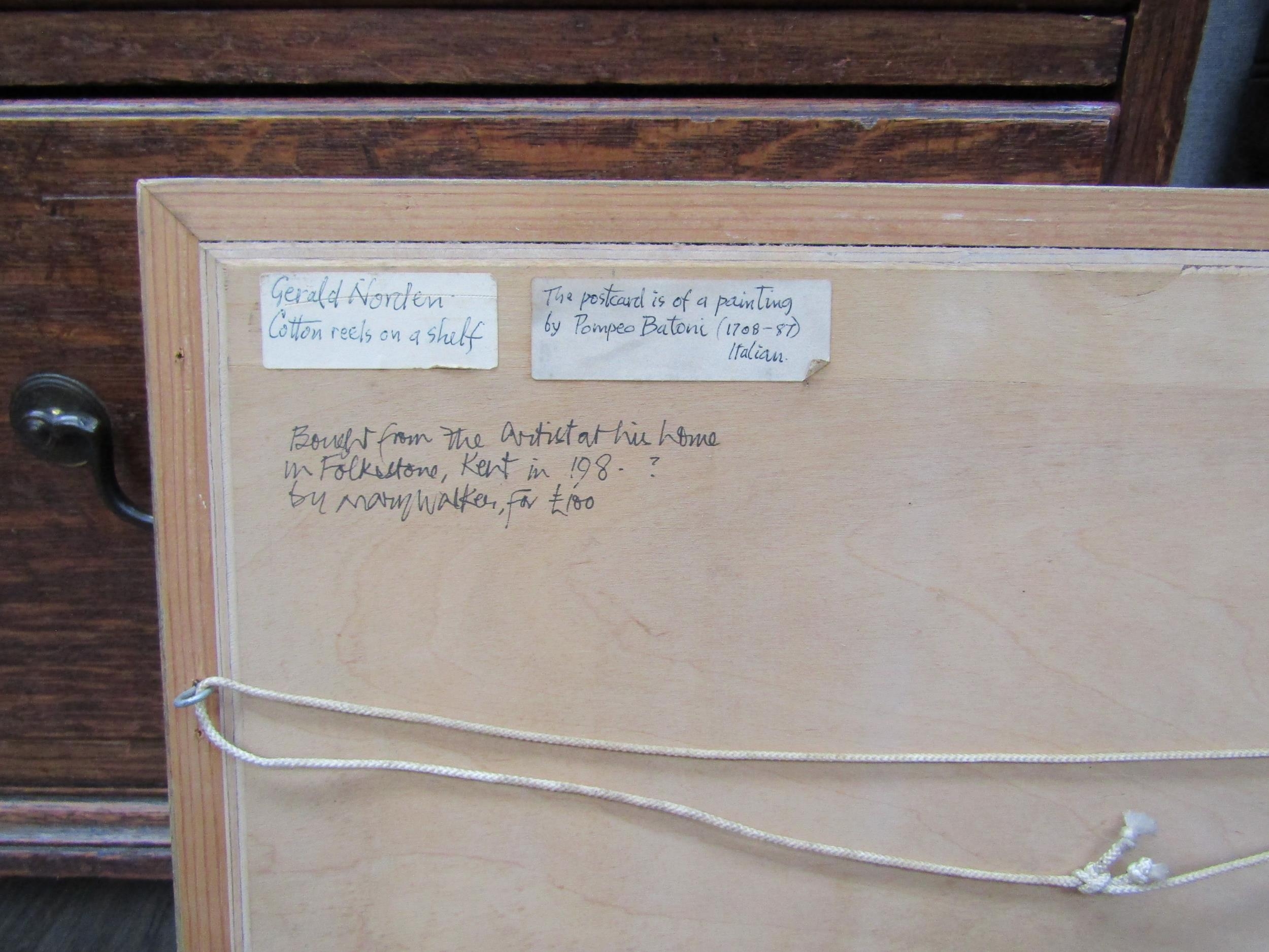 GERALD NORDEN (1912-2000): Cotton reels on a shelf, oil on board, 28cm x 33cm (R) £150 GALLERY