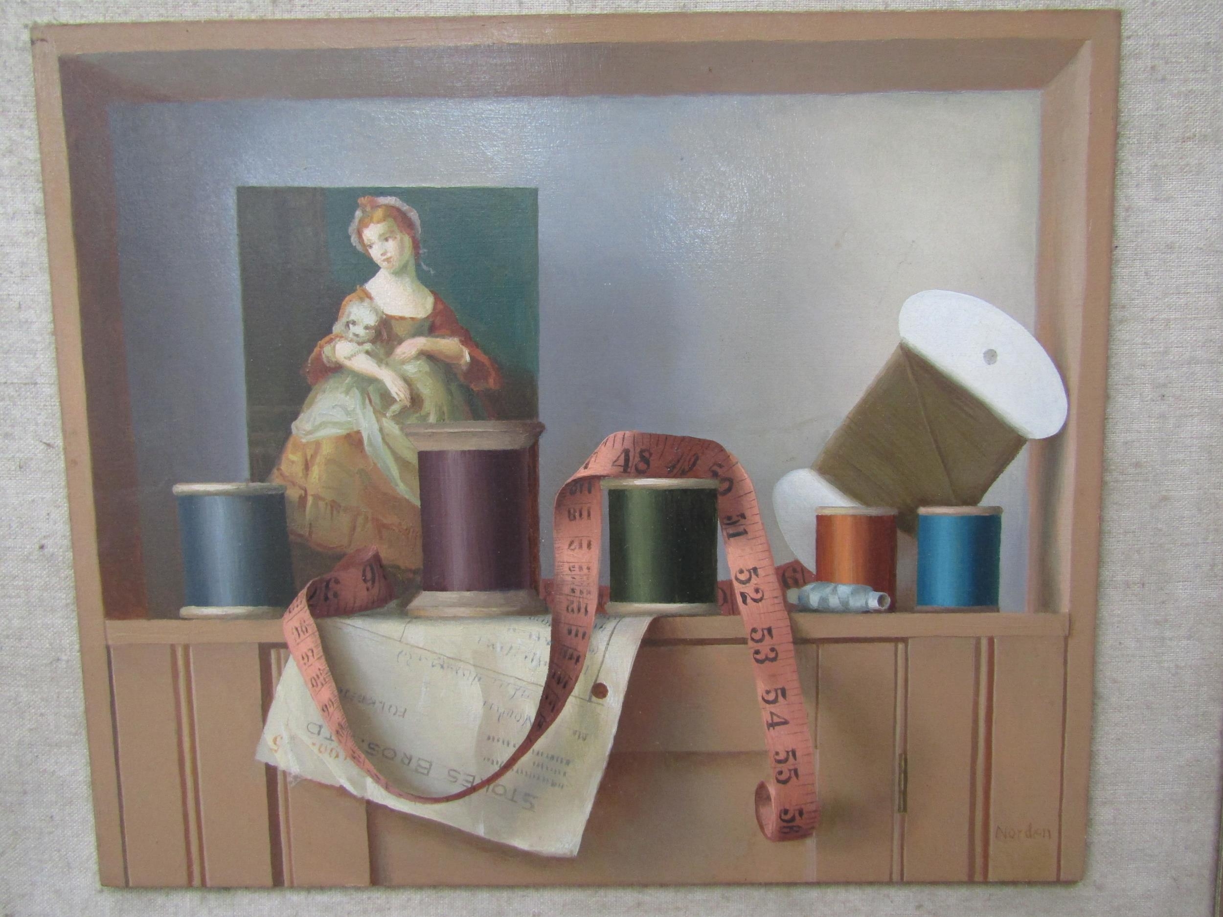 GERALD NORDEN (1912-2000): Cotton reels on a shelf, oil on b...