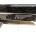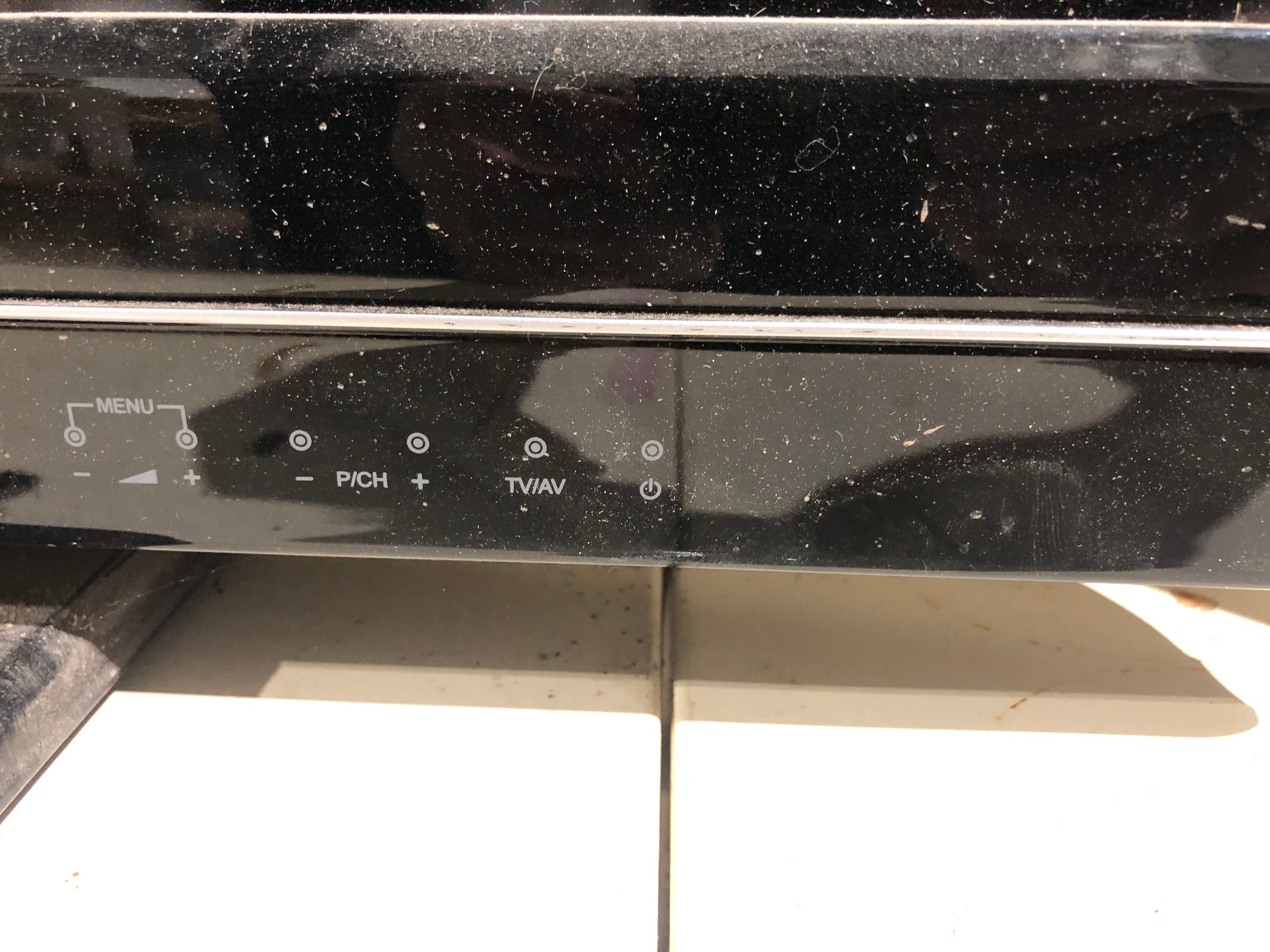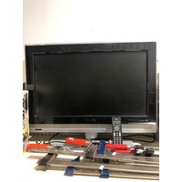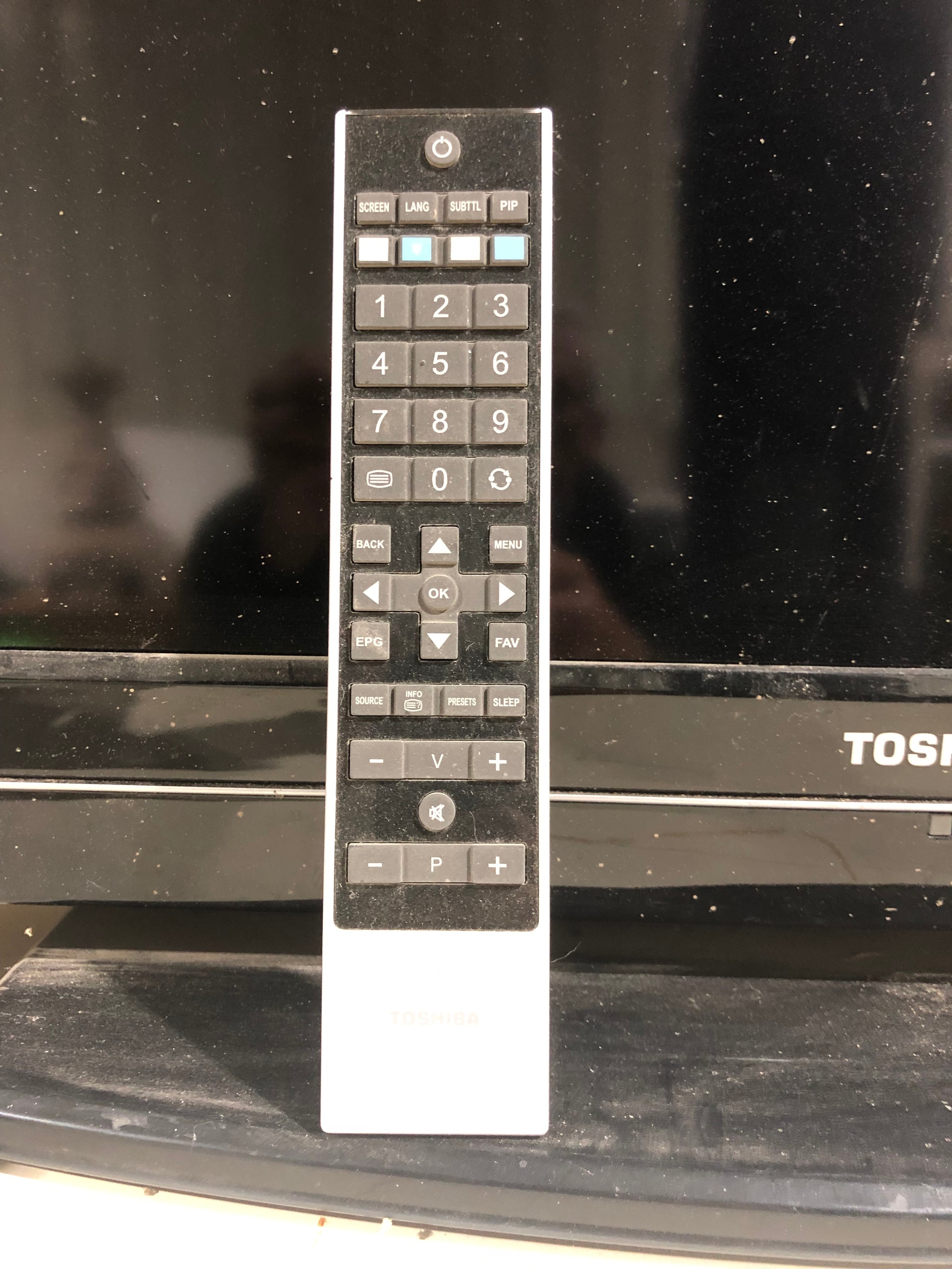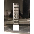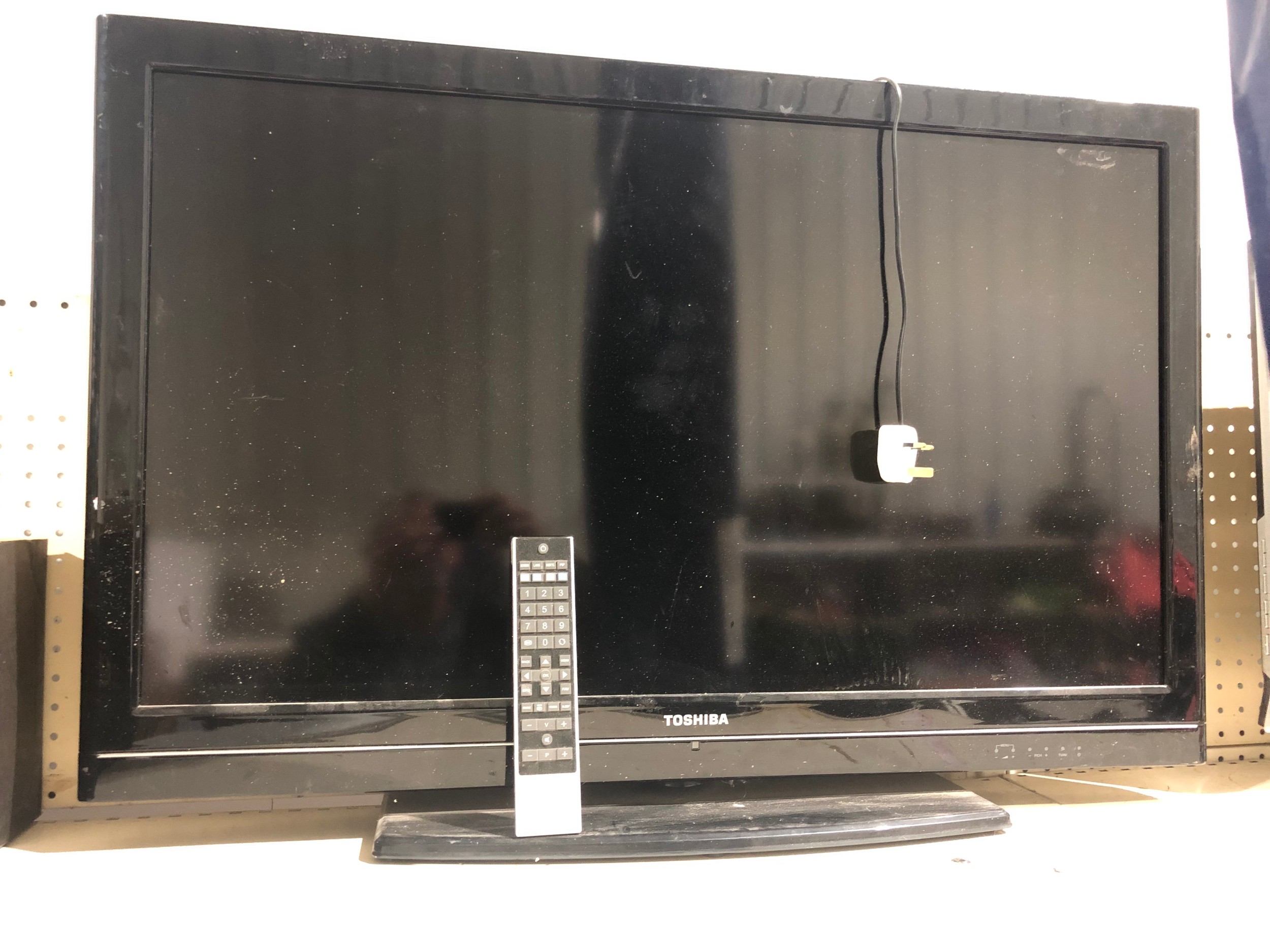 TV with remote control on stand. Working