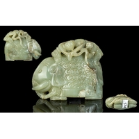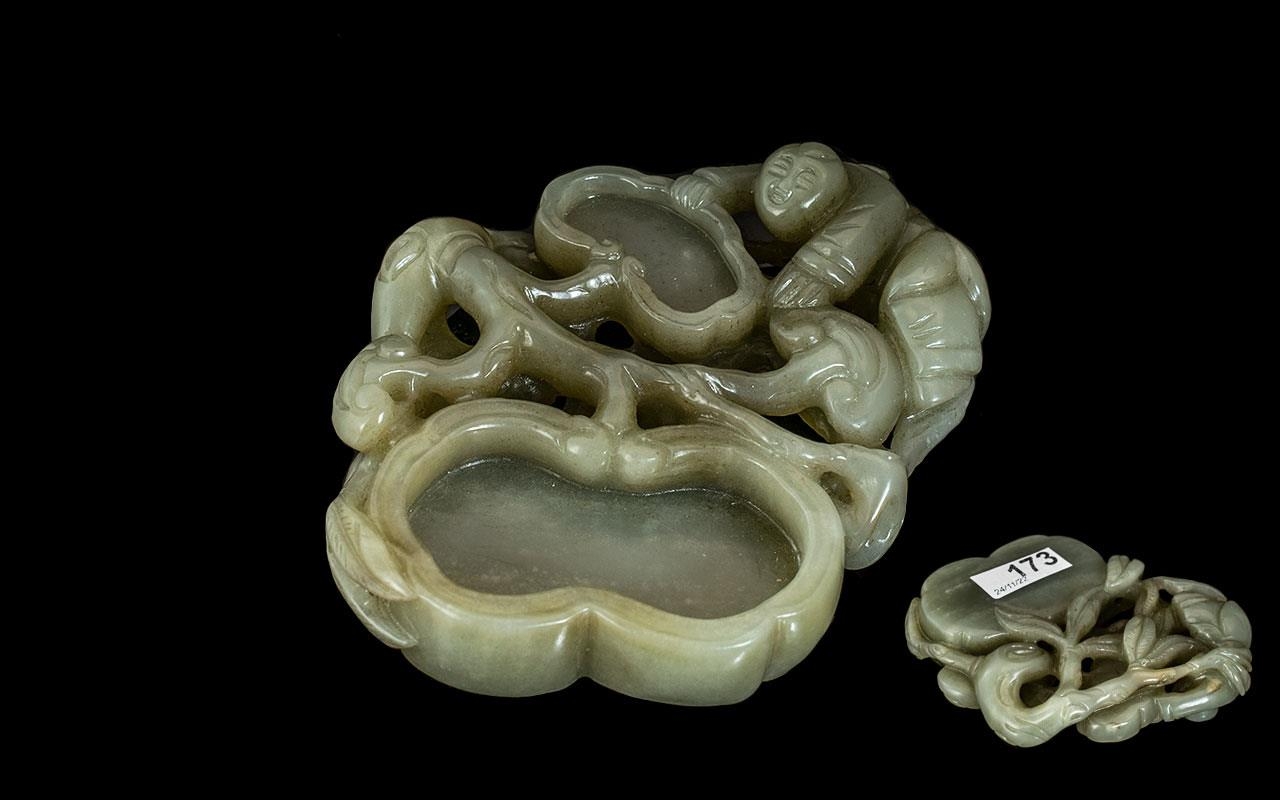 Chinese Quianlong Period 1711 - 1799 Green Jade Inkwell / Brush Pot with Boy and Lilies. Length 11 cms.