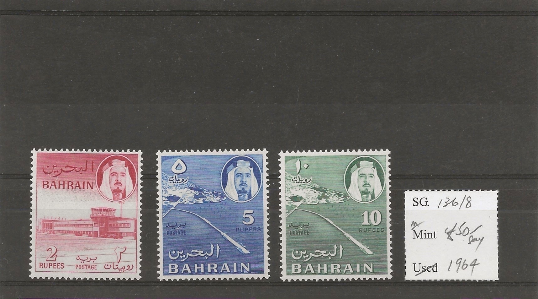 Bahrain 1964 2r. carmine-red, 5r Ultramarine, 10r. Myrtle-green, top three values, (SG 136/8) m/m Cat £50