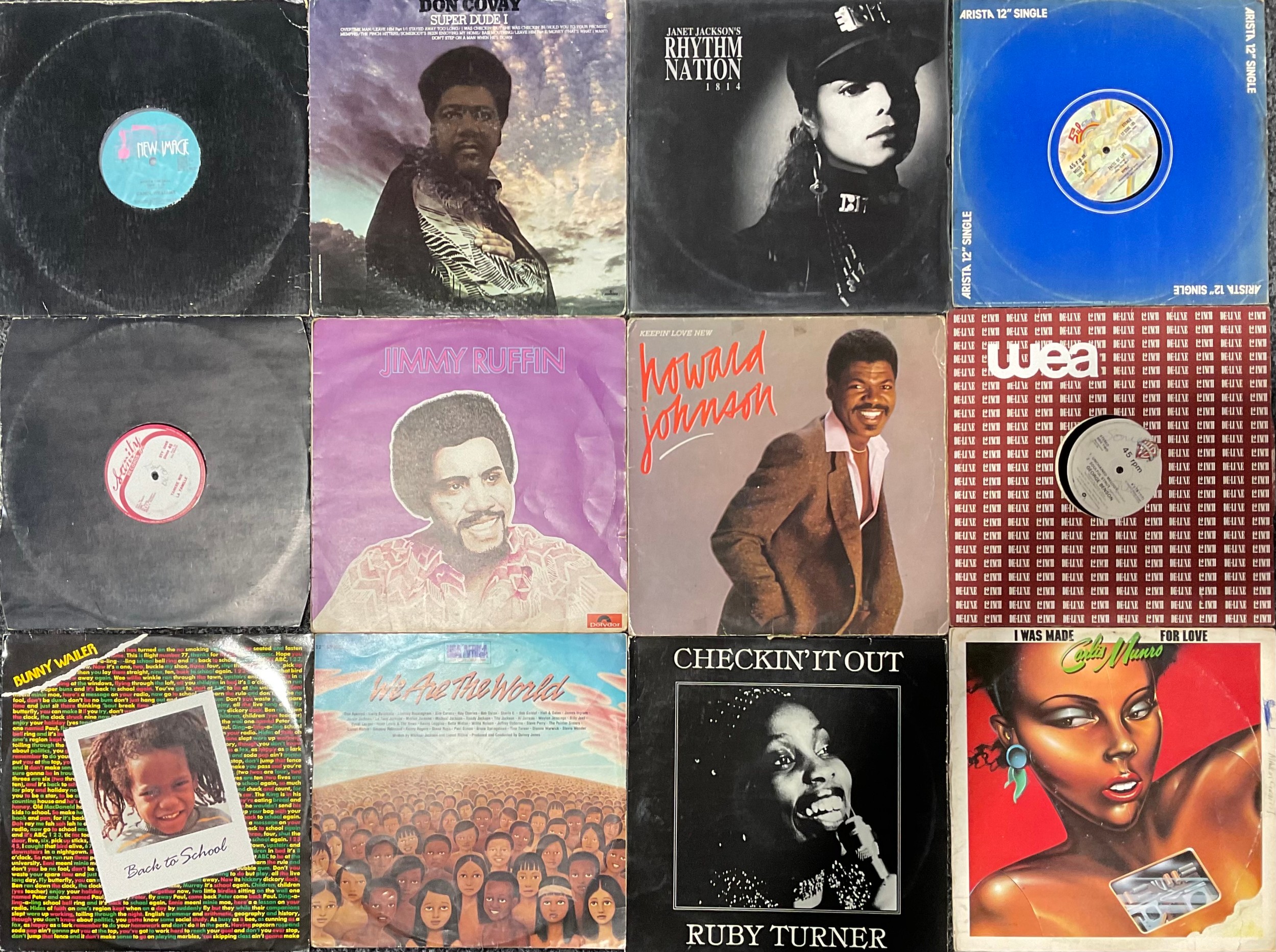 Vinyl Records – Reggae, Soul, Disco LP’s and 12” Singles – Including Carol Williams – What's The Deal – NIR1133; Don Covay – Super Dude I - SRM-1-653; Janet Jackson – Rhythm Nation 1814 - AMA3920; Ripple – The Beat Goes On And On – 12SSOL 105; La Famille – All Night Long – STY 006; Jimmy Ruffin – Jimmy Ruffin – 2383 240; Howard Johnson – Keepin' Love New – AMLH 64895; George Benson – Turn Your Love Around – K17877; Carlis Munro – I Was Made For Love – WT6106; Ruby Turner – Checkin’ It Out – SF2; USA For Africa – We Are The World – USAID T1; Bunny Wailer – Back To School – SMT025 (12)