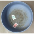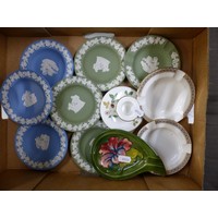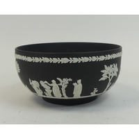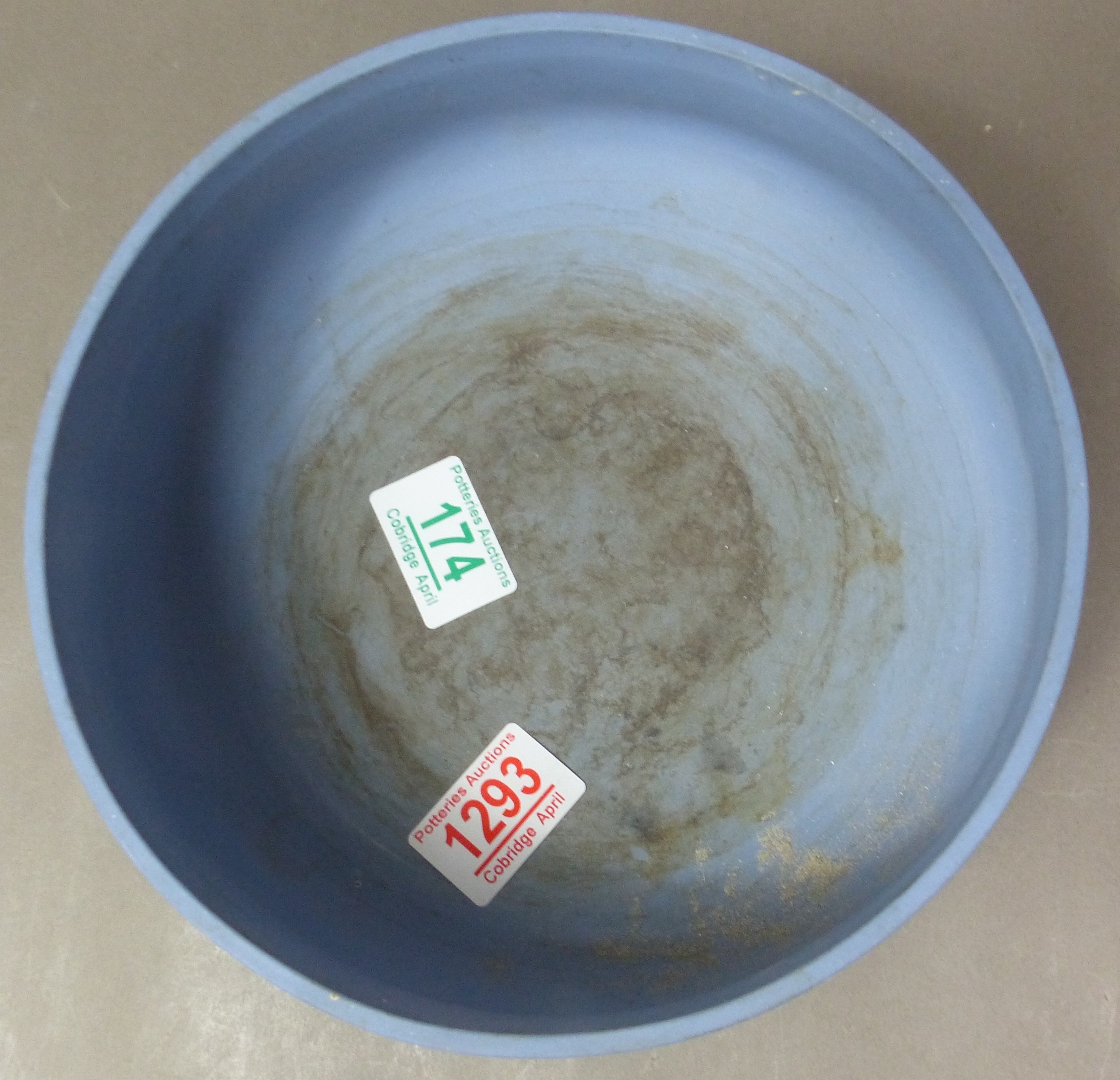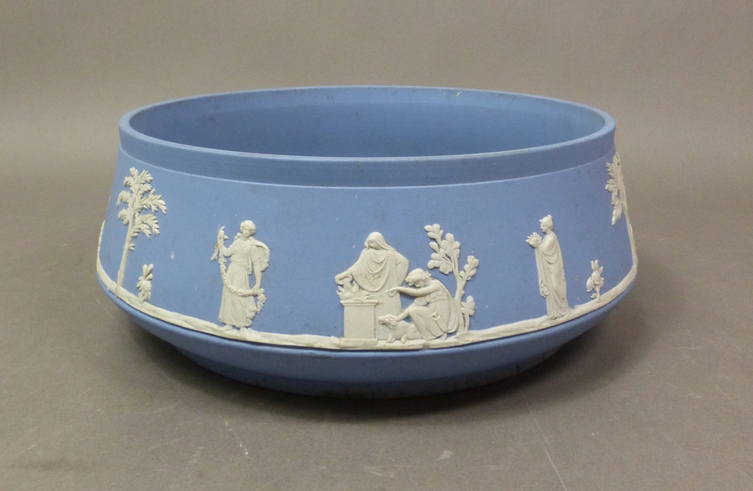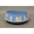 A Wedgwood fruit bowl in powder blue with white bas relief, in a less common shape, max diameter 22cm.