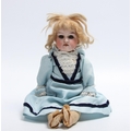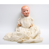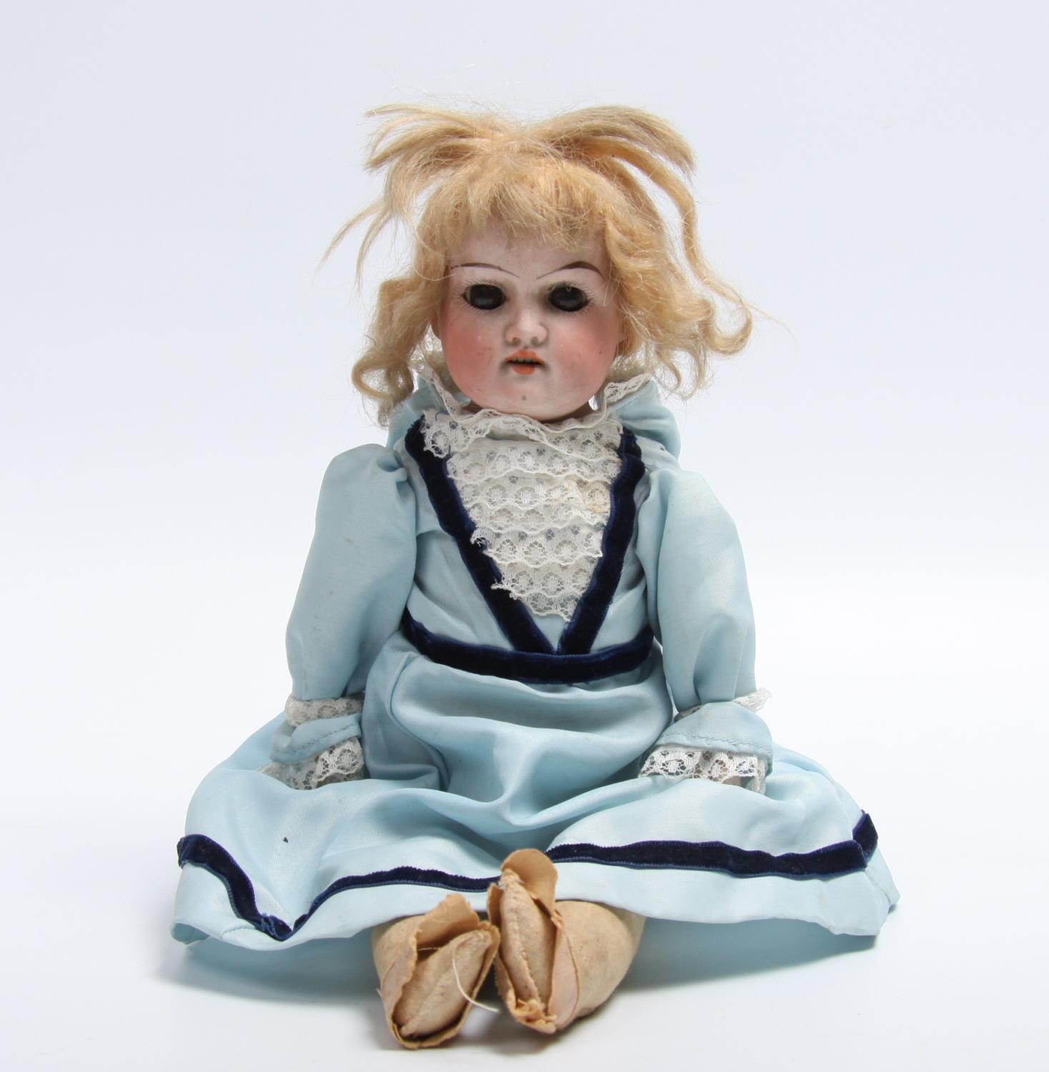 An Armand & Marseille bisque head doll, cloth body, sleeping brown glass eyes, open red lips revealing for small upper teeth, blonde wig, impressed marks '370. A.M 3/0X DEP Made in Germany', 36cm tall, (Faults)