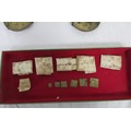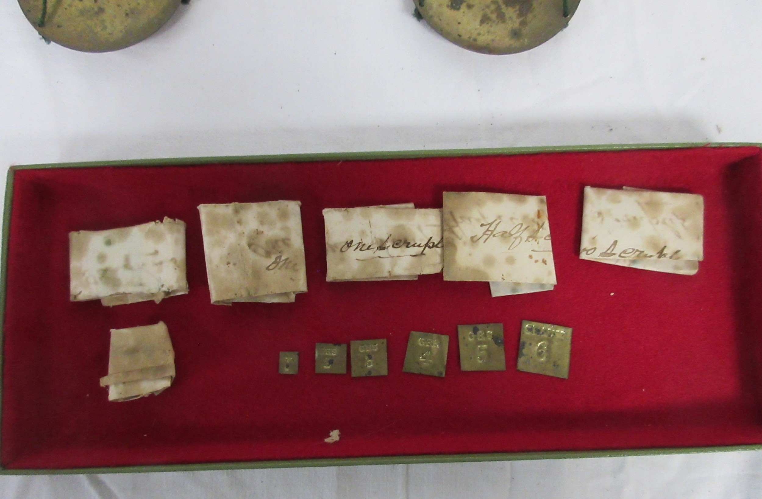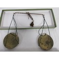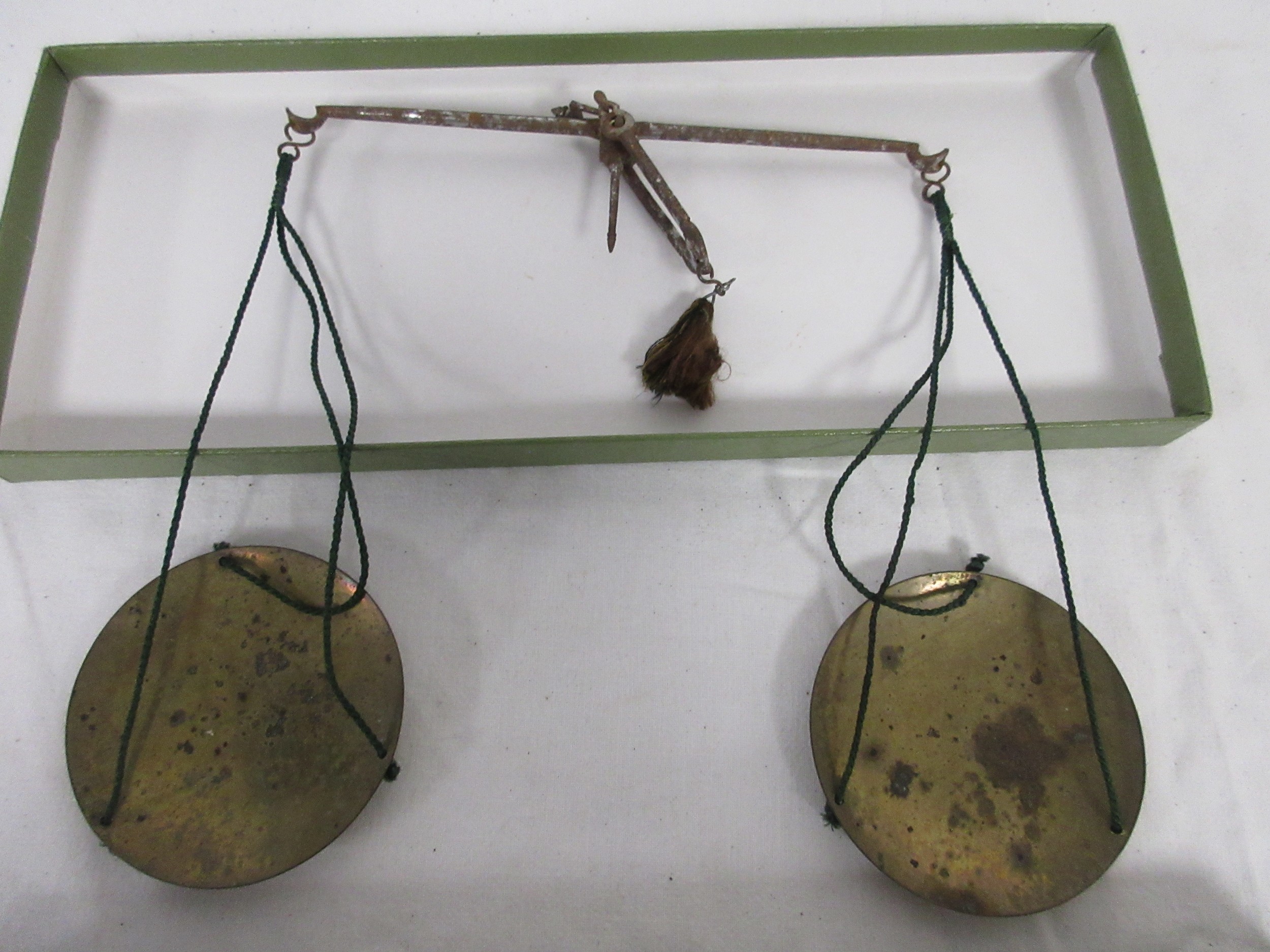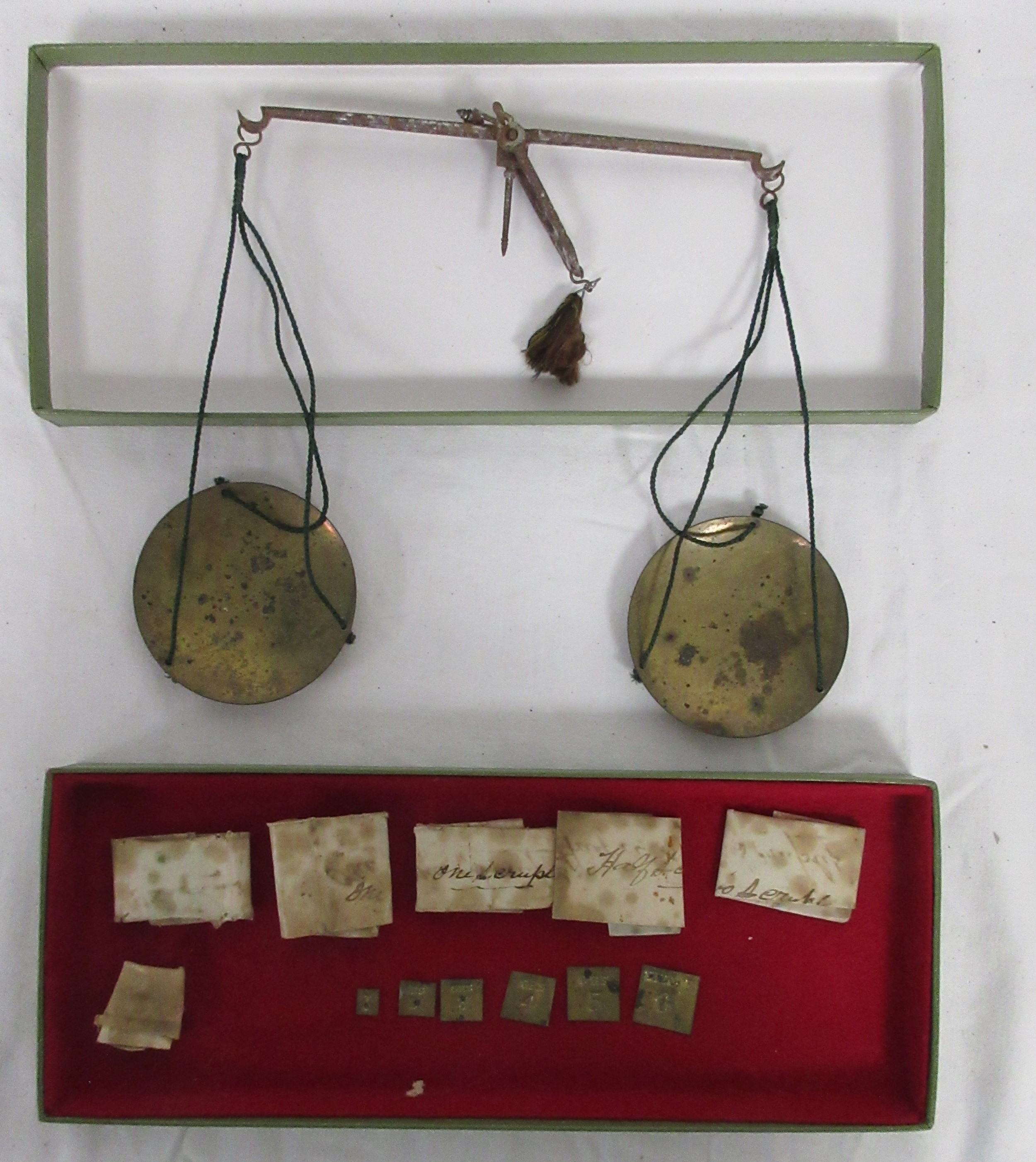 A set of antique apothecary steel balance scales with brass pans with scruple and grain weights