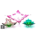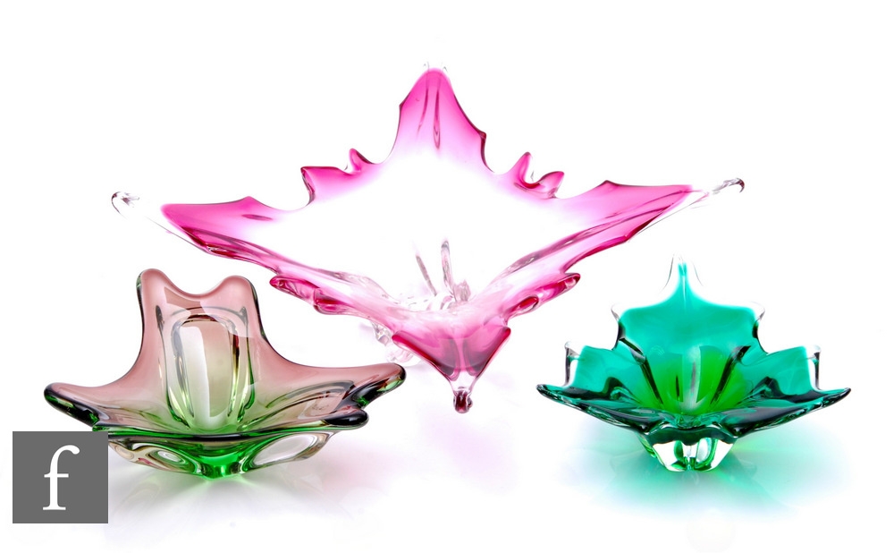 Josef Hospodka - Chribska - A 1960s Czechoslovakian glass bowl, rising from a wrythen foot and pulled, pink to clear, width 47cm, together with two smaller bowls in green. (3)