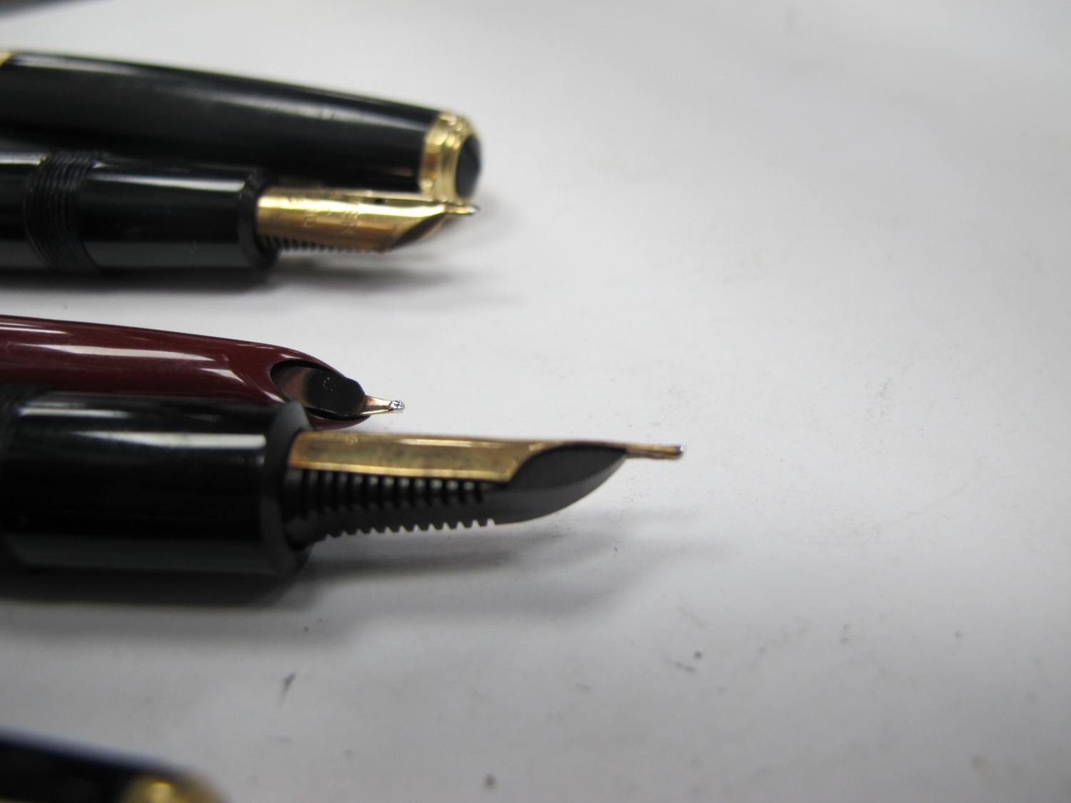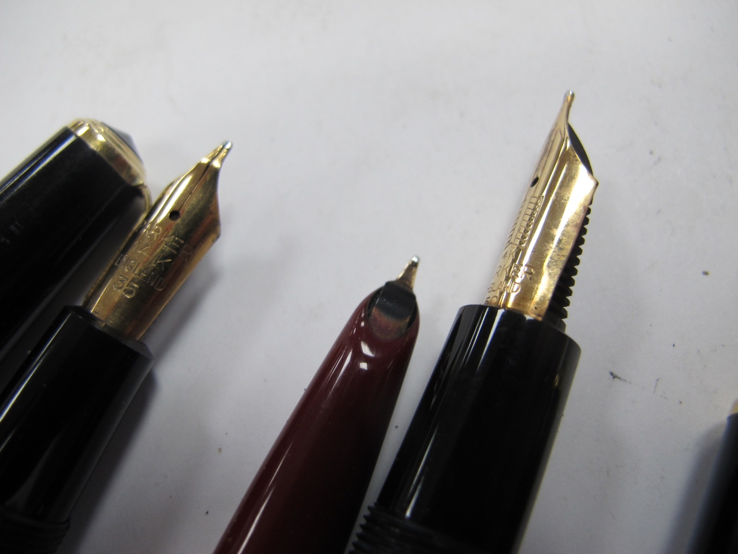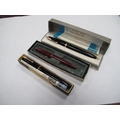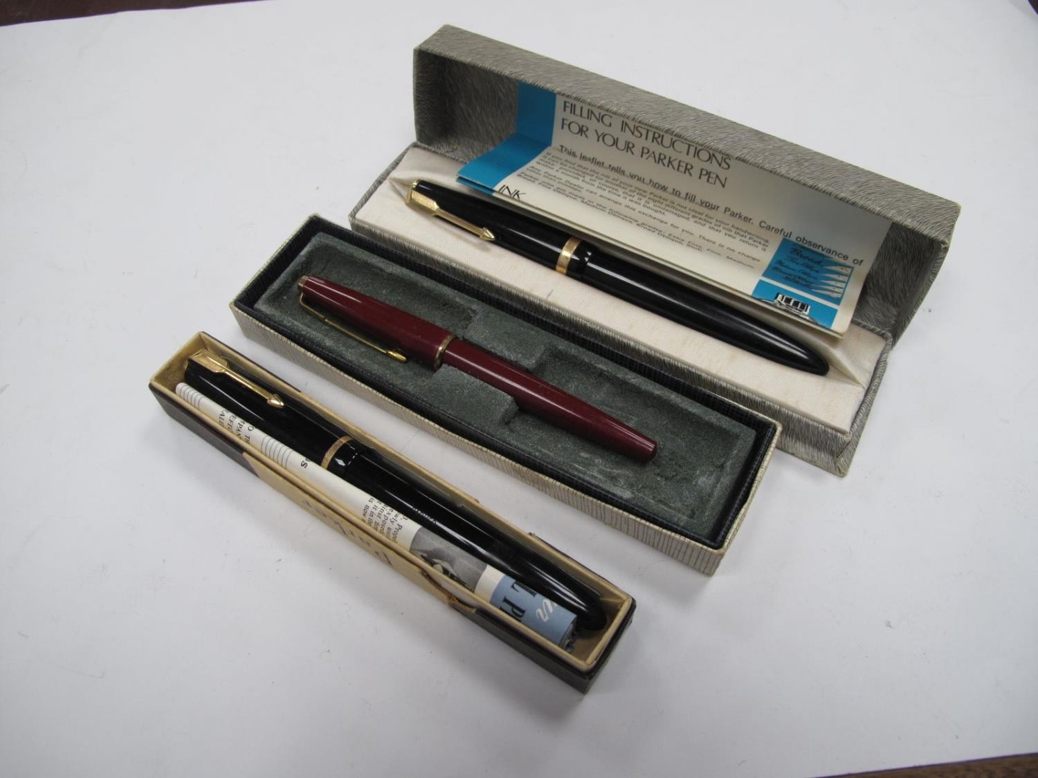 Parker Senior Duoflow 6, 14K nib, box and instructions; Parker Maxima Duofold, 14K nib, boxed and instructions (1969), Parker Pen, all press bar filling. (3)