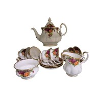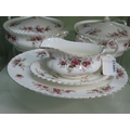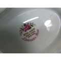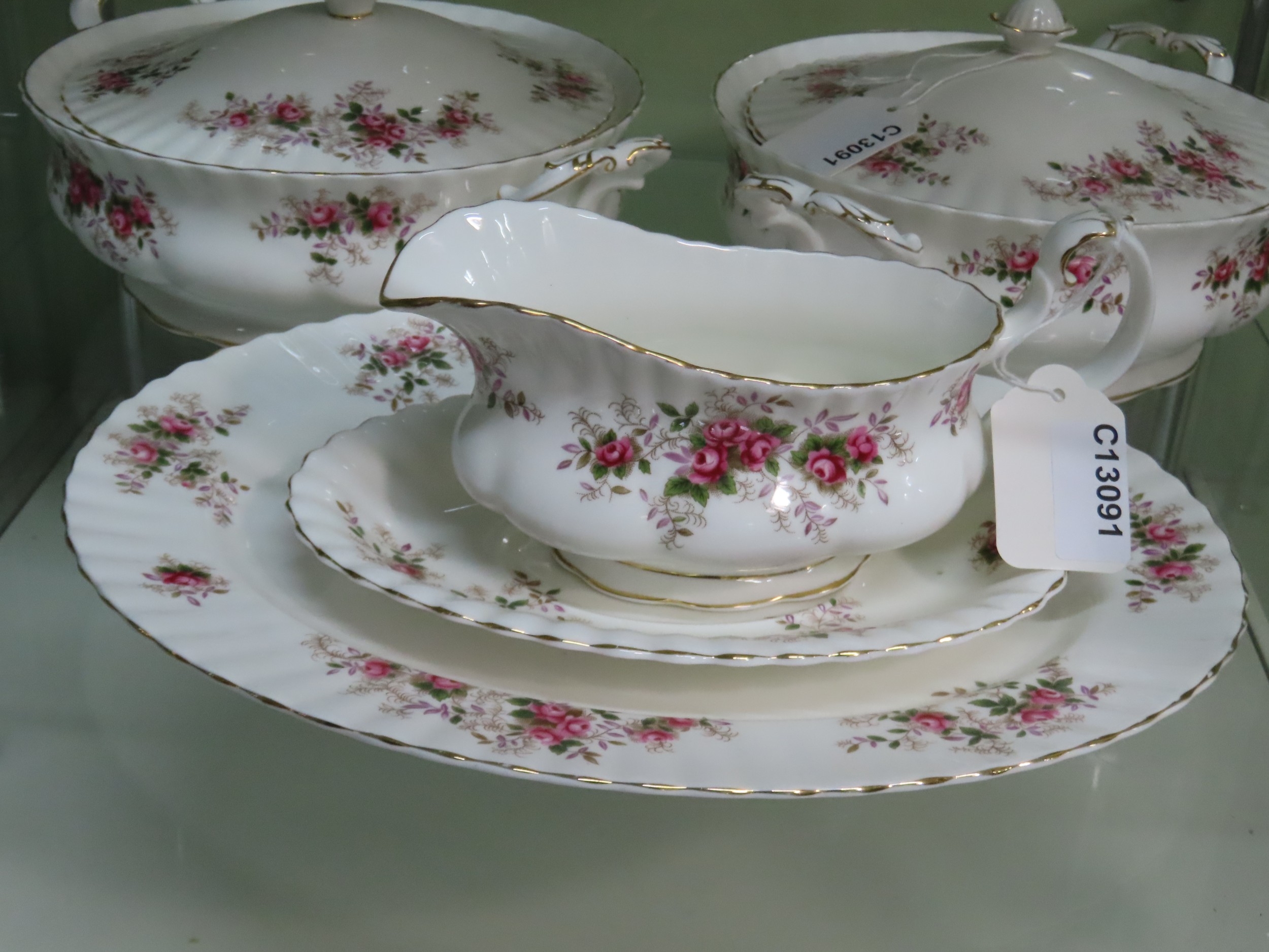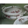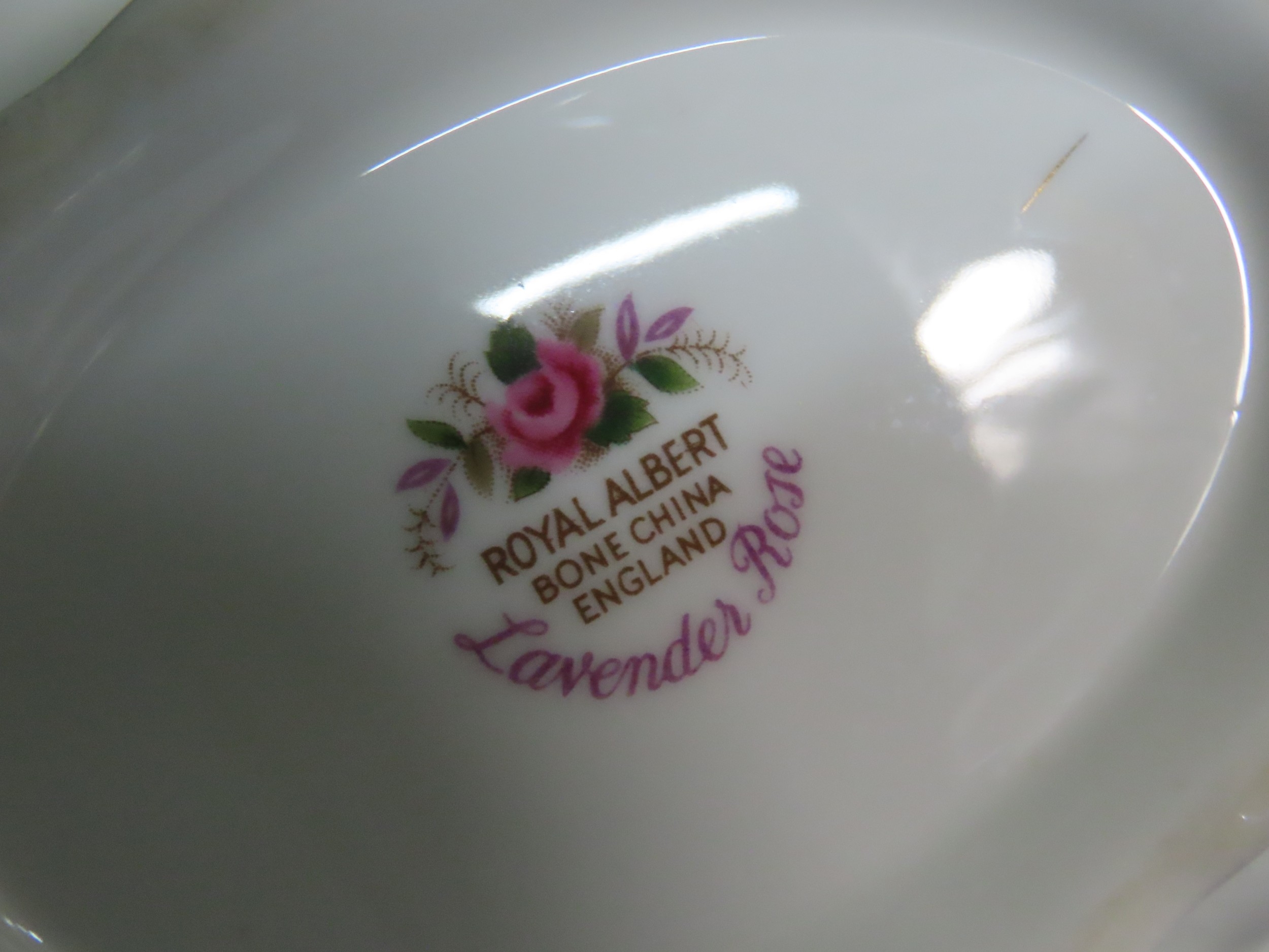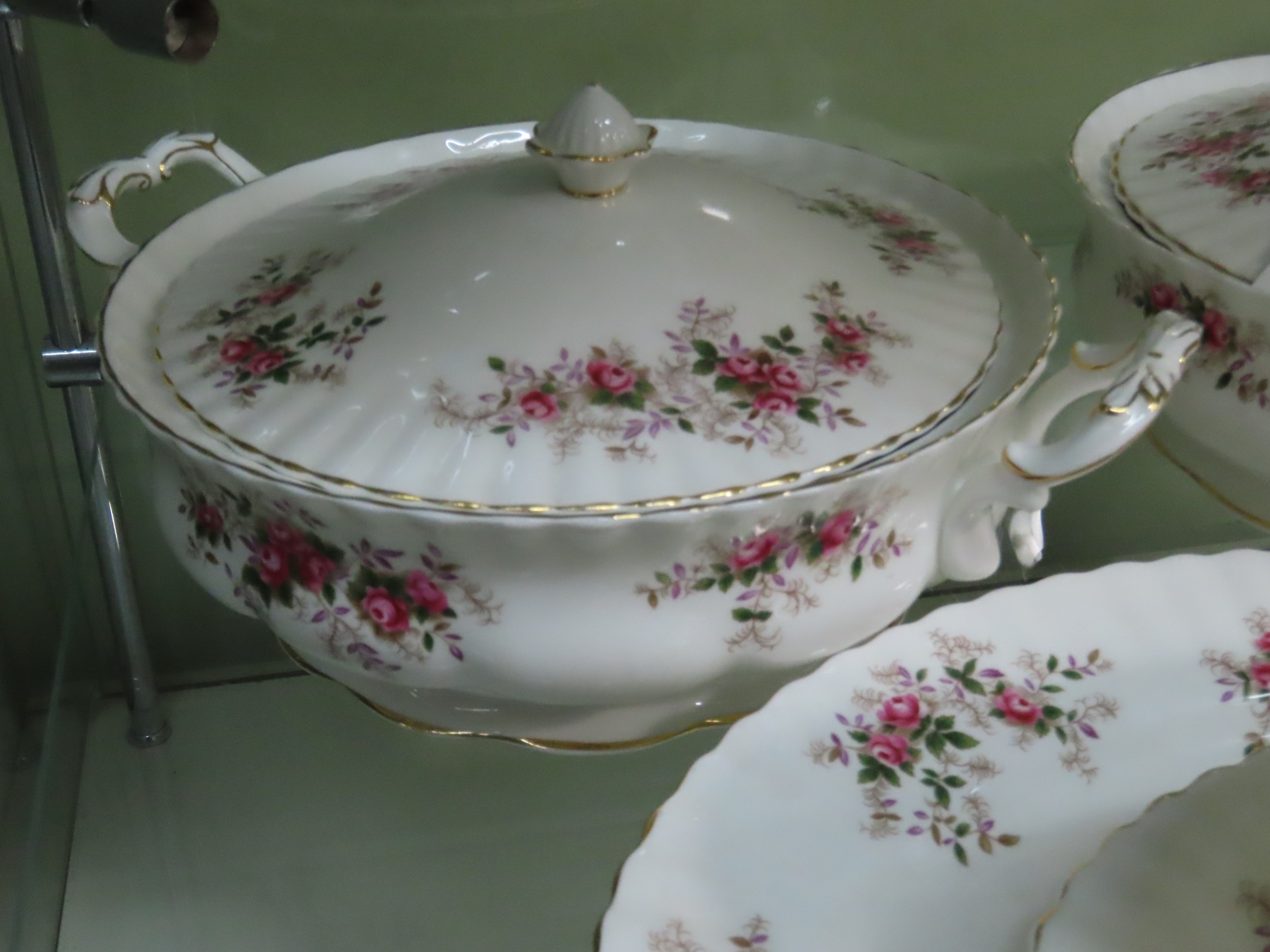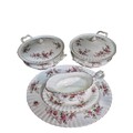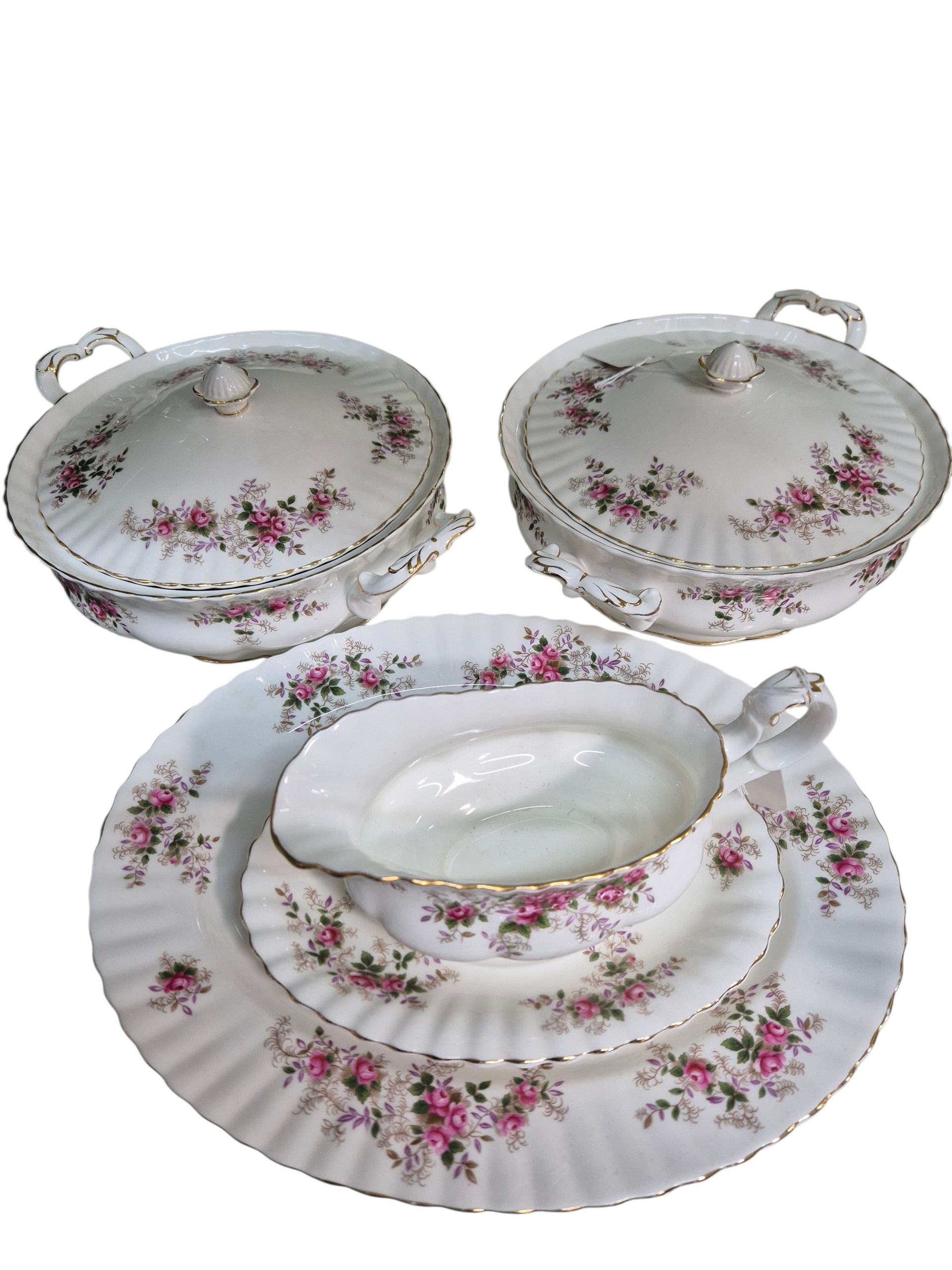 Royal Albert Lavender Rose serving pieces comprising five items, including two covered vegetable tureens, gravy boat and matching underplate and an oval serving platter, all with gilt rim decoration.