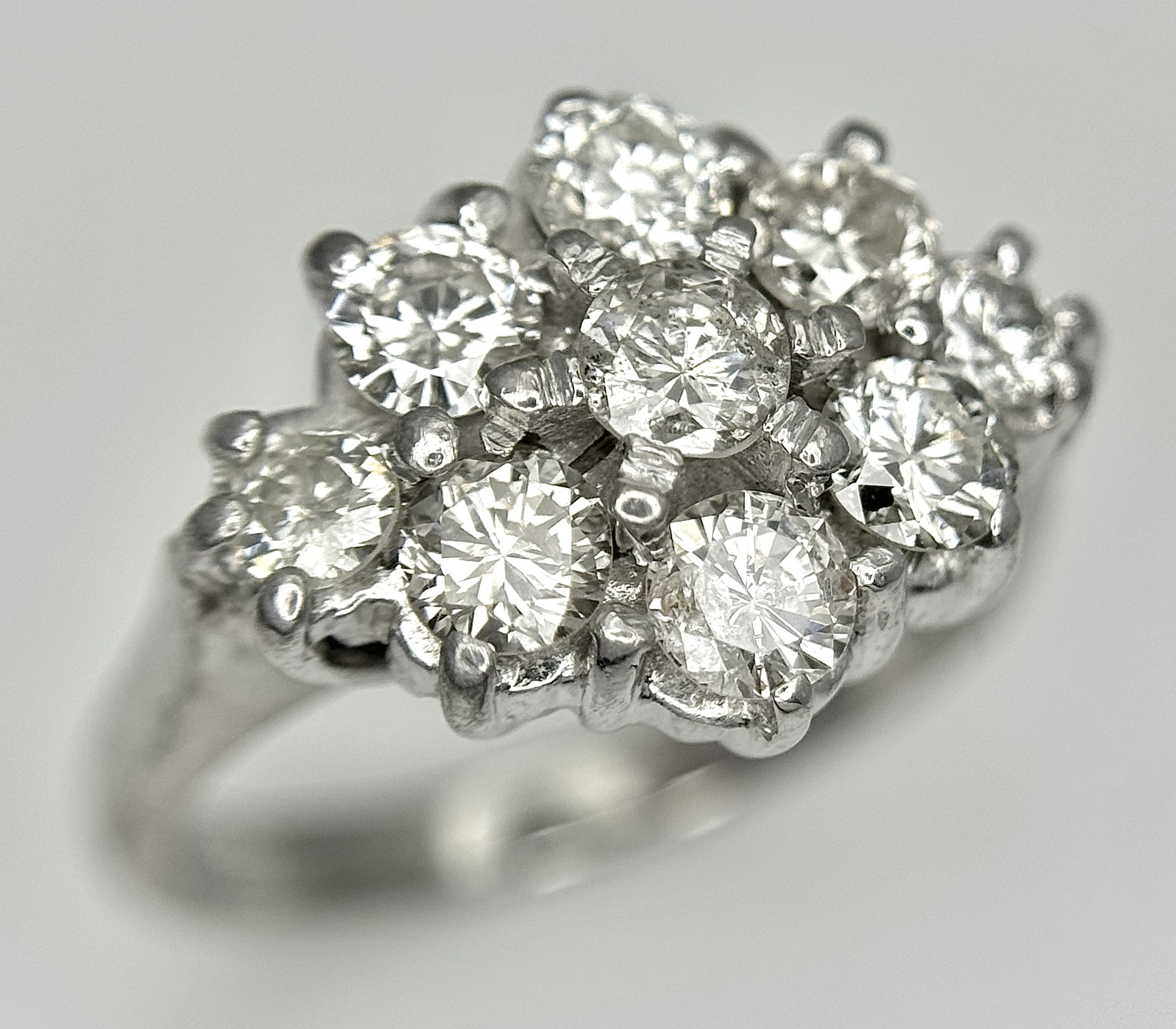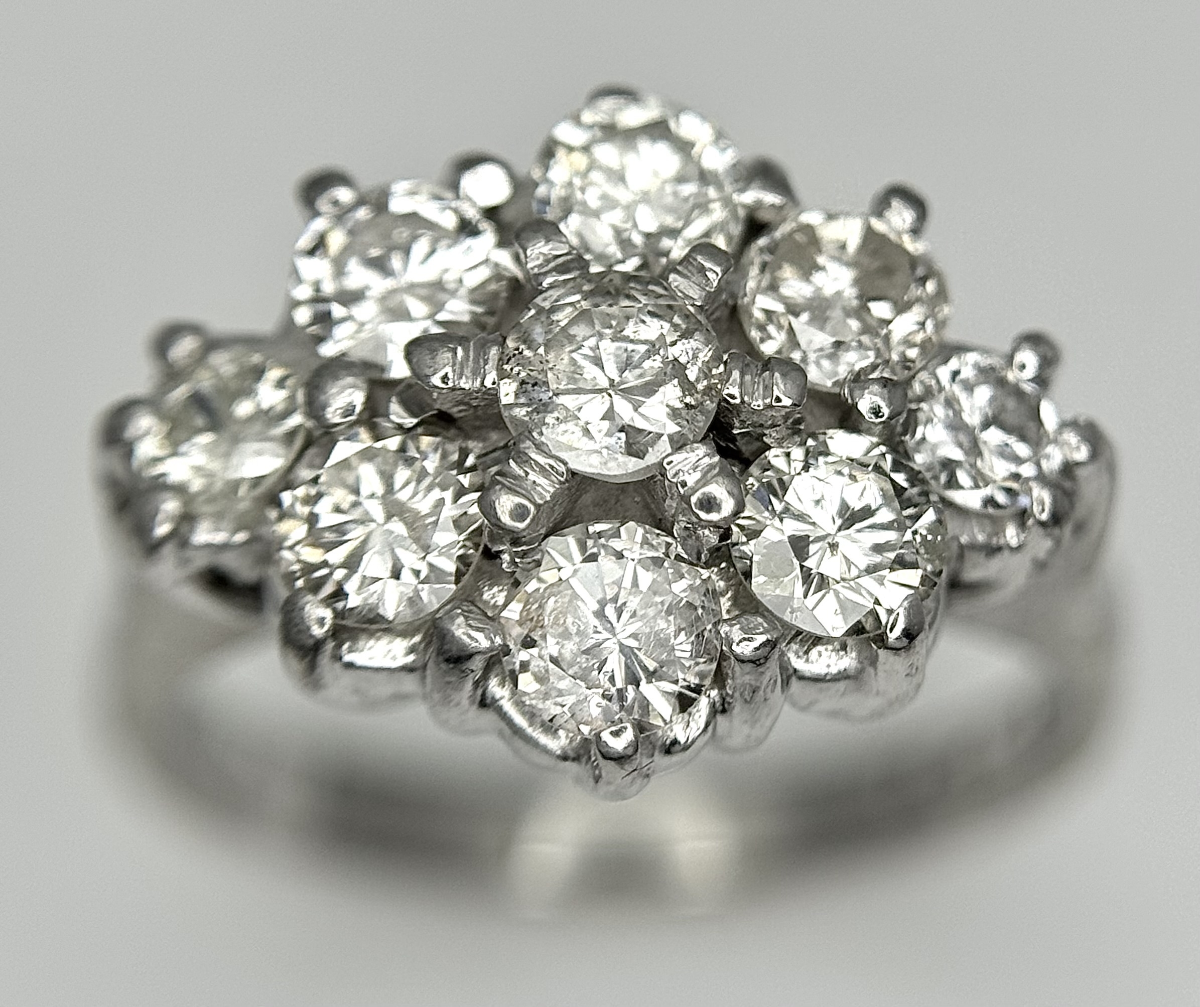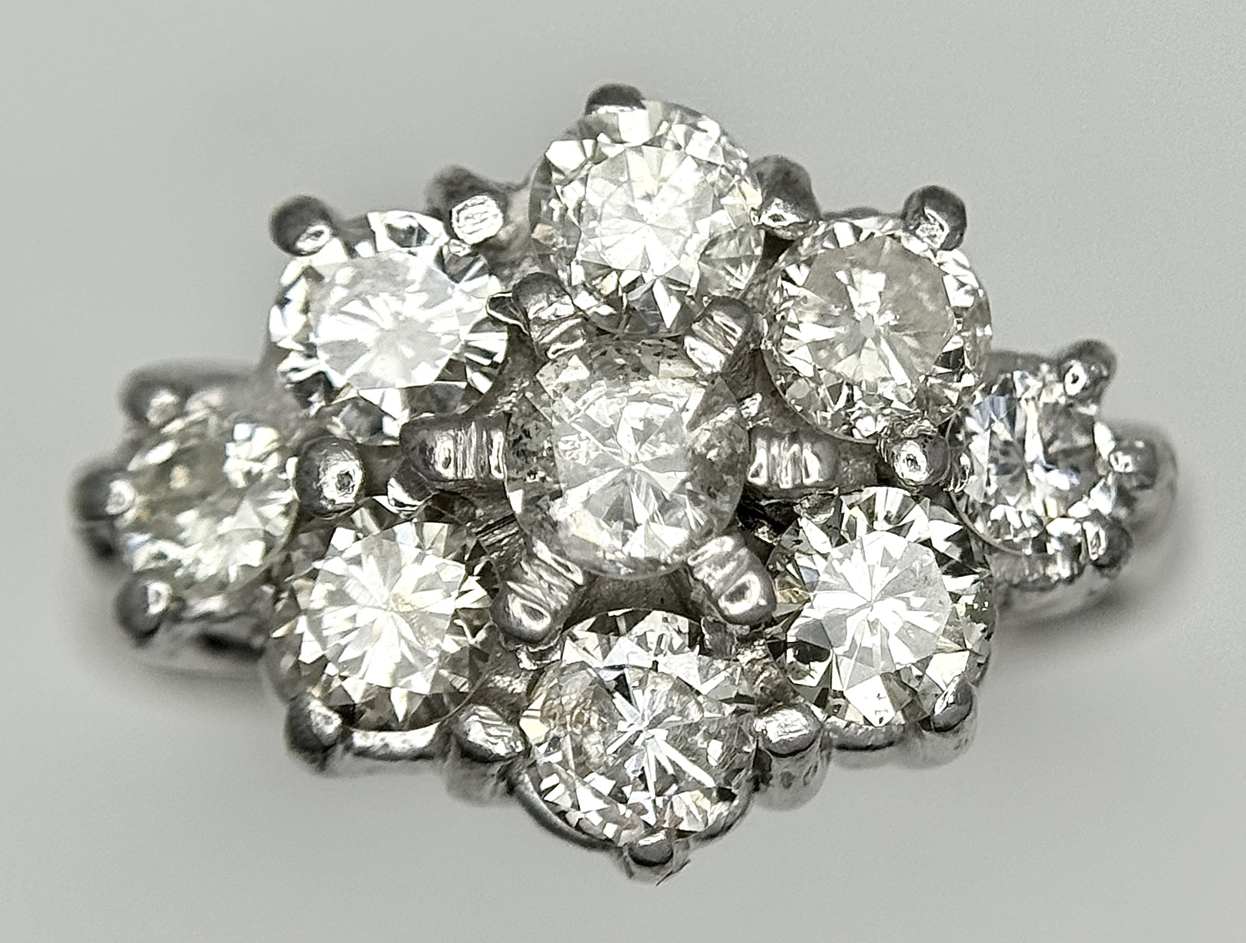 AN 18K WHITE GOLD DIAMOND SET CLUSTER RING. 1.20CTW. 5.8G. SIZE J. SPSA-3009.