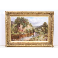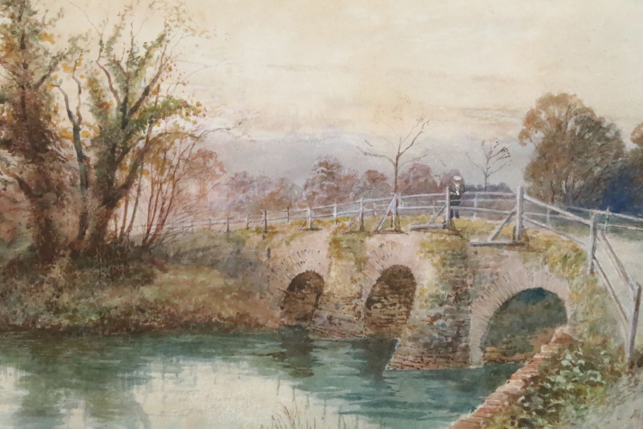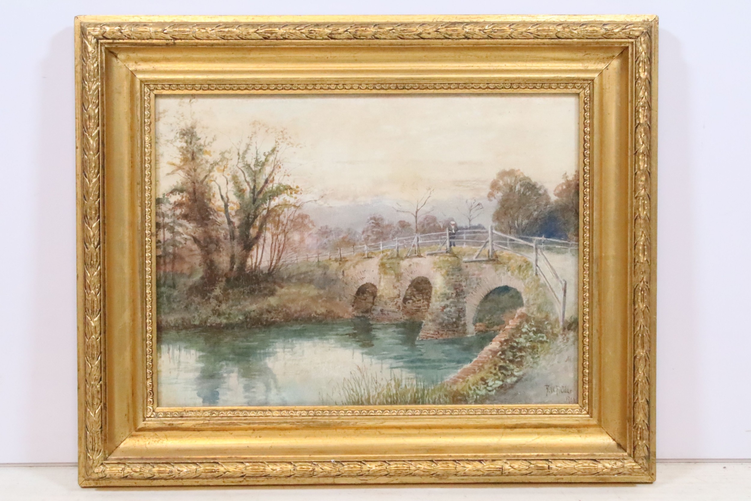 R W Fielder, bridge scene with figure, watercolour, signed lower right and dated 1901, 27 x 36.5cm, gilt framed and glazed
