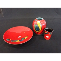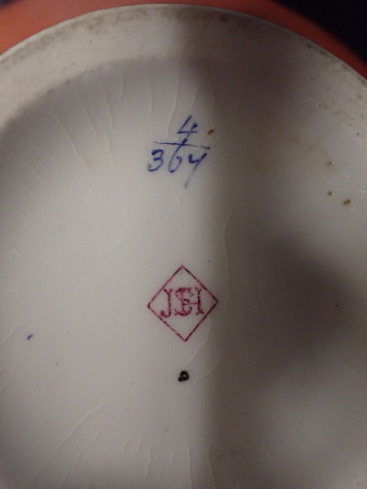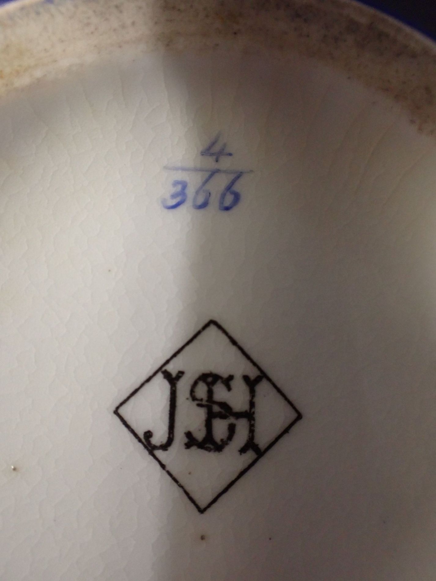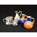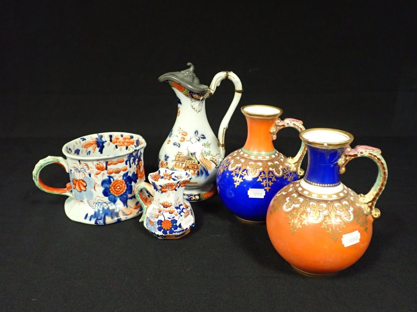 TWO SIMILAR 19TH CENTURY JSH PORCELAIN JUG decorated in the Imari palette with similar matching gilded leaf scroll designs, 19cm high (one damaged to neck), together with three items of similar colourway