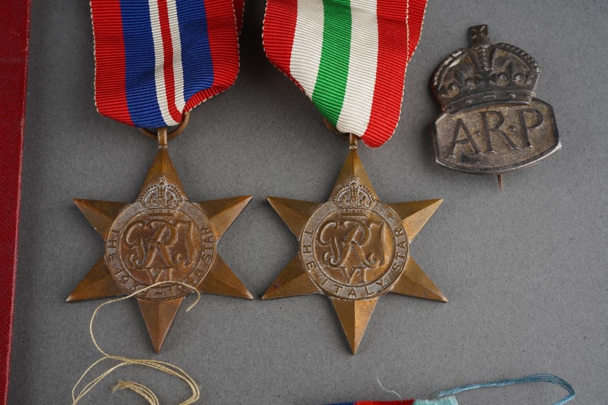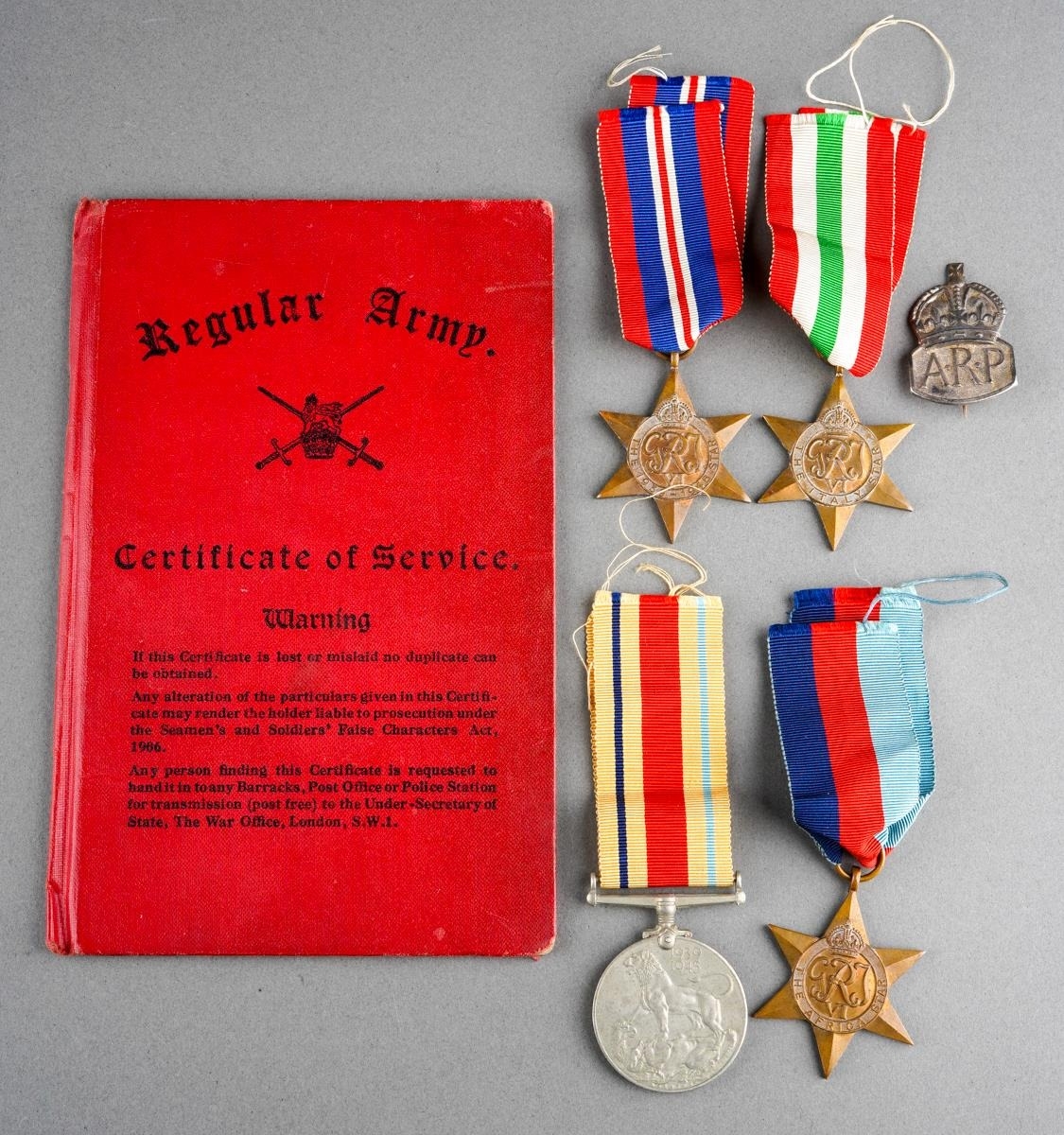 Sold with Regular Army certificate of service; A silver hallmarked ARP badge, possibly belonged to his father.