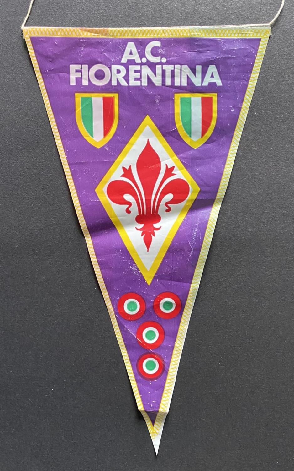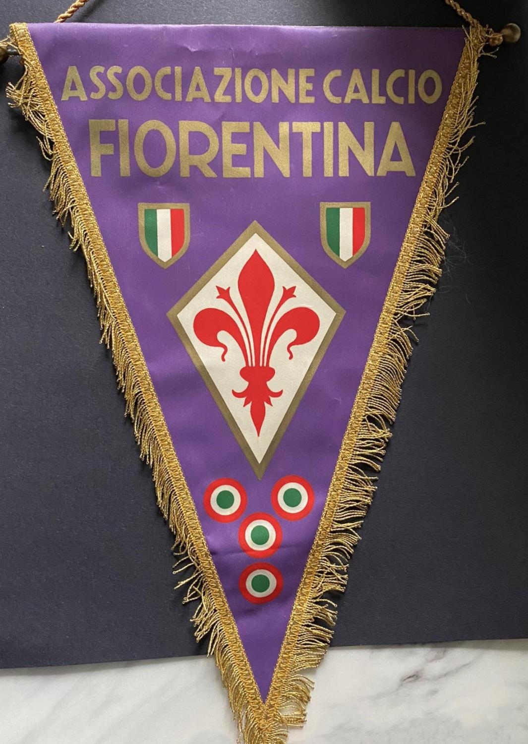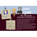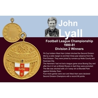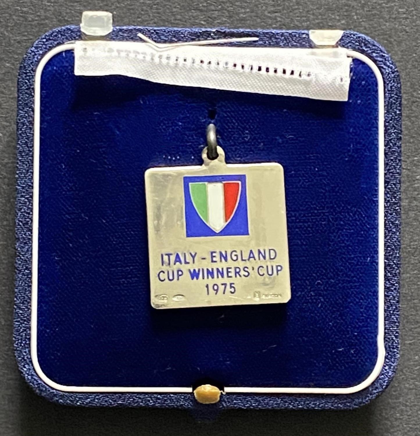 1975 West Ham Anglo Italian Cup Winners Cup Football Medal: Awarded to manager John Lyall. Silver medal in original box for playing Fiorentina. C/W a large pennant with gold braiding with the words Associazione Calcio Fiorentina, small plastic pennant and an enamel tie clip all given to John Lyall by opposing team. COA from the family.