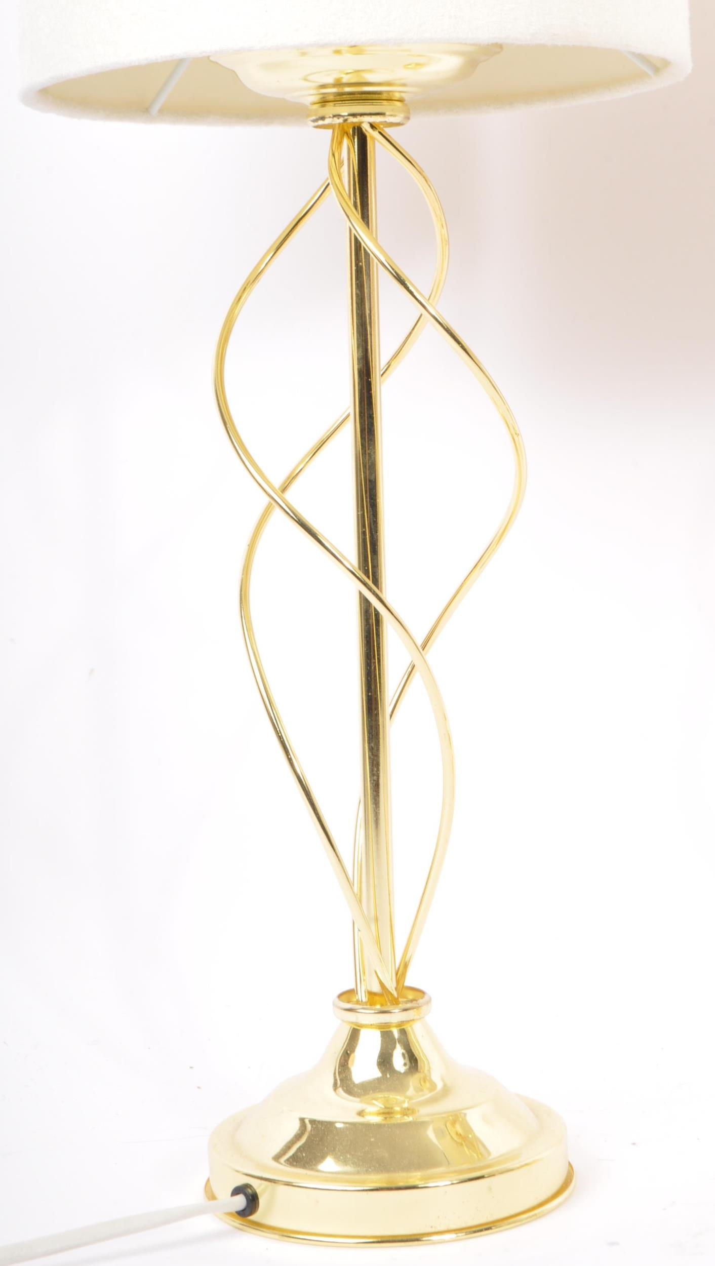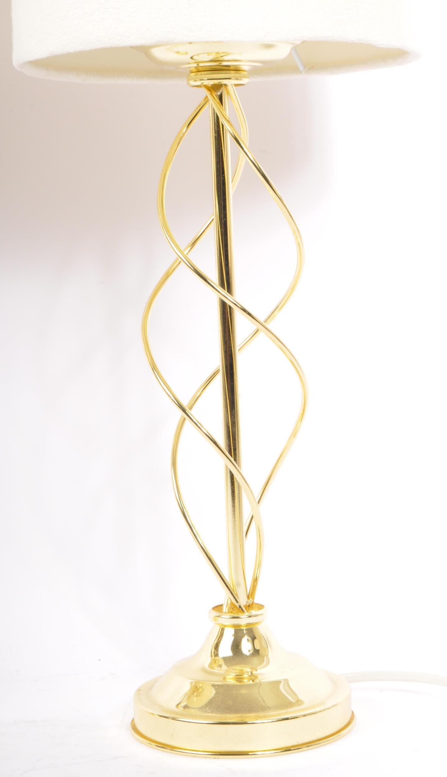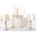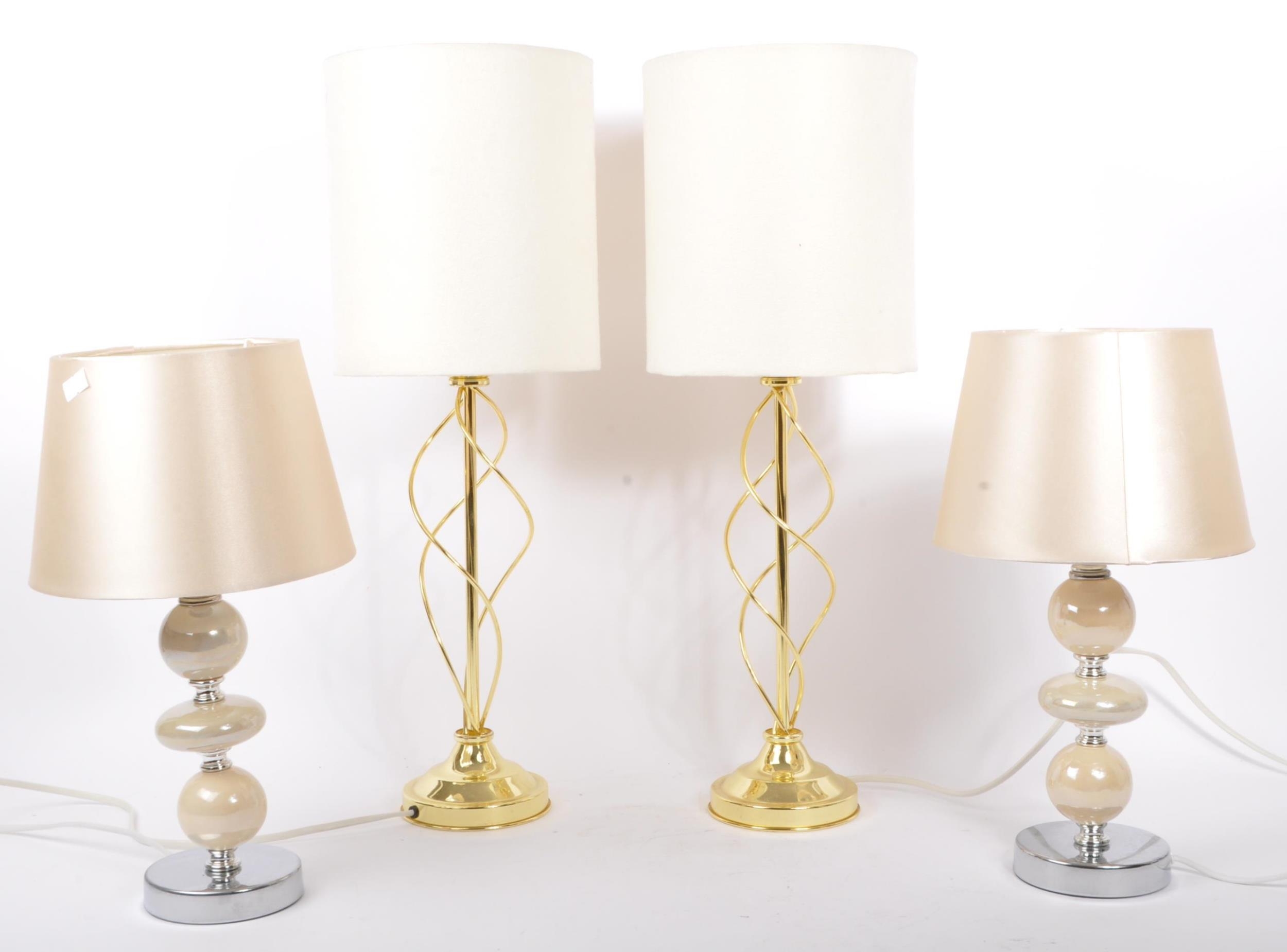 Two pairs of contemporary bedside / table lamps. One pair having brass effect helix decorations surrounding a central stem, alongside another pair of contemporary lamps. Largest measures approx. 54 cm tall.